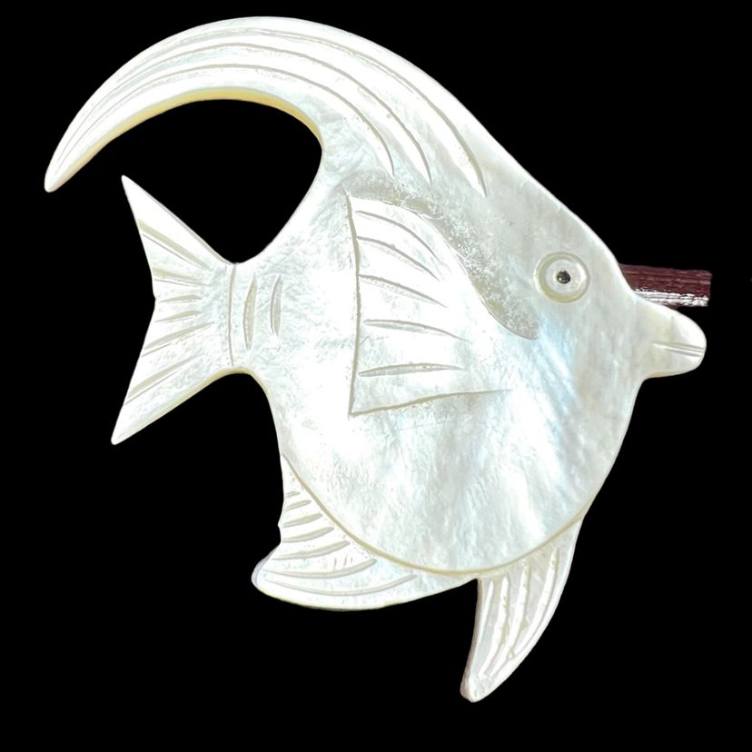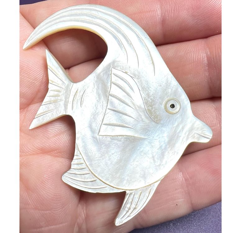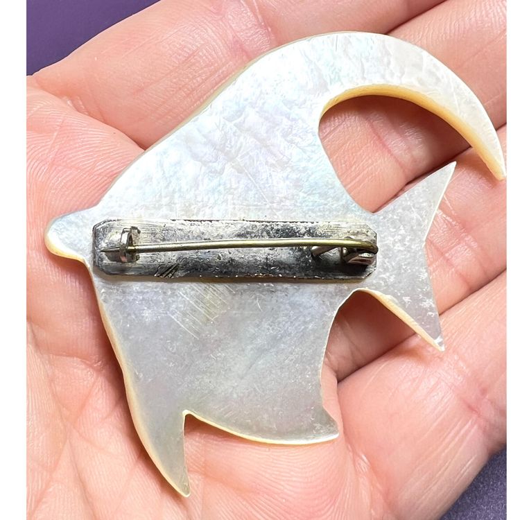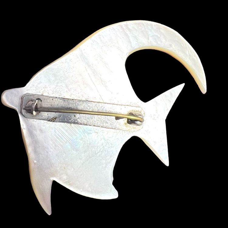 Beautiful mother of pearl fish design Perfect for adding a touch of elegance to your clothing Measures approximately 2-1/4” tall x 2" long Excellent condition, no issues Caution: The pin extends past the clasp and is very sharp