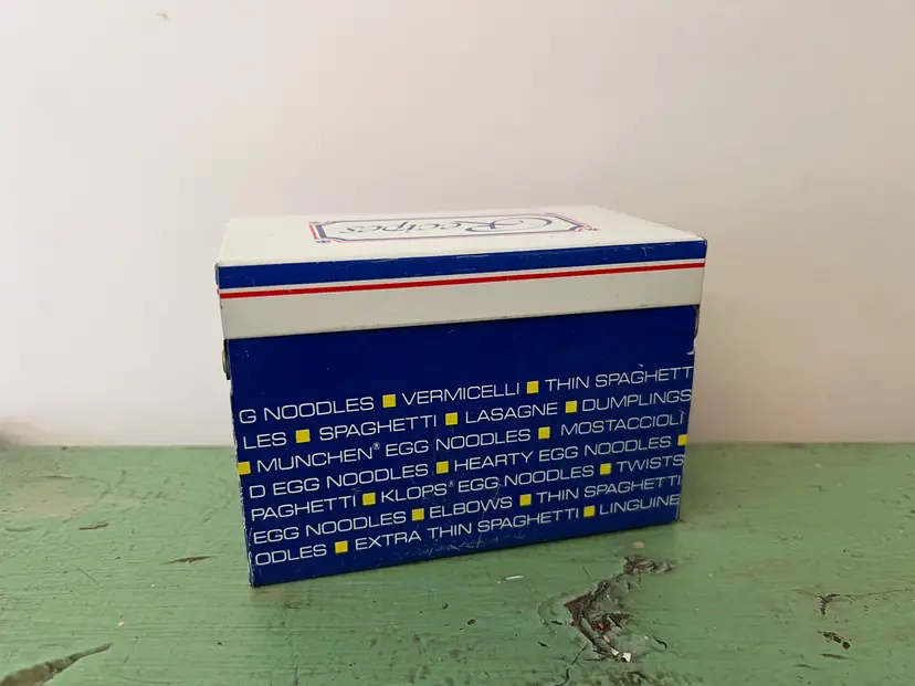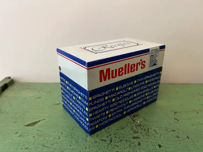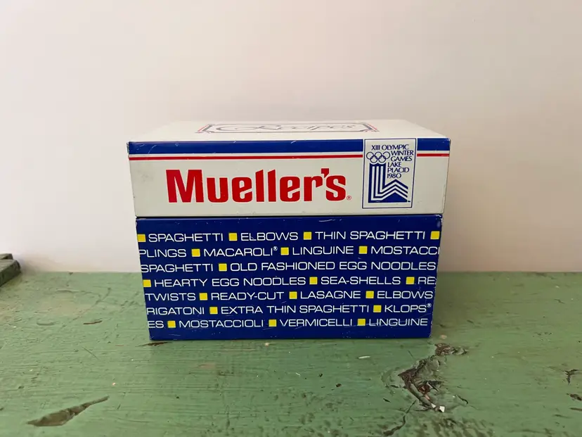 Vintage Mueller's Metal Recipe Card Box-1980 Olympic Winter Games-Kitchen Advertising Tin Approximately 3.5" tall. 5 1/8" across. 3" front to back Good Vintage used condition- Paint loss on bottom. A couple scratches on the box