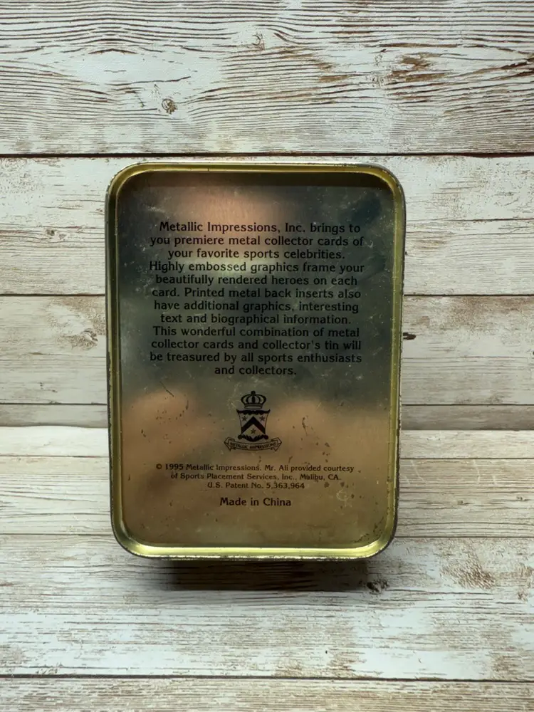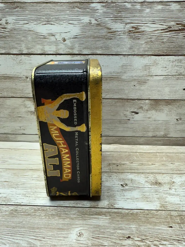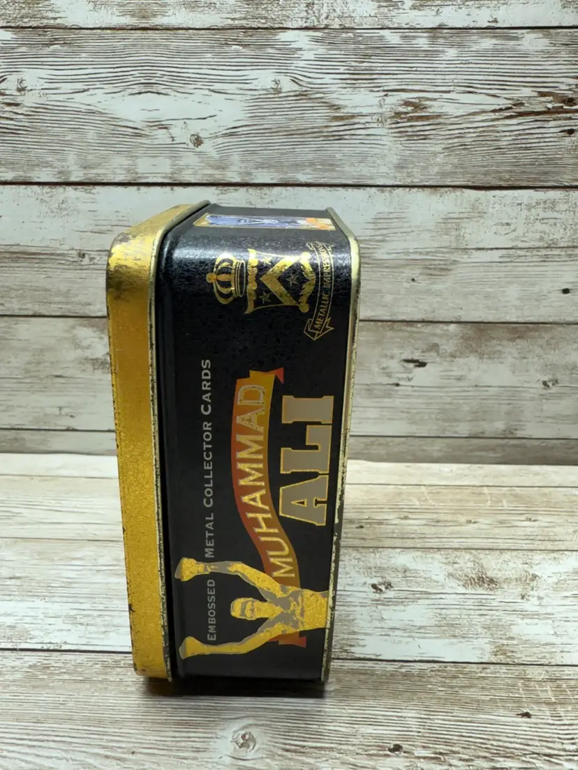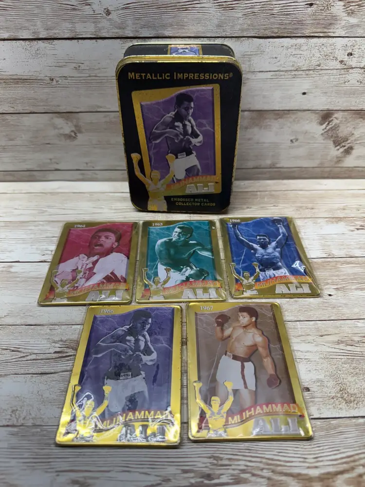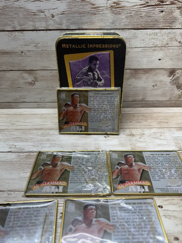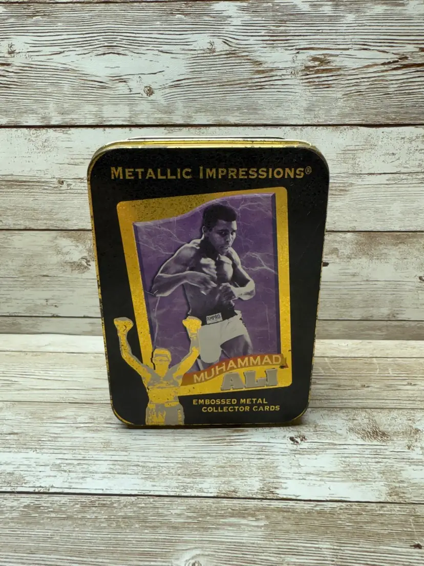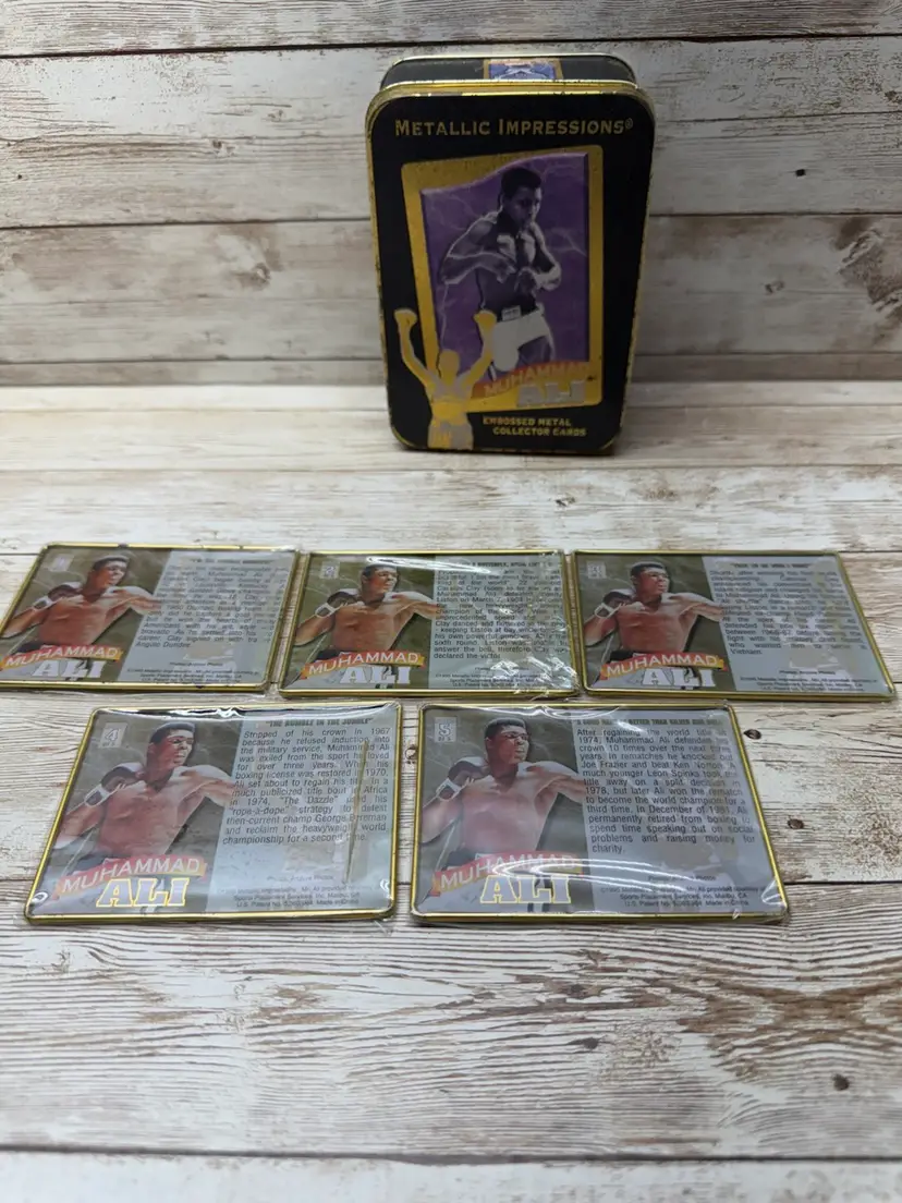 Key Features: • Complete Set: 5 embossed metal cards featuring Muhammad Ali’s career highlights. • Original Tin: Comes in the original collector’s tin for display and preservation. • Manufacturer: Metallic Impressions, 1995 release. • Condition: Cards and tin are in excellent condition with minimal signs of wear.