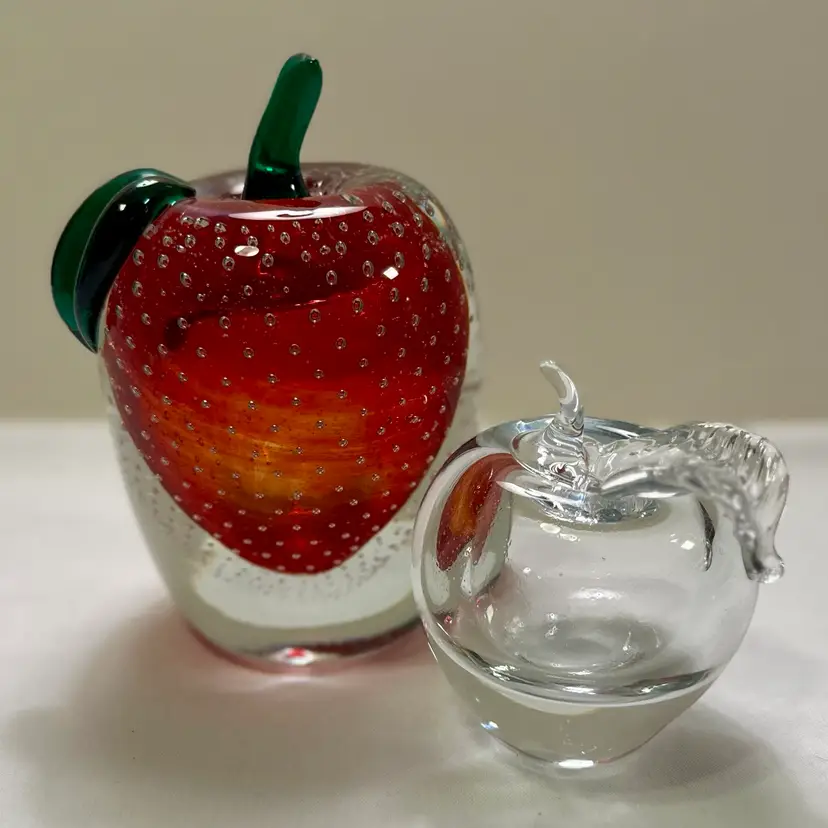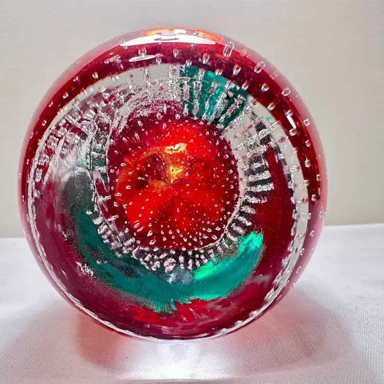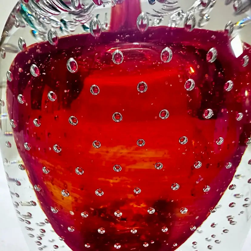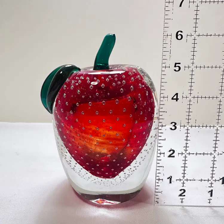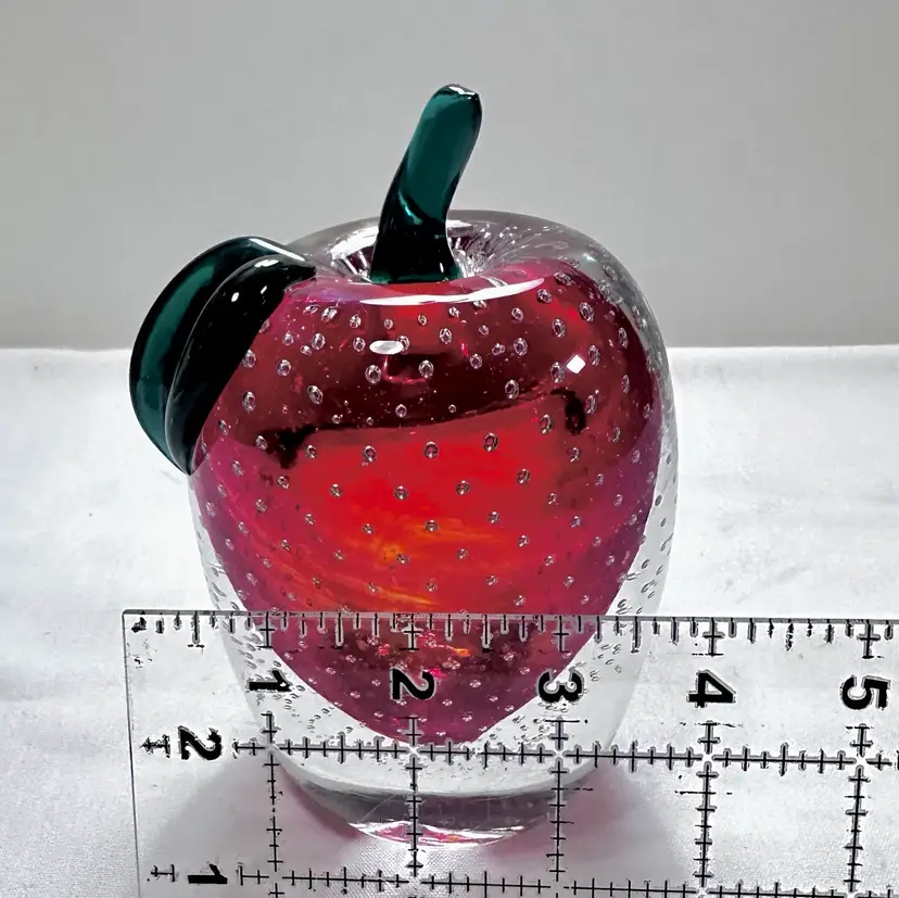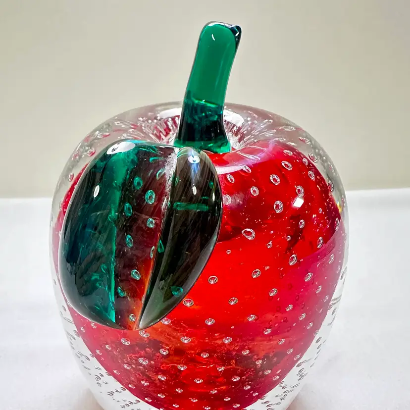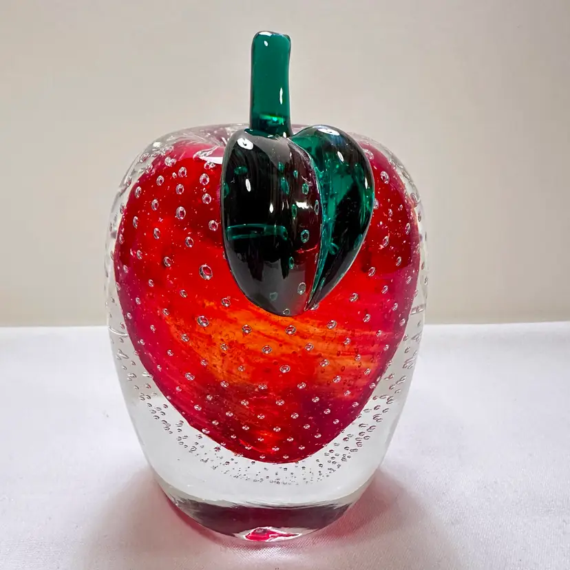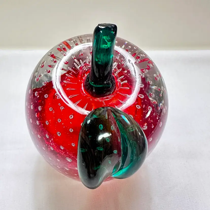 This listing is for this very Large vintage Murano art glass Apple. It is a heavy hand-blown glass apple paperweight featuring an internal red core with controlled bubbles and an applied green glass leaf and stem.
