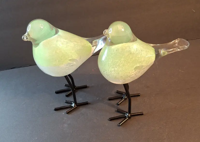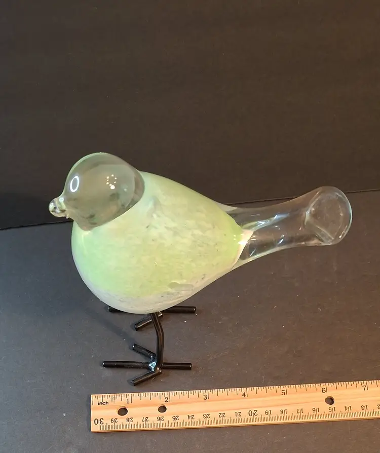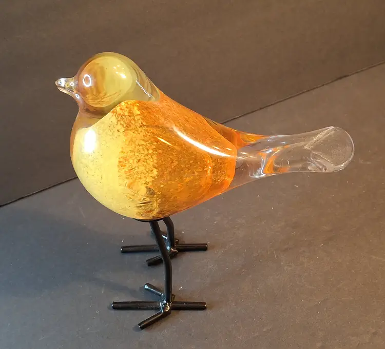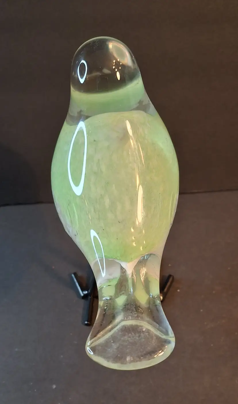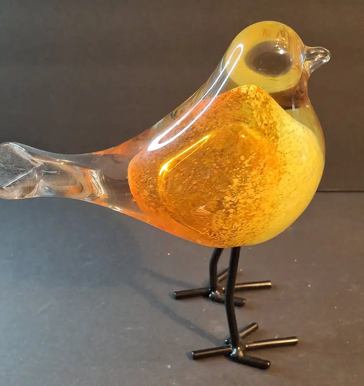 This vintage Murano glass figurine is a rare find for collectors of mid-century modern decor. The beautifully crafted piece features a lime green or an orange/yellow bird perched on wire legs and is made of high-quality glass materials.
