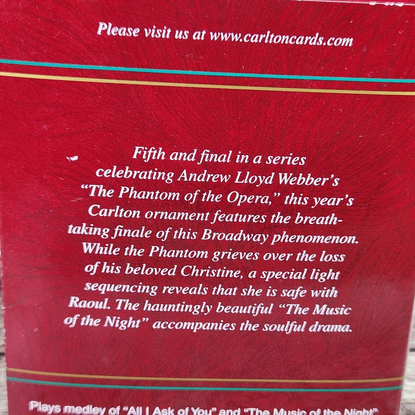 Working light up 2003 Phantom of the Opera ornament by Carlton Cards, #5 in the series. This plays the signature song from the show, "The Music of the Night". Has been tested and works. Runs on three AAA batteries. Comes with original box and inserts. Lighting changes color depending on the character singing. I have other musical ornaments listed so please check my other listings.