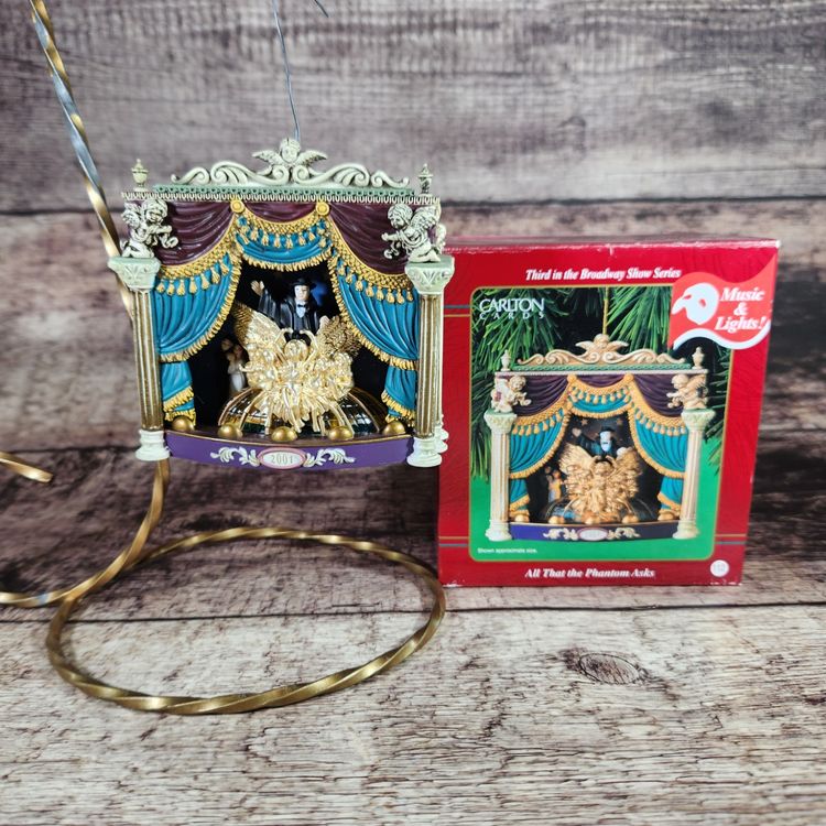 Working light up 2001 Phantom of the Opera ornament by Carlton Cards. This plays the signature song from the show, "All I Ask of You". Has been tested and works. Runs on 3 AAA batteries. Comes with original box and inserts. Lighting changes color depending on the character singing. This is number 3 in the series. I have other musical ornaments listed so please check my other listings.