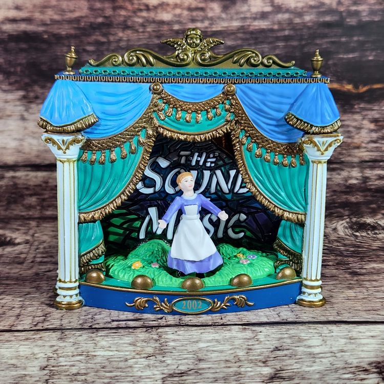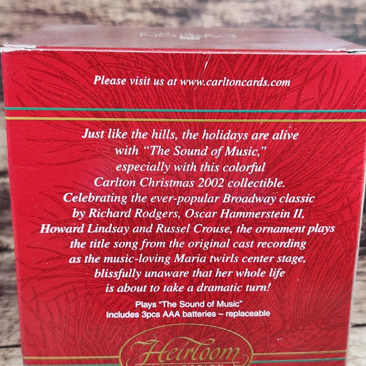Working light up 2002 Sound of Music ornament by Carlton Cards. This plays the signature song from the show, "The Hills Are Alive/Sound of Music". Has been tested and works. Runs on 3 AAA batteries. Comes with original box and inserts. In addition to lights and music there is a gear on the back that allows you to spin Maria mechanically. I have other musical ornaments listed so please check my other listings.