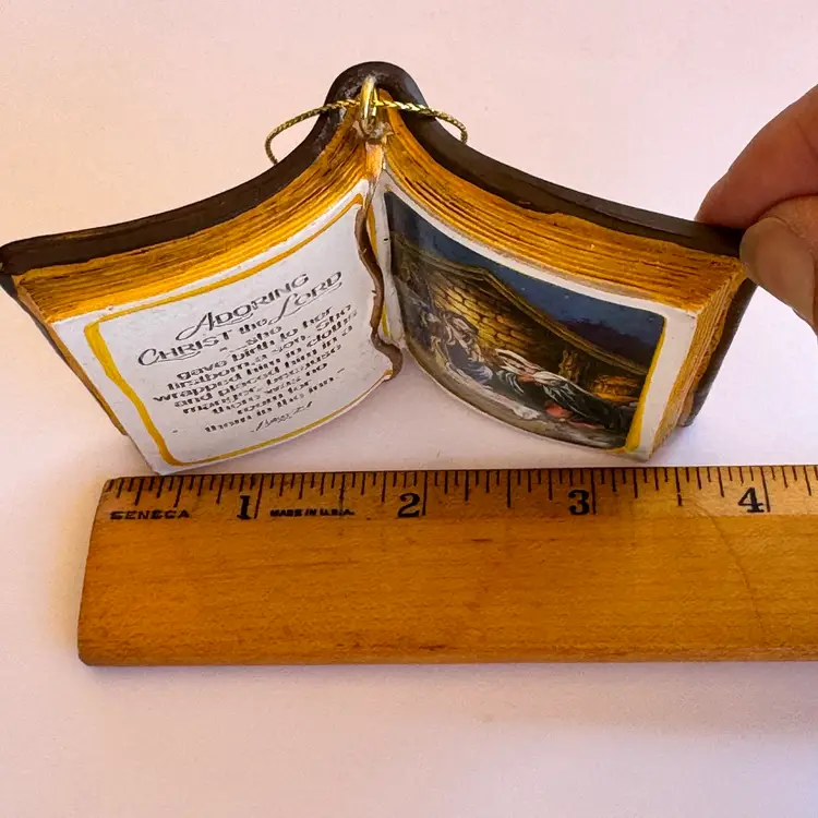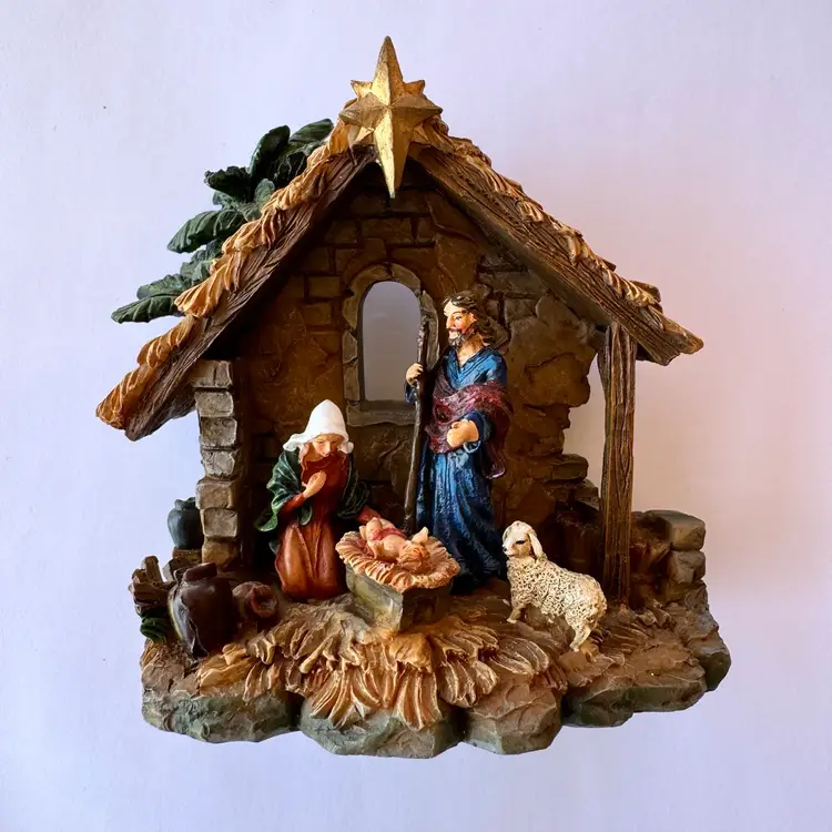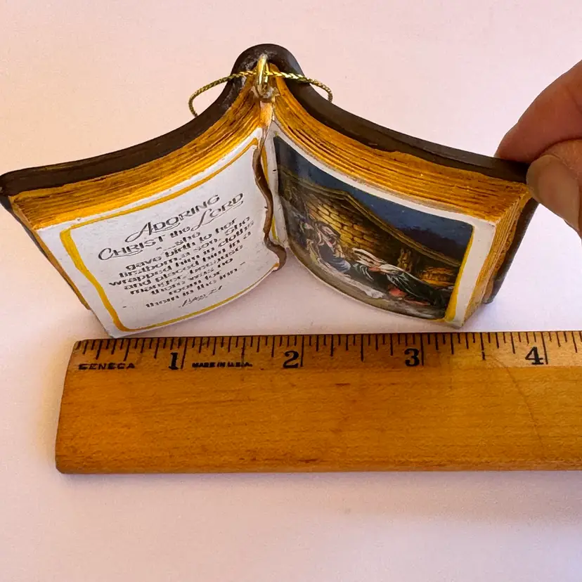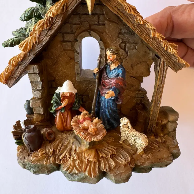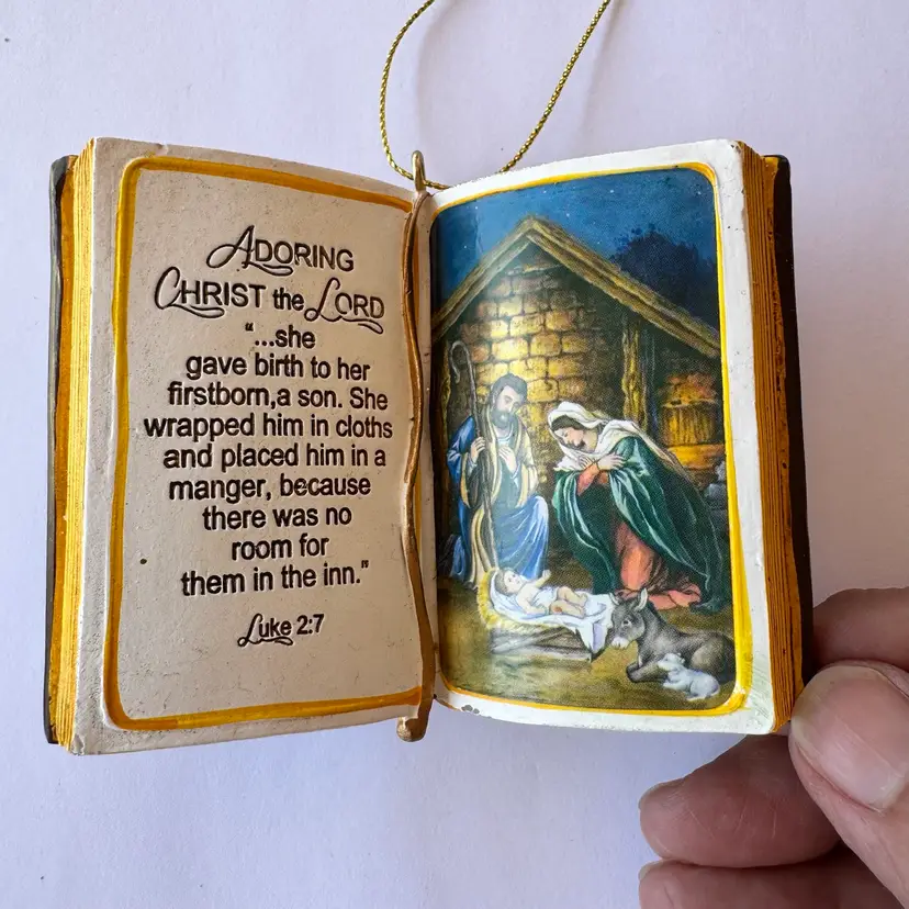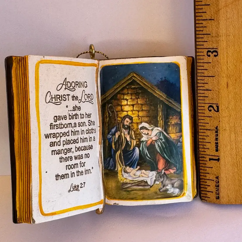 This listing includes a beautifully detailed nativity scene figurine, featuring Mary, Joseph, Baby Jesus, and a sheep in a rustic stable with a gold star and palm trees. Includes a miniature "Holy Bible" ornament that opens to a verse from Luke 2:7, and a nativity illustration inside, perfect for display or holiday decoration. The Bible ornament has a gold-hued cord for easy hanging.