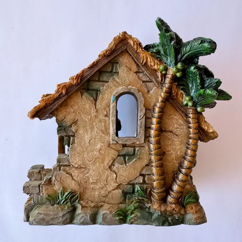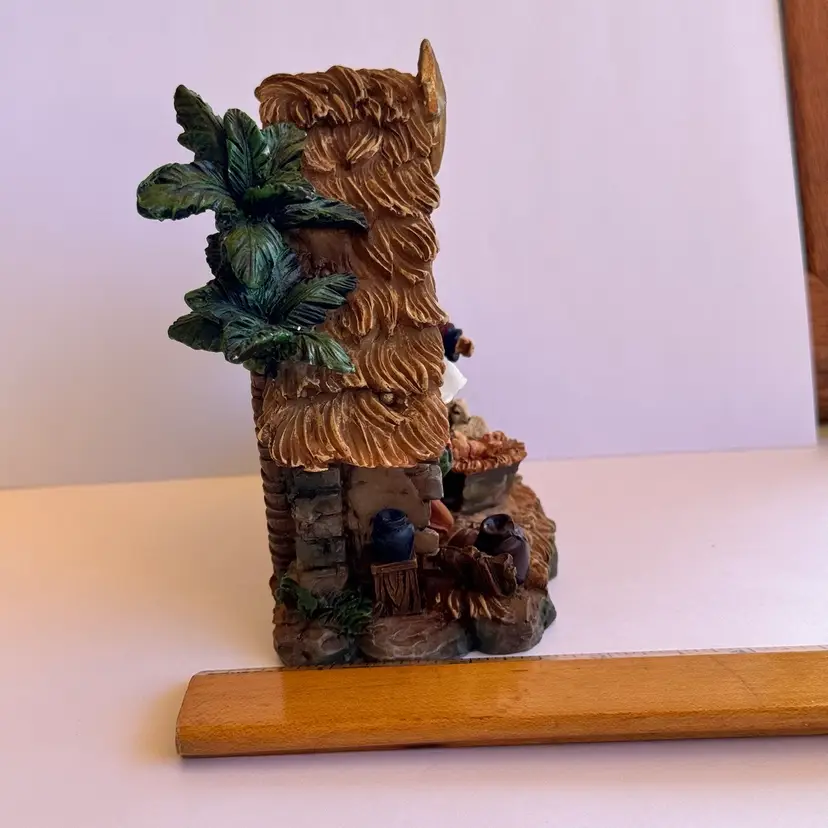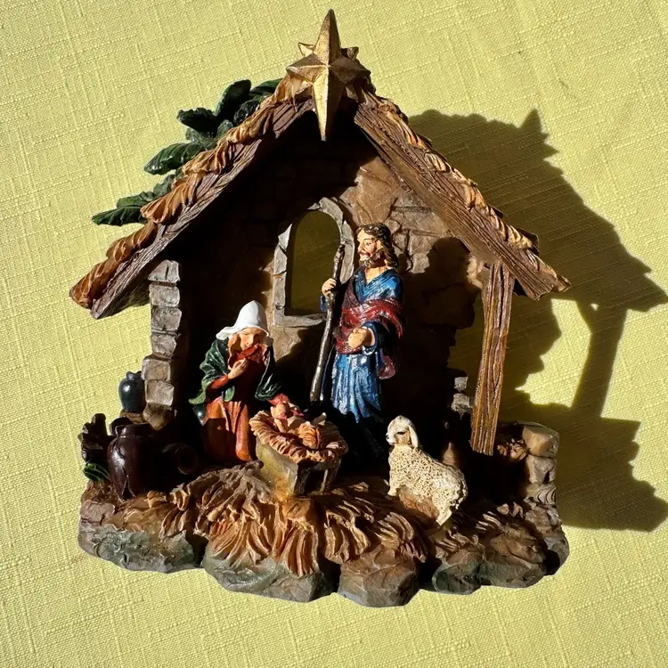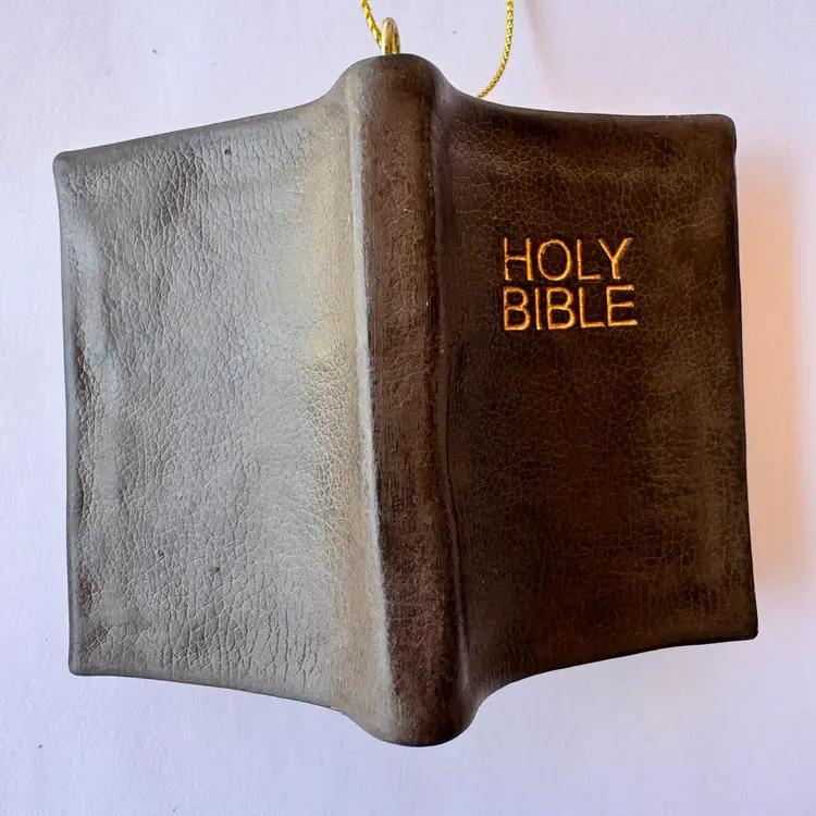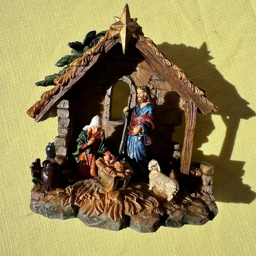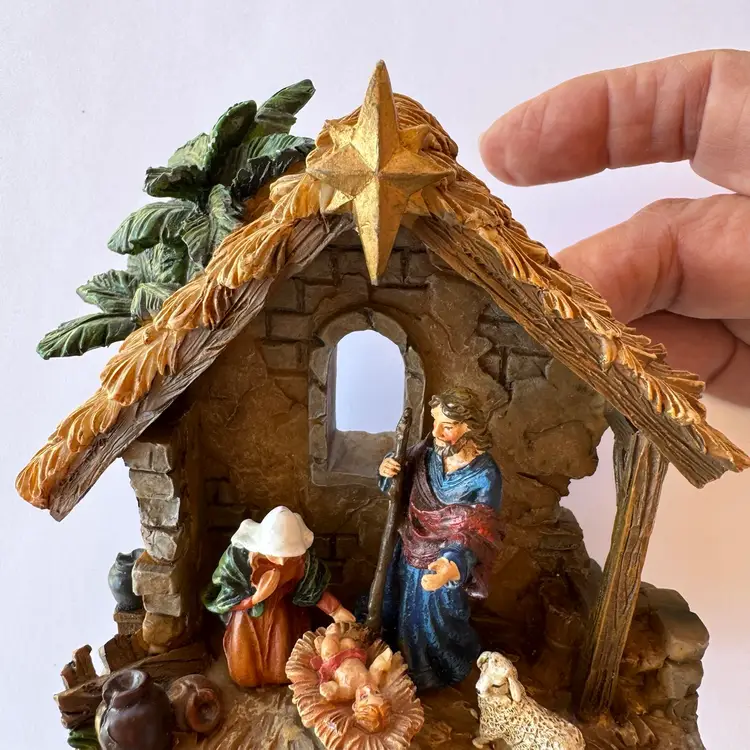 This listing includes a beautifully detailed nativity scene figurine, featuring Mary, Joseph, Baby Jesus, and a sheep in a rustic stable with a gold star and palm trees. Includes a miniature "Holy Bible" ornament that opens to a verse from Luke 2:7, and a nativity illustration inside, perfect for display or holiday decoration. The Bible ornament has a gold-hued cord for easy hanging.