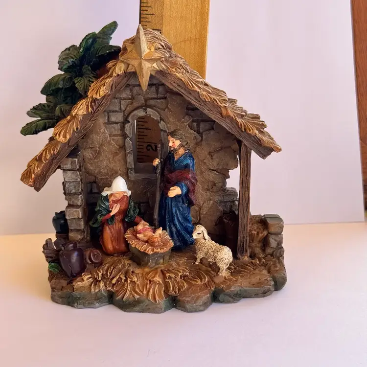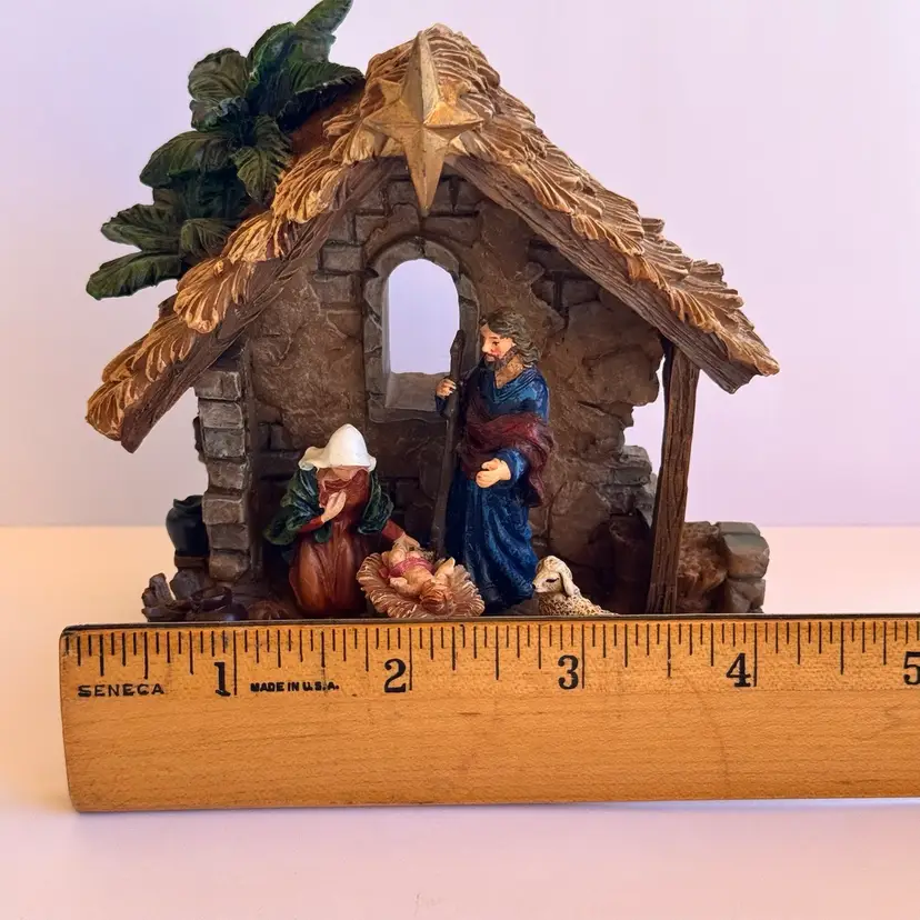The nativity scene stands approximately 4.25 inches tall and is about 4.25 inches wide at the base, as shown with ruler for reference. Crafted from painted resin or similar durable material.