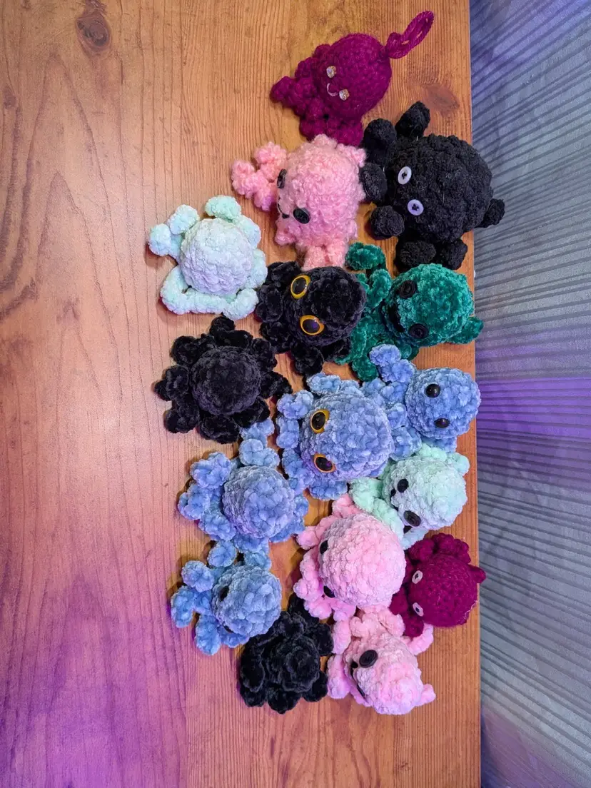 This listing is for ONE mystery baby octopus. The octopus you receive will be similar in size, style, and overall design to the examples shown, but may vary in color, expression, eye style, and tiny details. Some have eyes. Some don’t. Some look a little surprised to be alive. All of them are unmistakably octopus.
