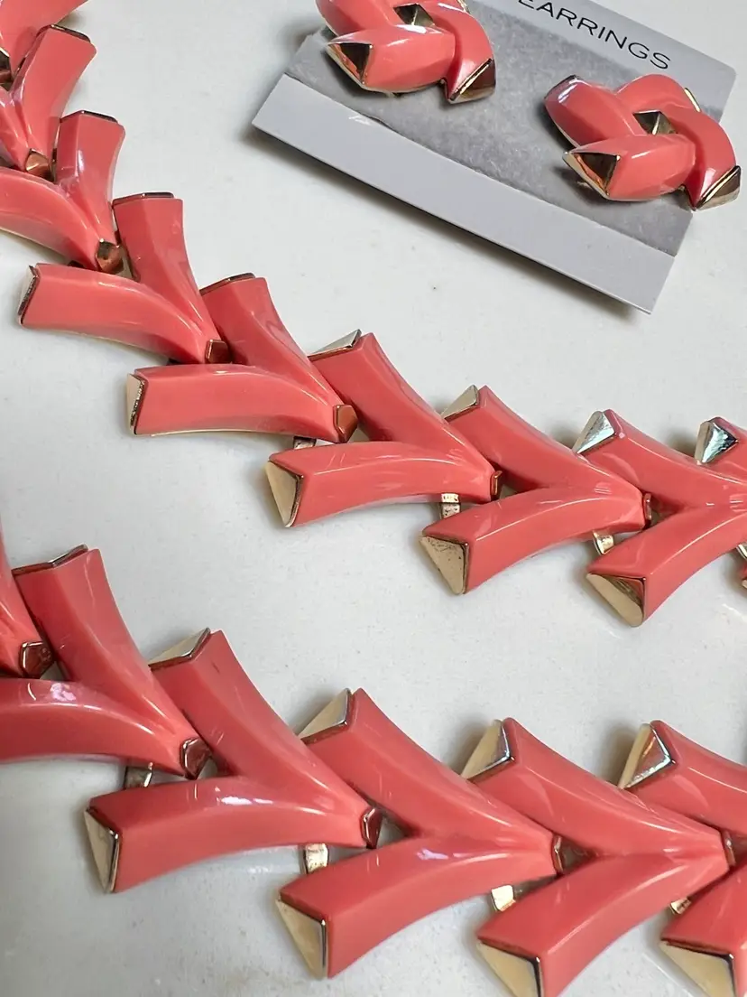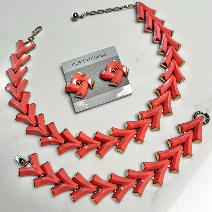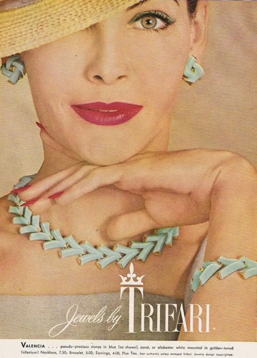 Trifari Valencia is a vintage jewelry collection introduced by Trifari in 1956, known for its use of gold-toned metal and colorful thermoset plastic or lucite accents, particularly in a chevron or geometric design. The collection often features turquoise, coral, pink, or white thermoset pieces set in gold-toned metal.