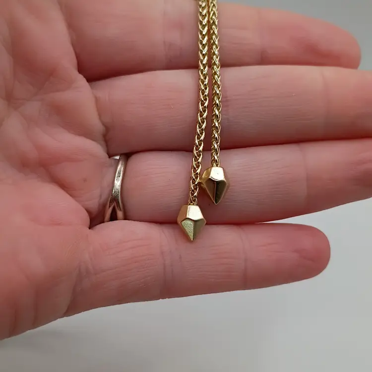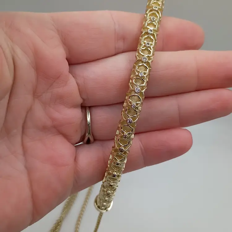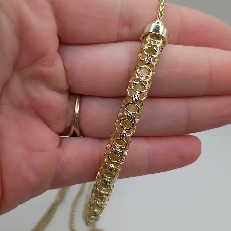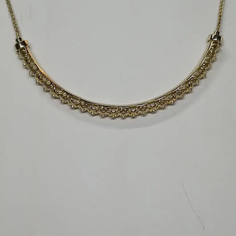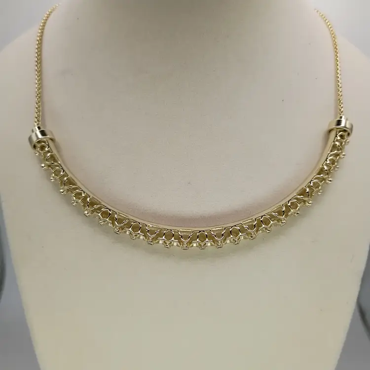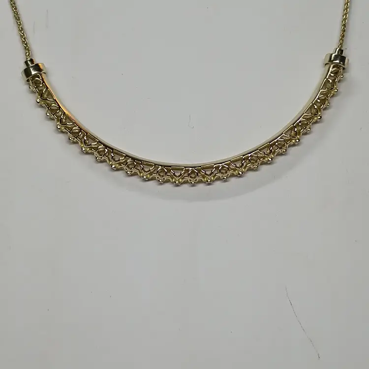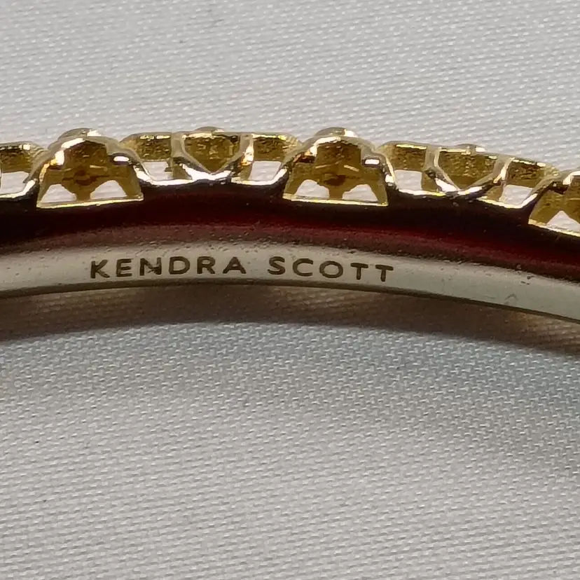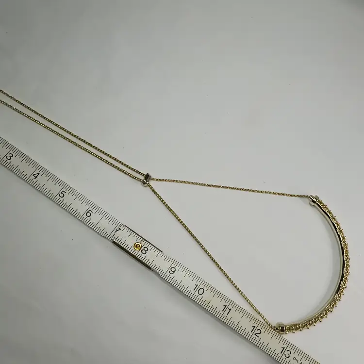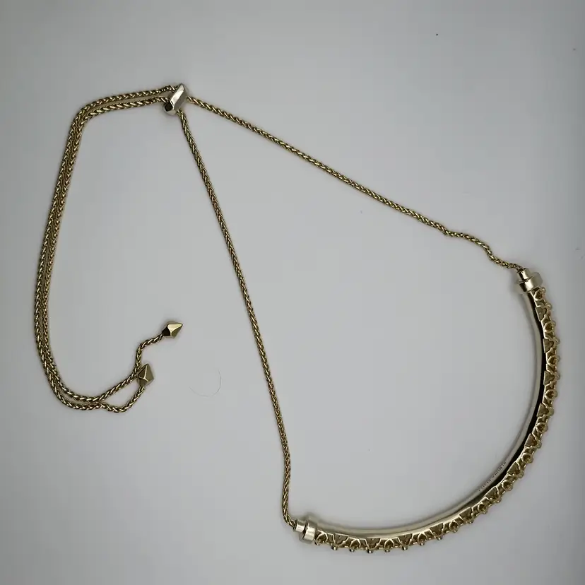 Beautiful Kendra Scott adjustable necklace featuring a curved bar pendant with open filigree detailing and sparkling crystal accents. The piece has a gold tone finish and an adjustable slider chain with geometric end caps, allowing for a custom length that fits comfortably with any neckline. Marked KENDRA SCOTT on the back of the pendant. In excellent pre-owned condition with minimal wear, bright shine, and working slider mechanism. Elegant and versatile—perfect for layering or everyday wear. Pictures are part of the description. Please feel free to reach out to me with any questions.
