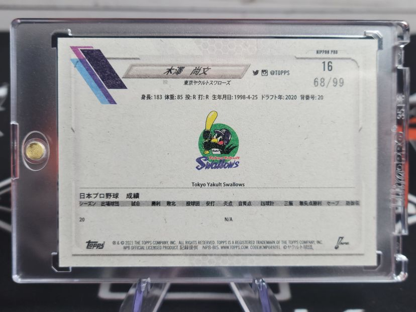 2021 Topps NPB Vintage Stock #16 featuring Naofumi Kizawa of the Tokyo Yakult Swallows, serial-numbered /99, from his rookie card release. This short-print parallel is a standout for Japanese baseball collectors and fans of the Swallows. Card is raw and ungraded, in near-mint to mint condition and has been well-preserved. Ideal for those chasing low-print parallels or rookie stock from NPB.