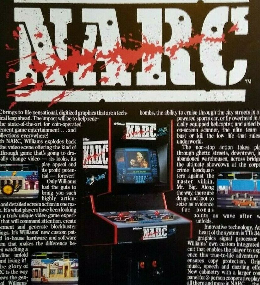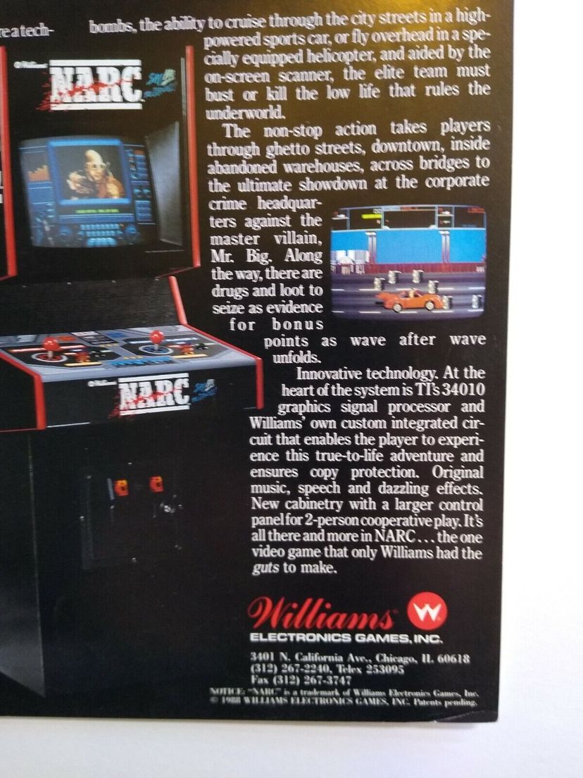 Material: Paper Arcade: Flyer Modified Item: No Country/Region of Manufacture: United States Original/Reproduction: Original Subject: Retro Gaming Theme: Crime Year: 1988 Game Title: Narc Brand: Williams