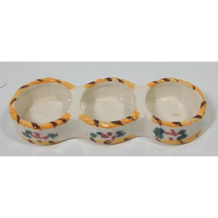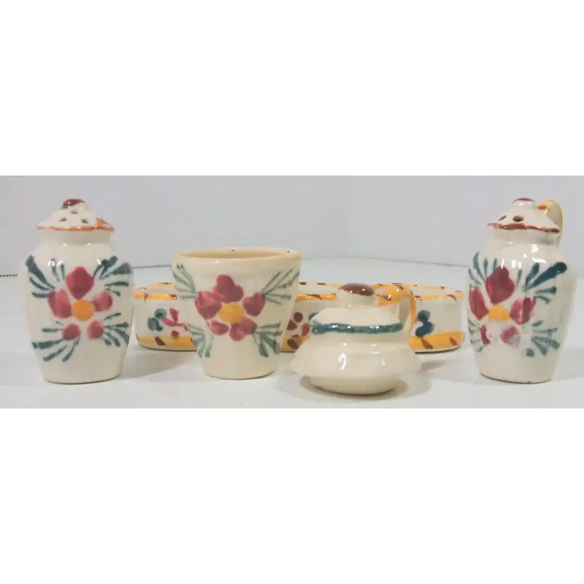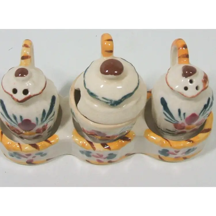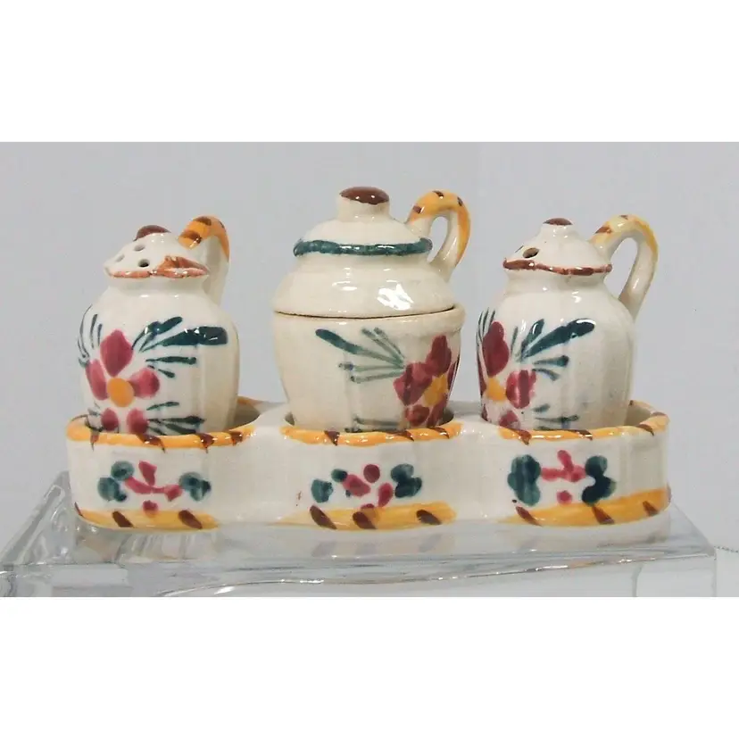This vintage NASCO ceramic pottery set includes a salt and pepper shaker and a small lidded bowl that could contained sugar or spice flakes. The 3 pieces sit in a decorative tray. The bowl lid has a small cutaway for the handle of a mini spoon. They are handpainted in a floral design. The salt and pepper shakers do not have stoppers. They are previously owned but are in great condition. They do not appear to have ever been used other than as a decorative piece. They have been kept in a smoke-free, pet-free and vape-free environment.