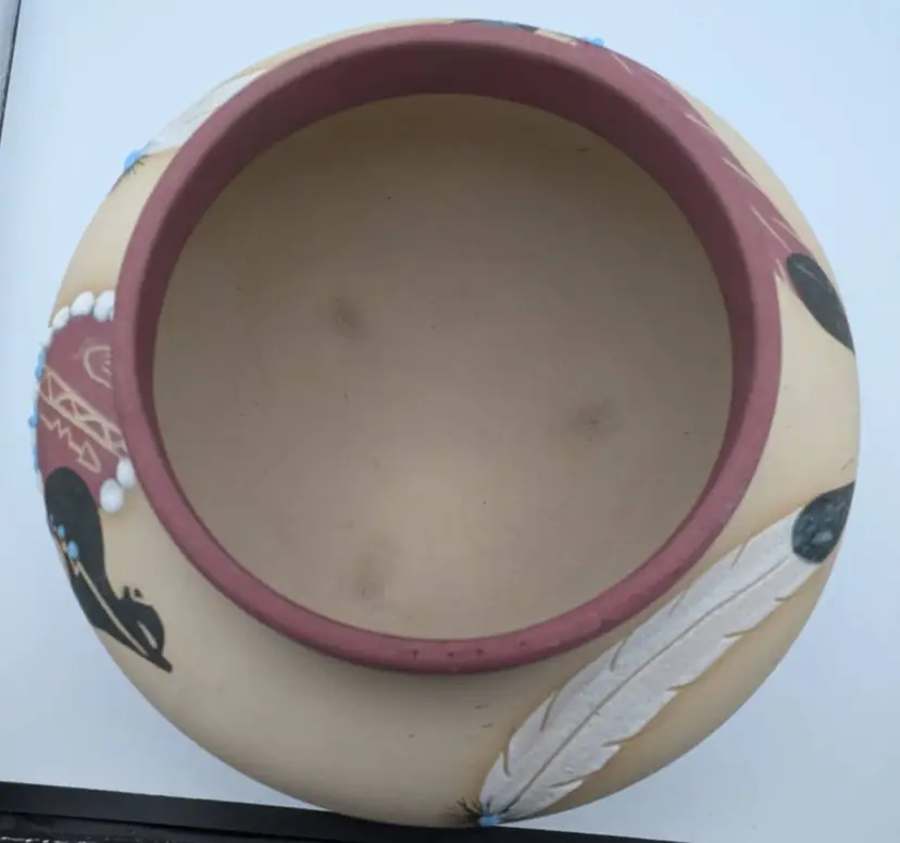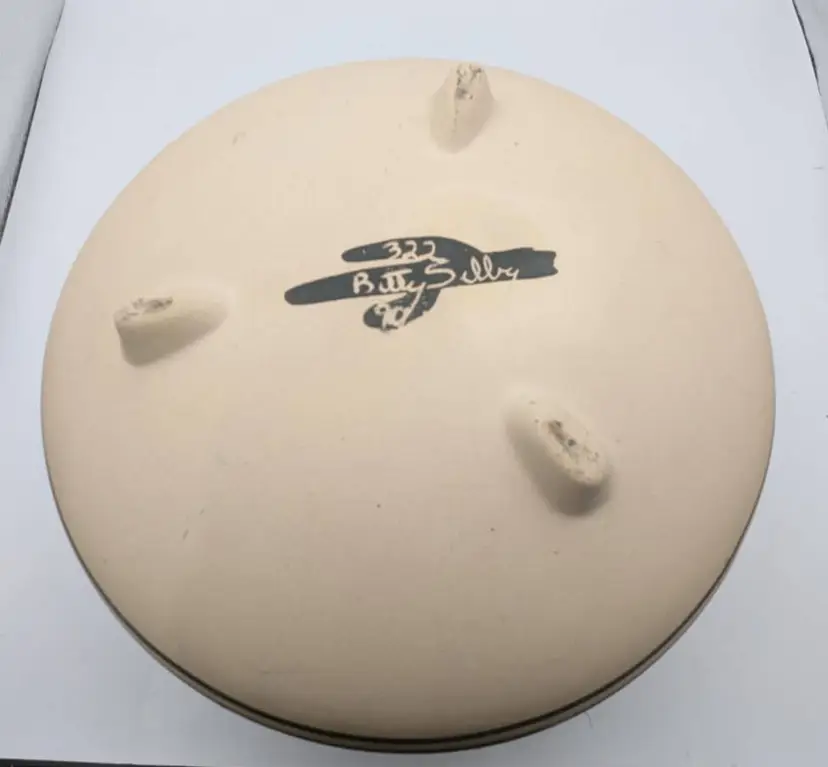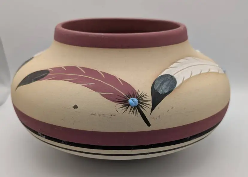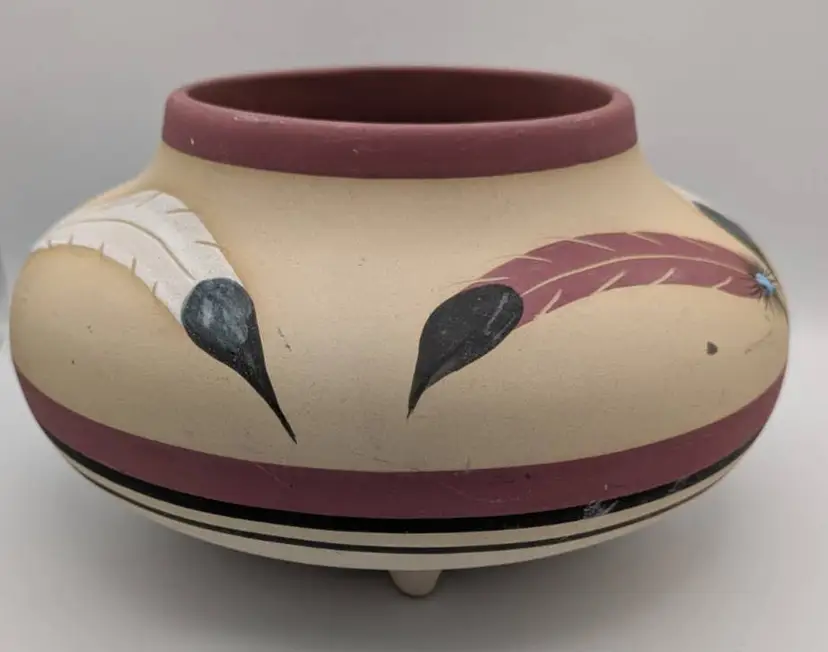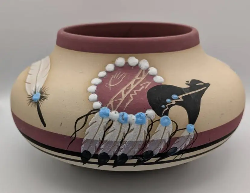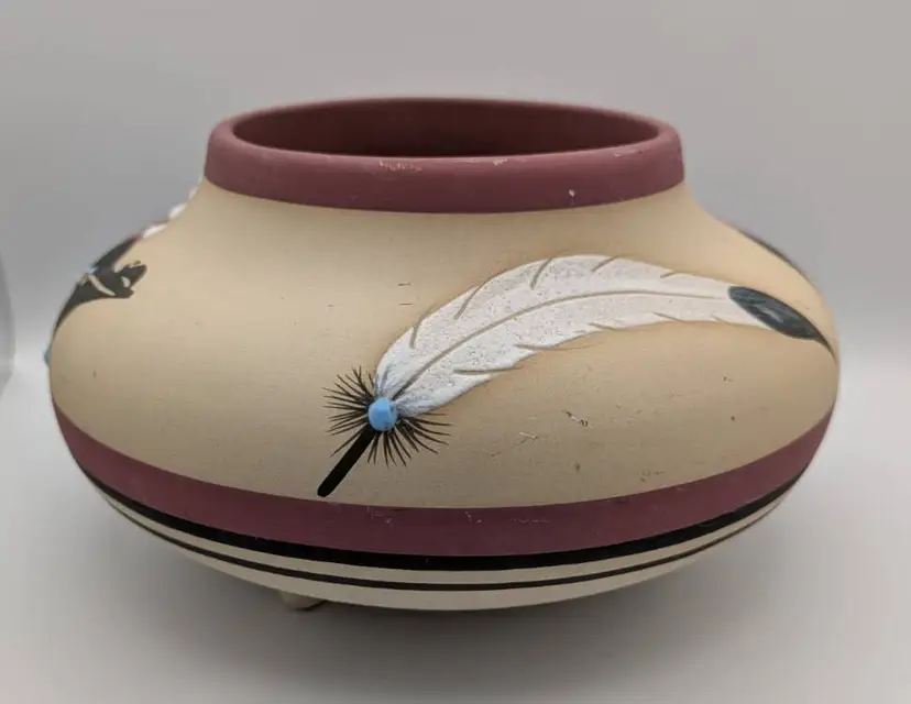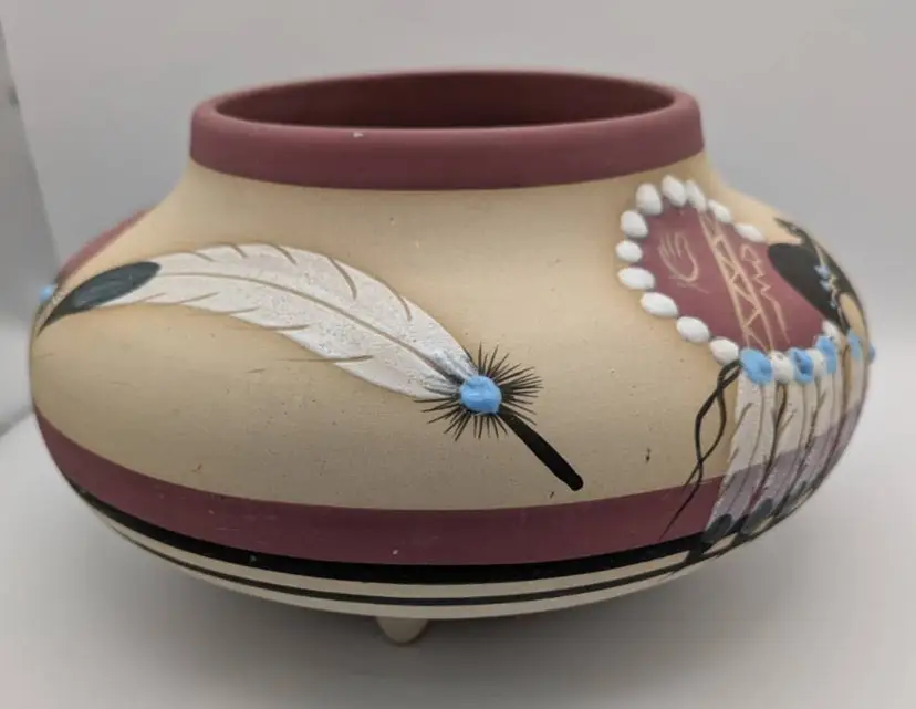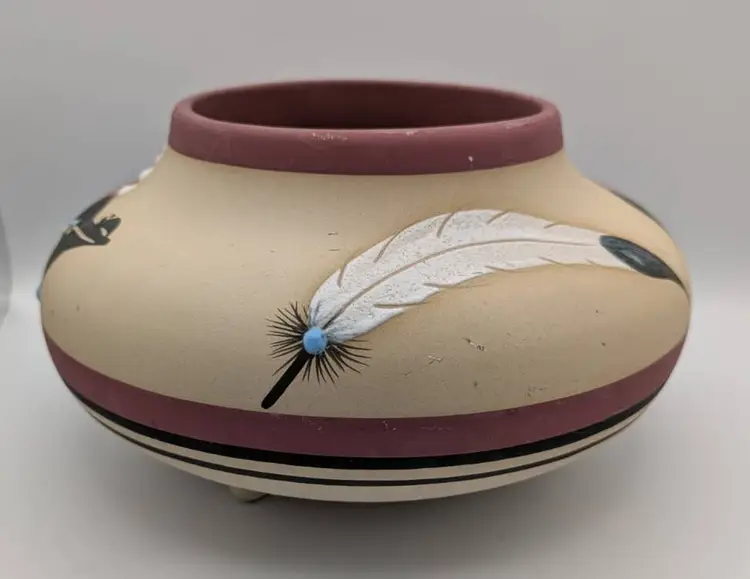 This is a wonderful piece of Native American Pottery by Betty Shelby. An artist from the Navajo Tribe. Each piece that is created is signed, numbered and dated. This piece is no exception. It is numbered #322 The date appears to be 1990, but I could be incorrect. The bowl/vase is beige with the earth red tone as accent. The images are of a bear, feathers, drum, and feathers It has 3 feet on bottom It is truly a beautiful piece. Measures: 9 inches wide, 5.5 inches tall, mouth opening is 4.5 inches.