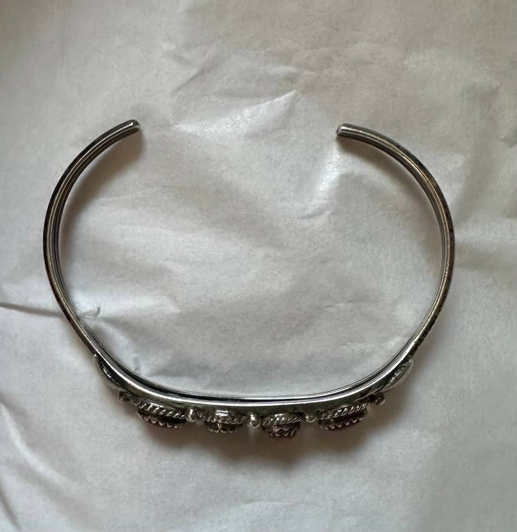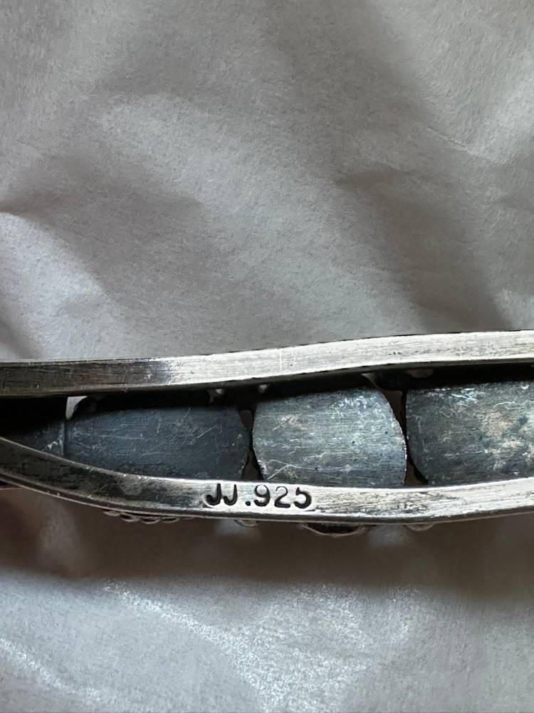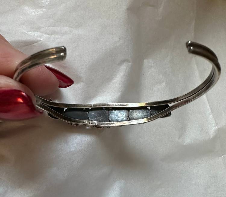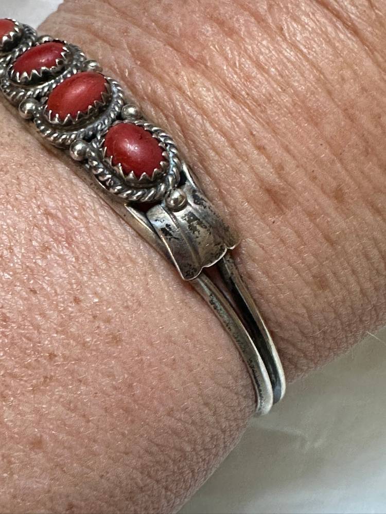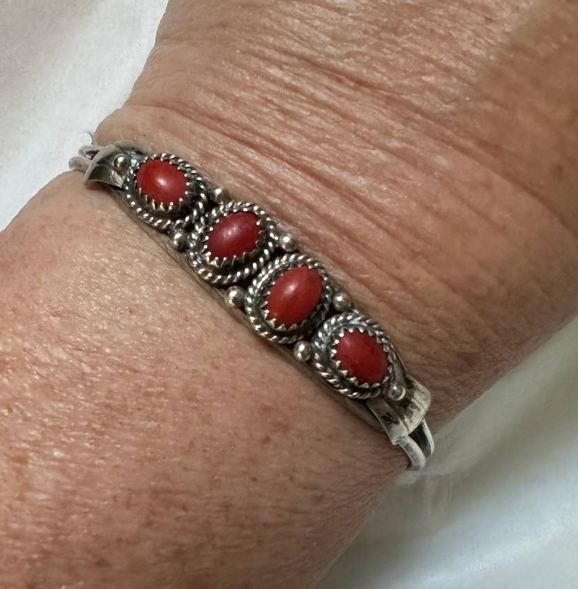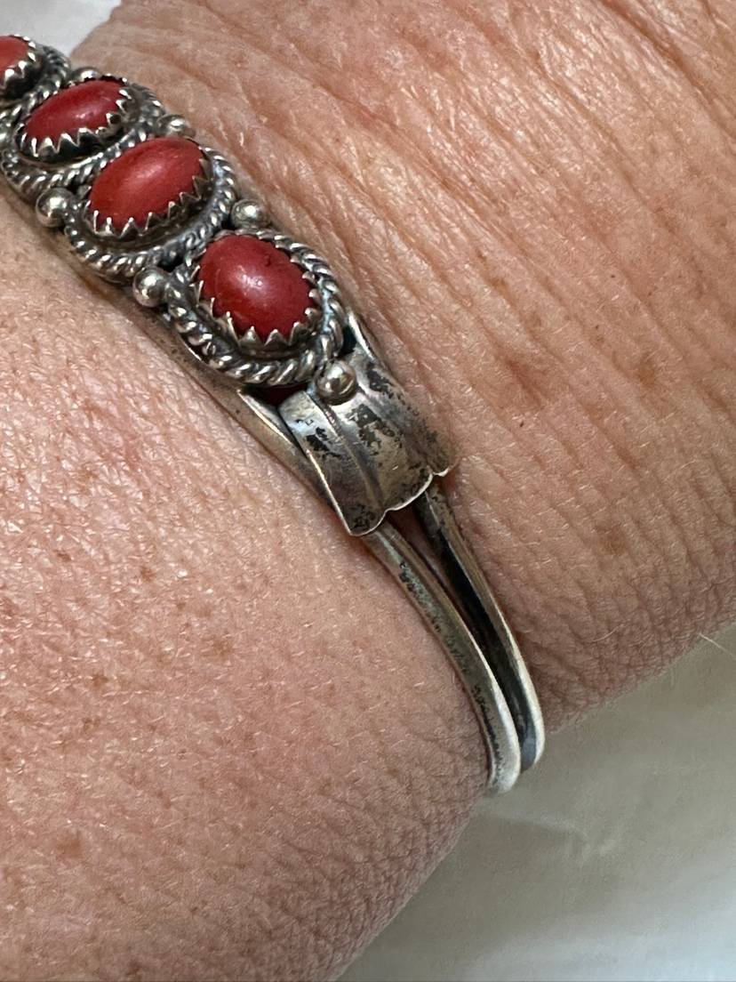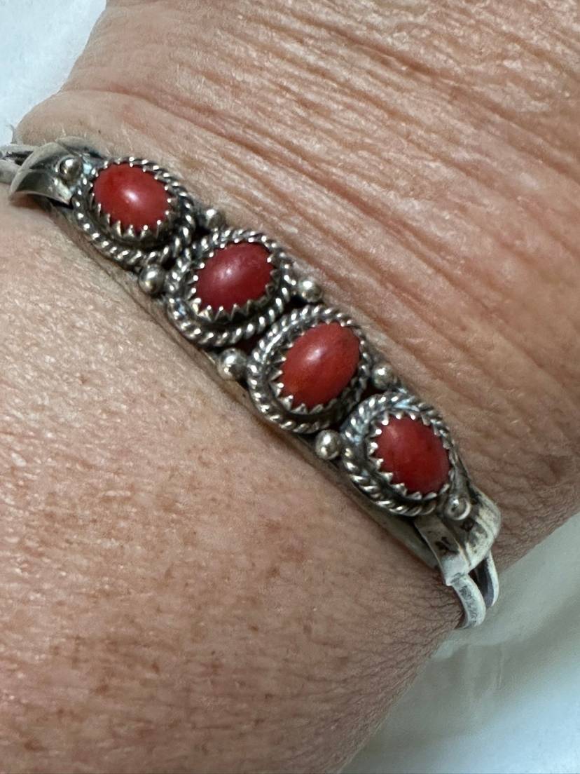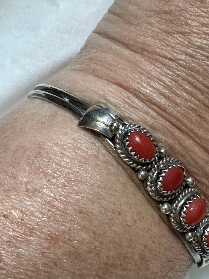 Great looking Native American cuff bracelet signed JJ 925. It is Sterling silver and set with coral. It is 3/8” at widest point and it is 5” + 1.25” gap inside round. It is in very good condition.