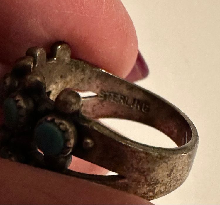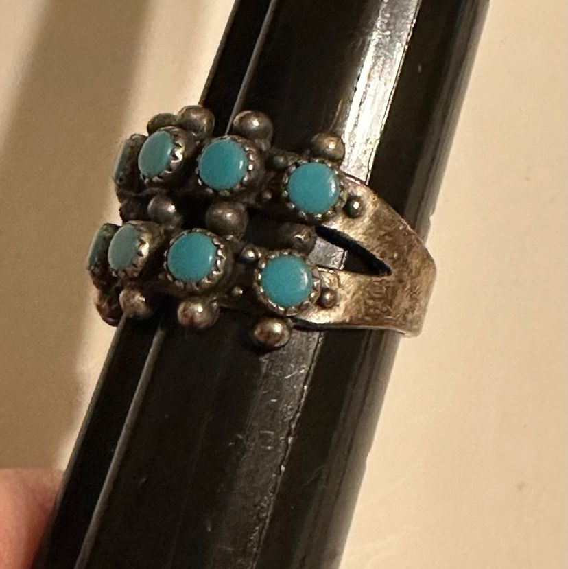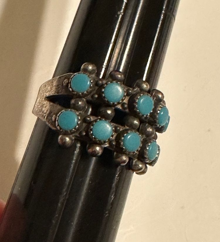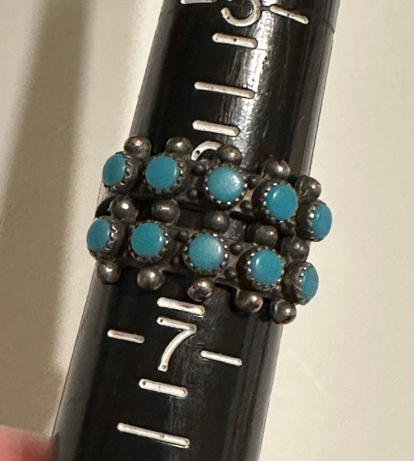 Native American Zuni Ring is sterling silver set with turquoise. It is size 6.25. Condition is very good.