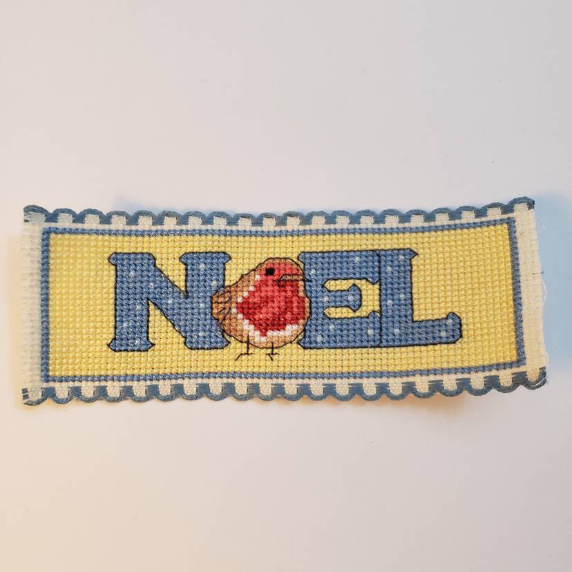 Cross-stitched "Noel" bookmark stitched on Ribband with blue trim 2"× 5 1/4".