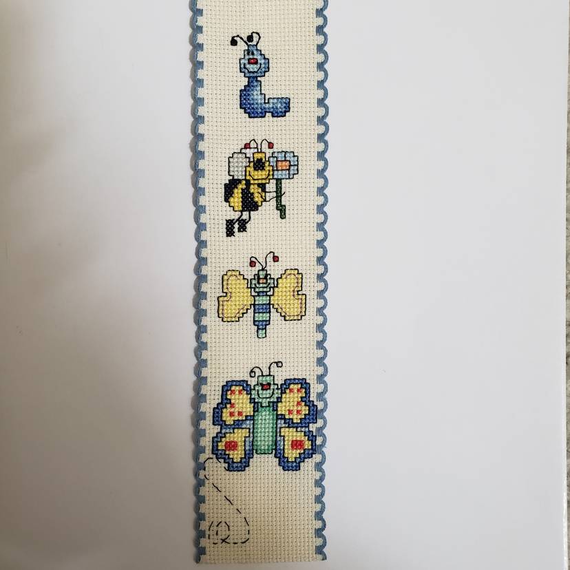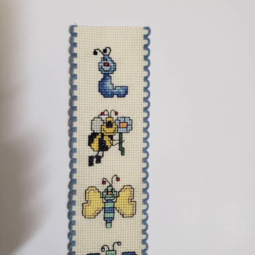 New cross-stitched bookmark 2"× 8 3/4". Book mark is stitched on ivory Ribband with blue trim.