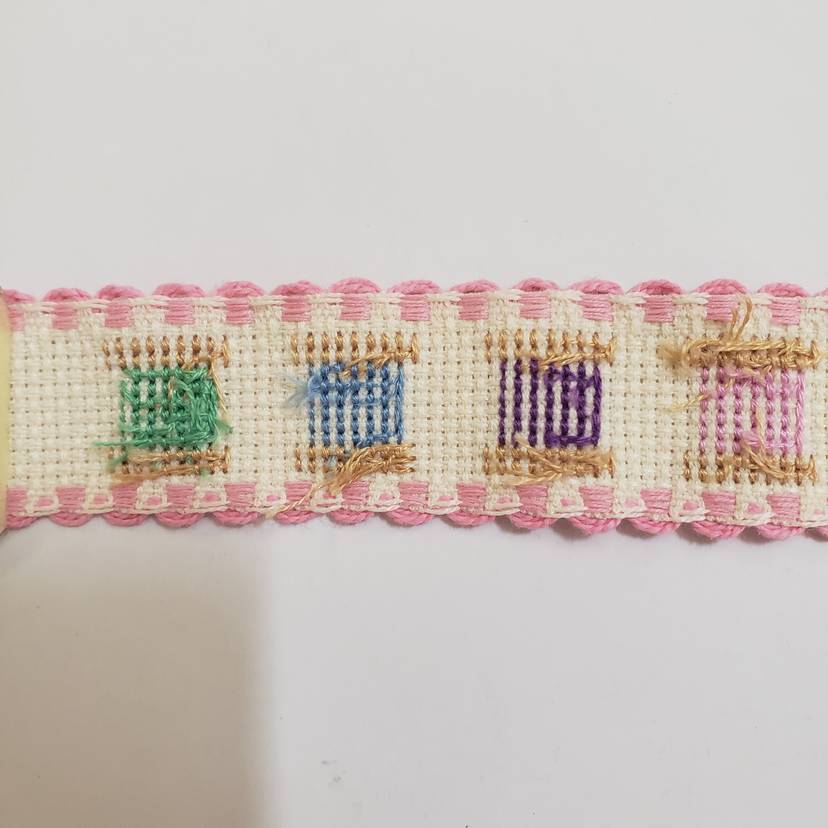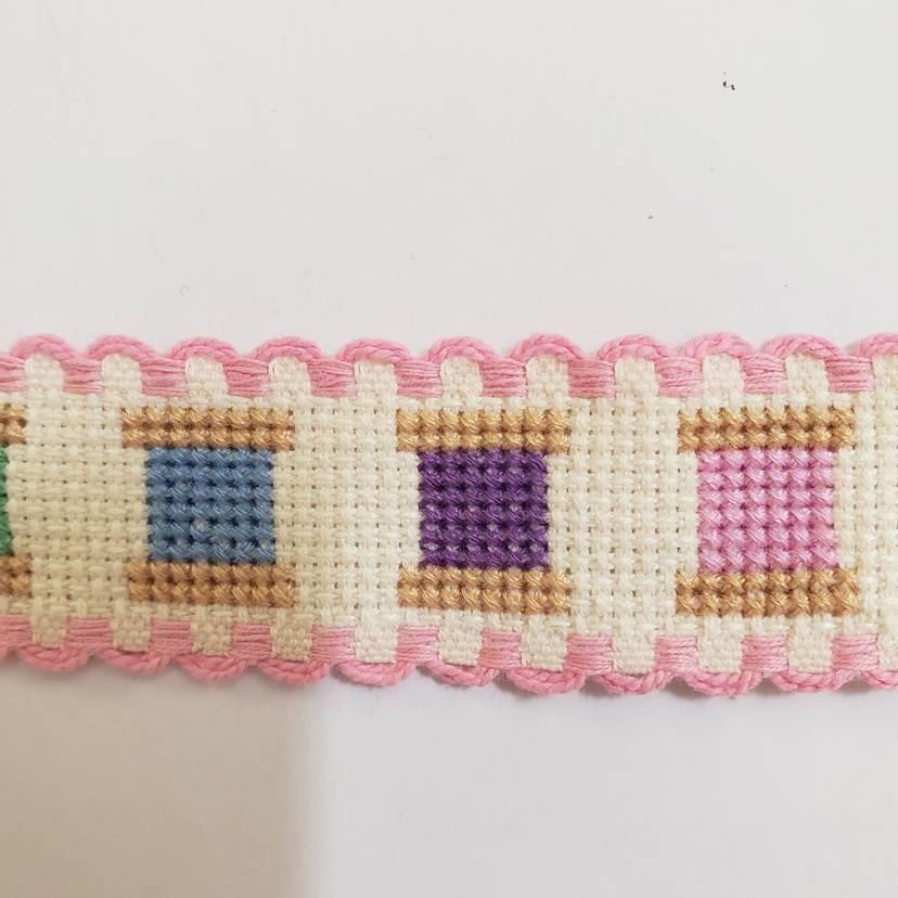 Cross-stitched ivory with pink trimmed Ribband multi colored spools of thread themed. Great for adding to your craft project. 1"×36"
