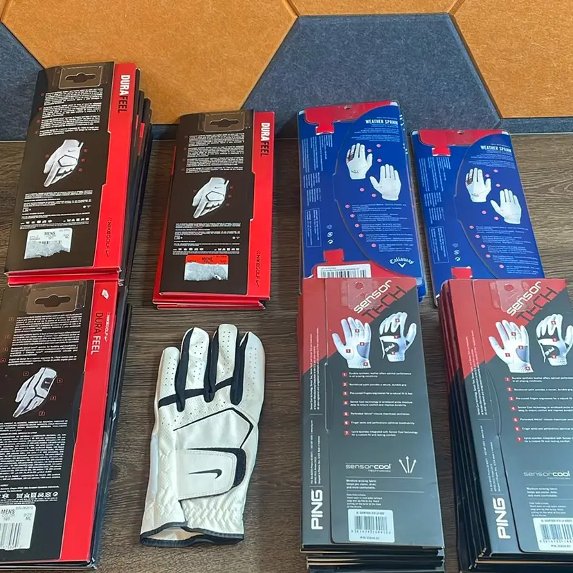 New Golf Glove Lot: All Left Hand, Ping (6 M), Ping (7 ML), Nike Dura Feel Black Strap (5 ML), Nike Dura Feel White Strap (9 ML), Nike Dura Feel White Strap (3 + 1 No Box, L), Callaway Weather Span USA Ed. (5 M), Callaway Weather Span USA Ed. (1 ML) Some packages may have retail stickers, scuffs, scratches, etc. See Photos! Feel free to make an offer! Thanks!