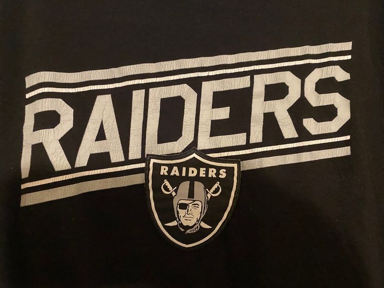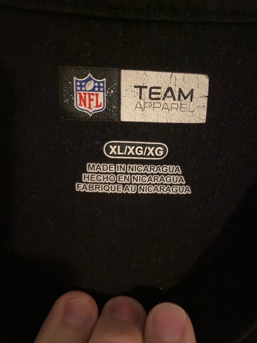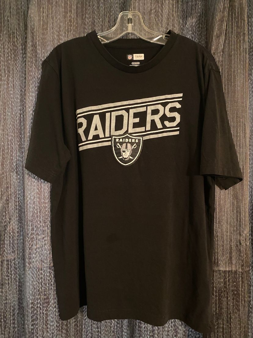 You are purchasing one Size XL Black NFL Team Apparel Raiders Short Sleeve T-Shirt w/ a Patch Logo. This T-Shirt is in good condition with no rips or holes, just see final image for a small spot of discoloration on the bottom front of the Shirt.