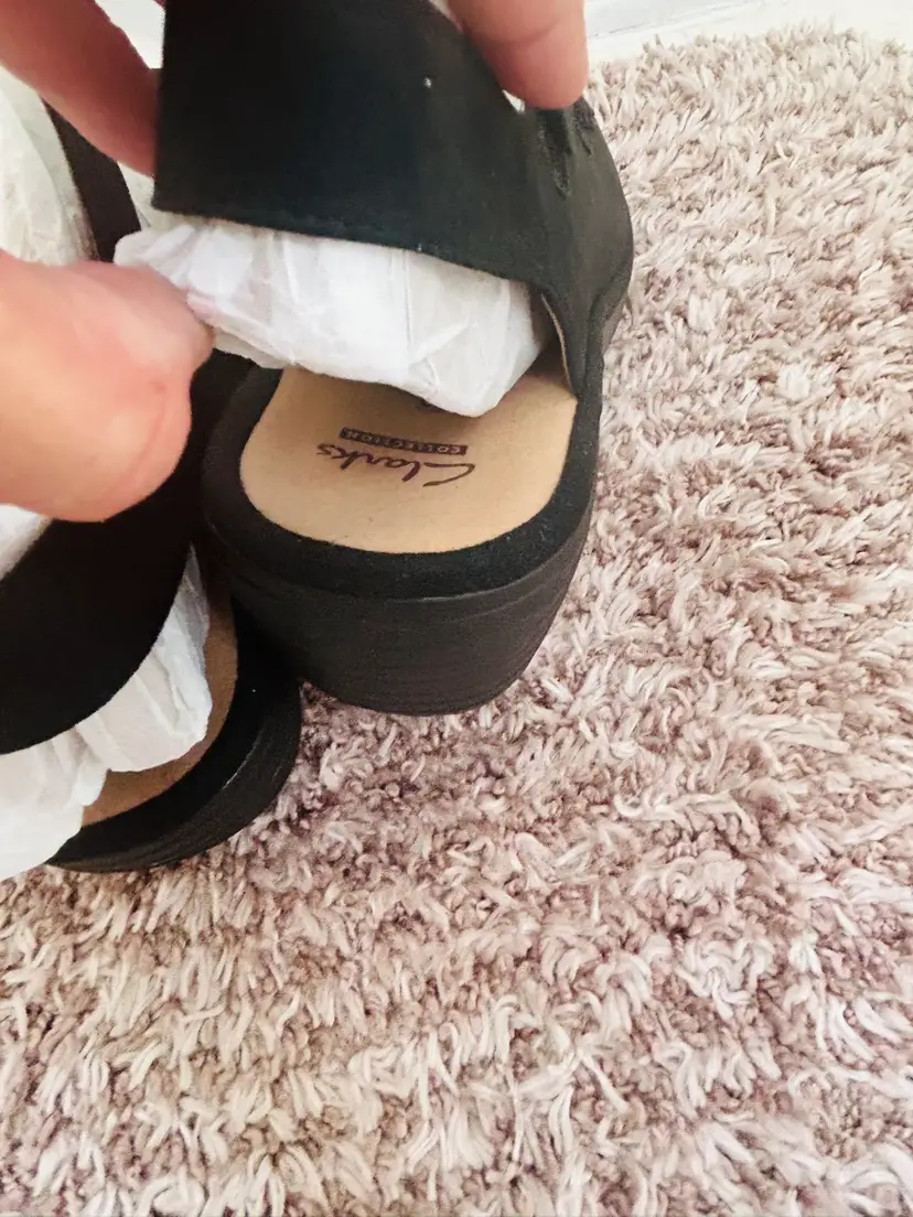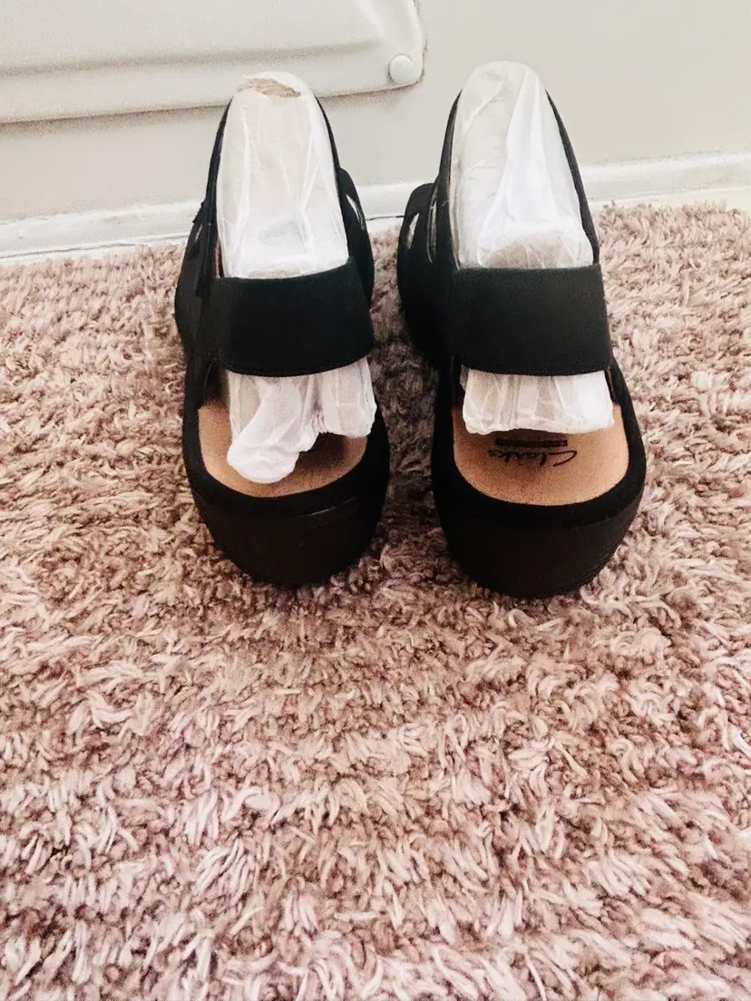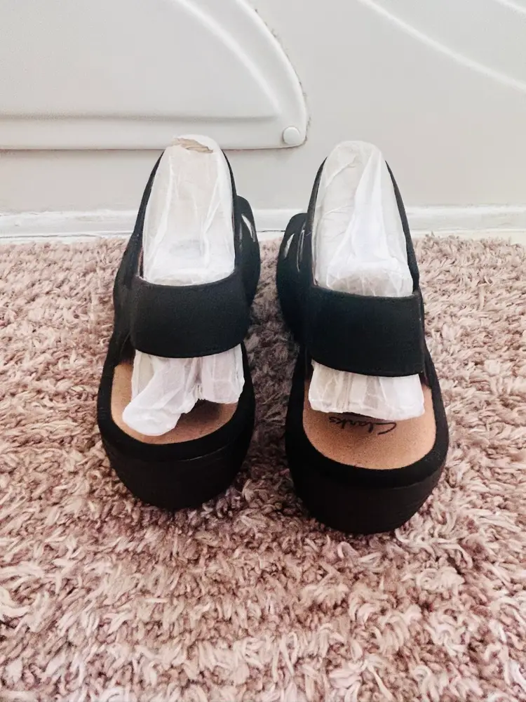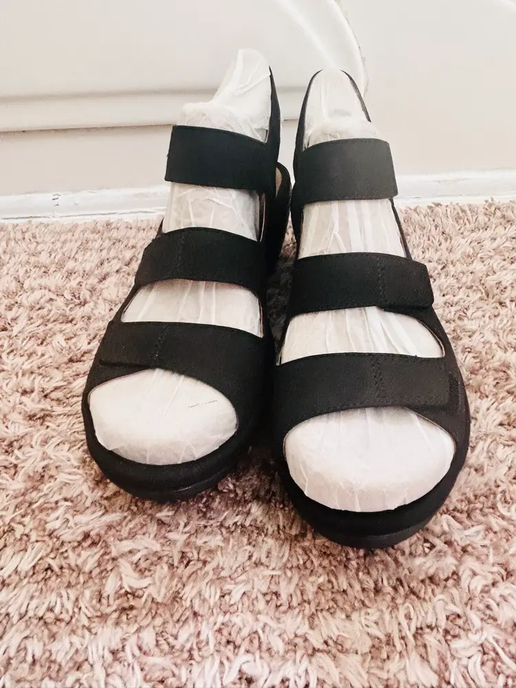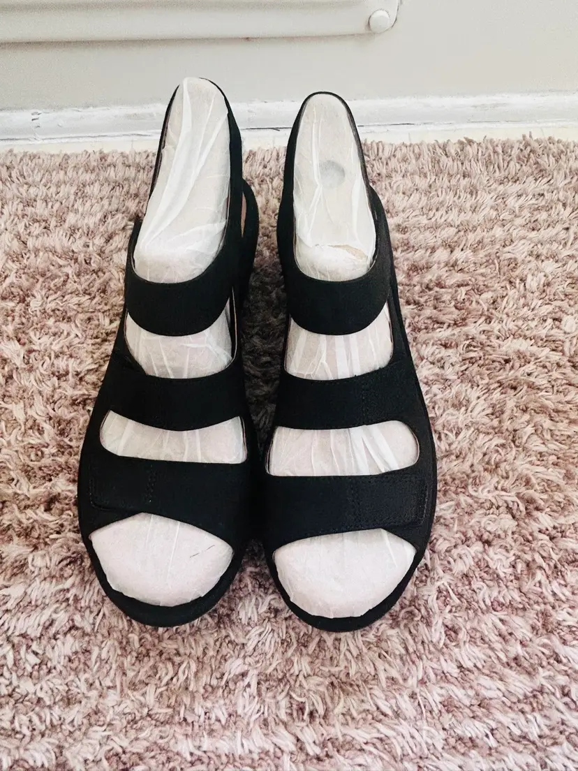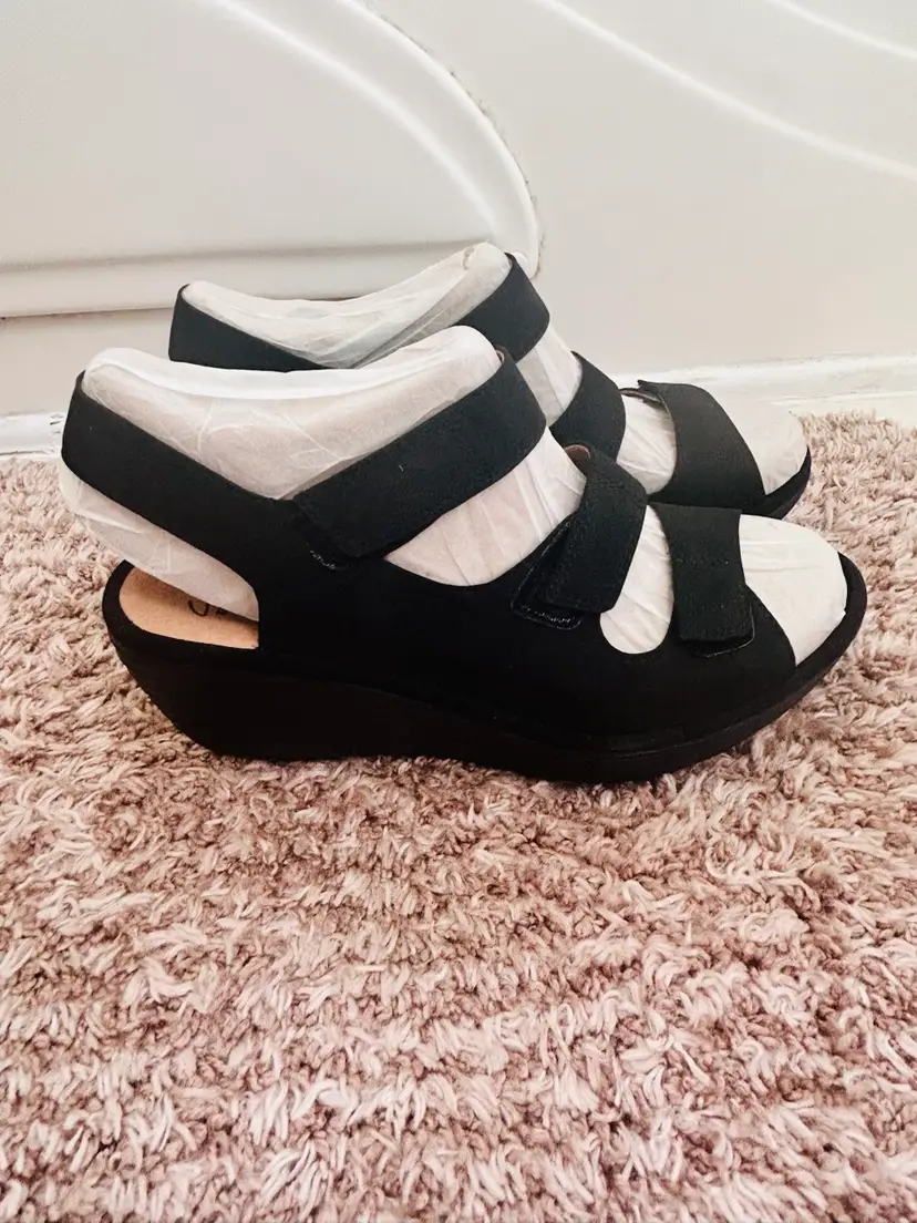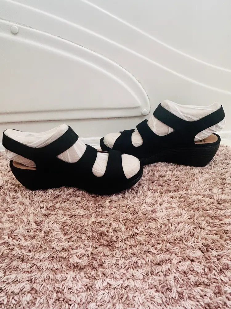 The NIB Clarks Wedges Reedly Juno Sandals in Sage Triple Strap are stylish and comfortable sandals perfect for casual occasions or travel. Made with nubuck leather and featuring a wedge heel, these sandals offer a mid-height heel for added support. The triple strap closure and adjustable straps ensure a secure fit, while the solid black color and strappy design add a trendy touch to any outfit. Ideal for the summer, fall, or spring seasons, these Clarks sandals are a versatile addition to any woman's shoe collection.
