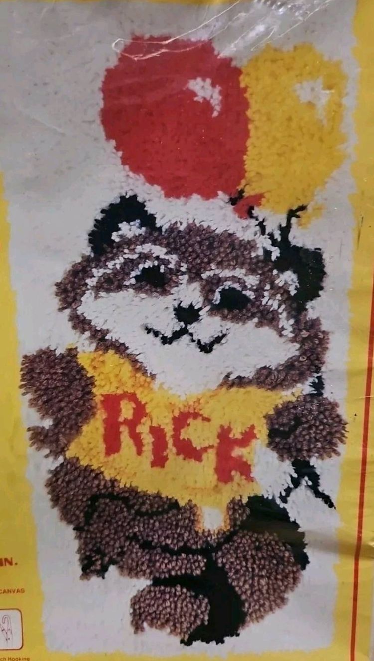 This vintage 1980 Vogart Crafts Latch Hooking Kit features the lovable character Rick Raccoon from Hallmark Cards' Shirt Tales. The kit is brand new in its original packaging and was made in the United States.