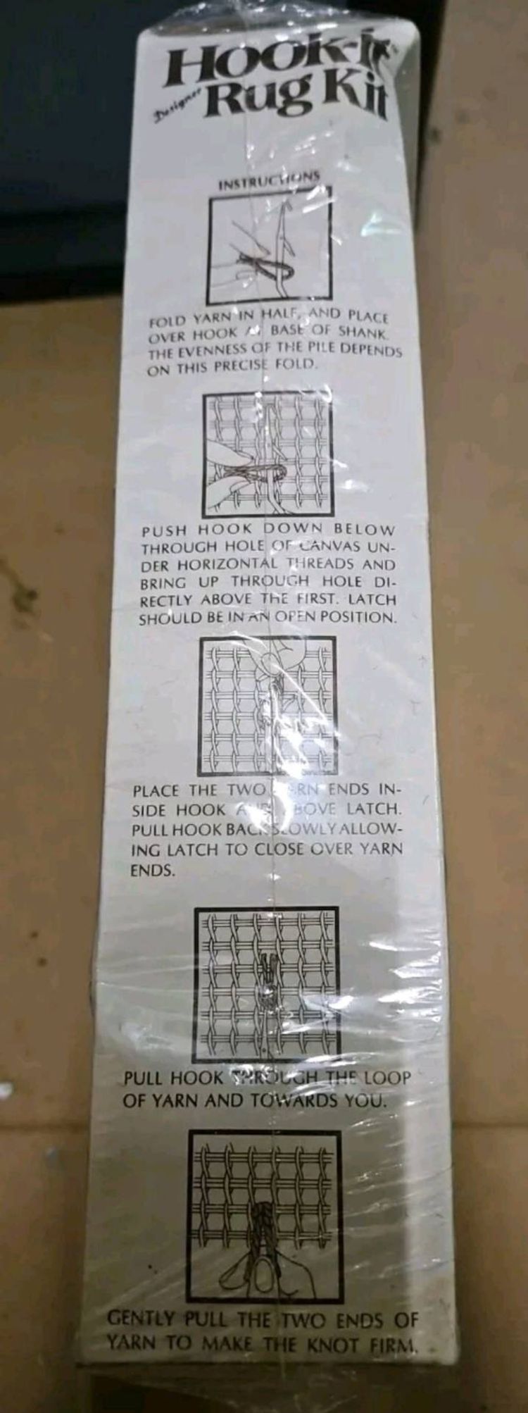 The kit includes everything needed to create a beautiful latch hook rug, including pre-cut acrylic yarn, a printed canvas, and complete instructions. This kit is perfect for any fan of the Shirt Tales or vintage crafting.