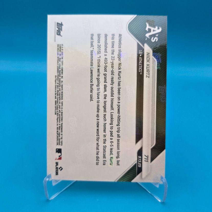 Nick Kurtz 2025 Topps Now red foil RC /5 commemorating hitting the longest grand slam in the Statcast era. NM or better condition. Shipped boxed with Ground Advantage tracking included.