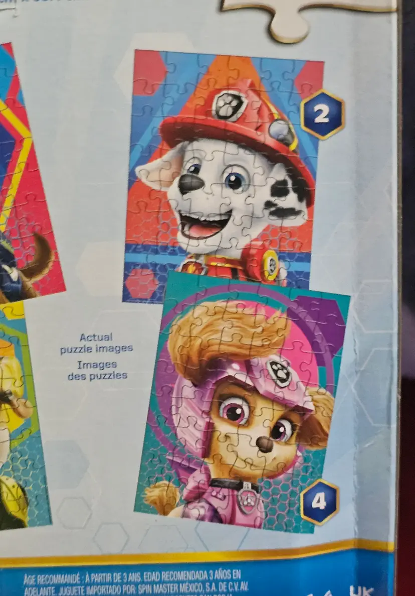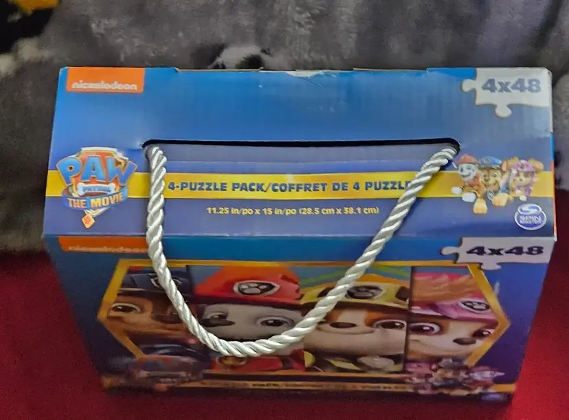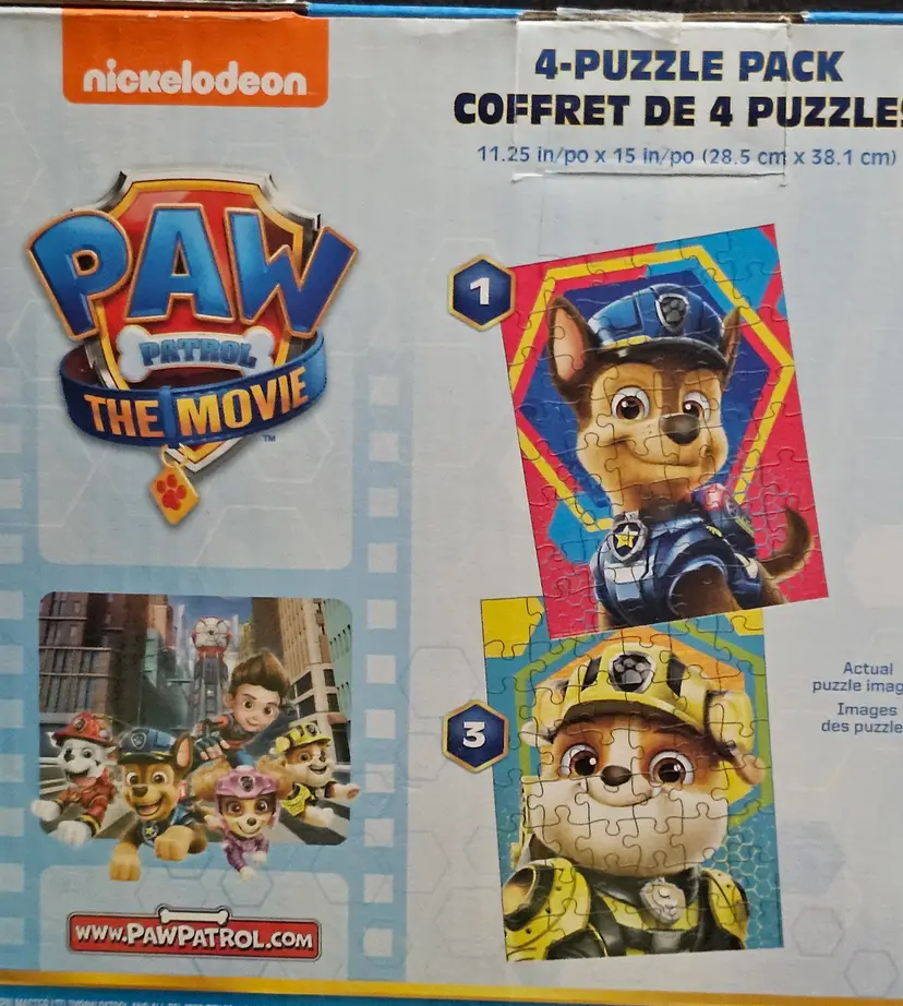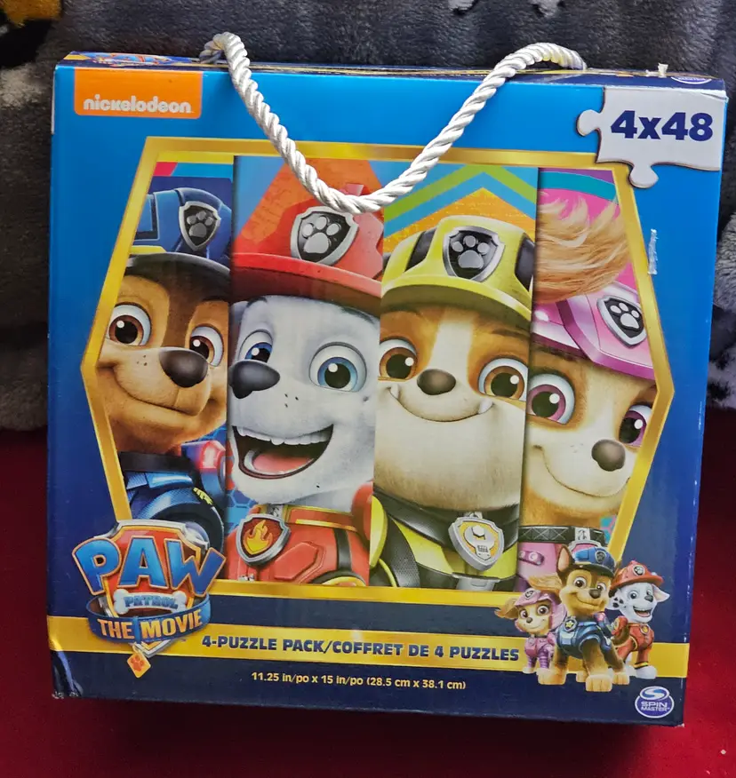 Nickelodeon Paw Patrol the Movie Four Puzzles contain a total of 192 pieces, with each puzzle featuring characters from the popular children's television show. Made of sturdy cardboard, these interlocking puzzles are perfect for fans of Paw Patrol. The colorful design and pet-free household make these puzzles a fun and engaging activity for kids to enjoy.