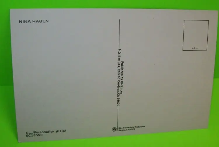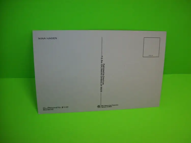Size: Standard (5.5 x 3.5 in) Artist: Nina Hagen Character: Music Country/Region of Manufacture: United States Custom Bundle: No Material: Paper Theme: Punk, New Wave, Post-Punk, Shock Rock Personalize: No Type: Printed (Lithograph) Features: Chrome Year Manufactured: 1985 Featured Person: Nina Hagen Subject: Music Number of Items in Set: 1 Signed: No Postage Condition: Unposted Original/Licensed Reprint: Original Occasion: Portrait Time Period Manufactured: 1980-1989 Unit of Sale: Single Unit Era: Photochrome (1939-Now) Brand/Publisher: Mike Roberts Studio Franchise: None