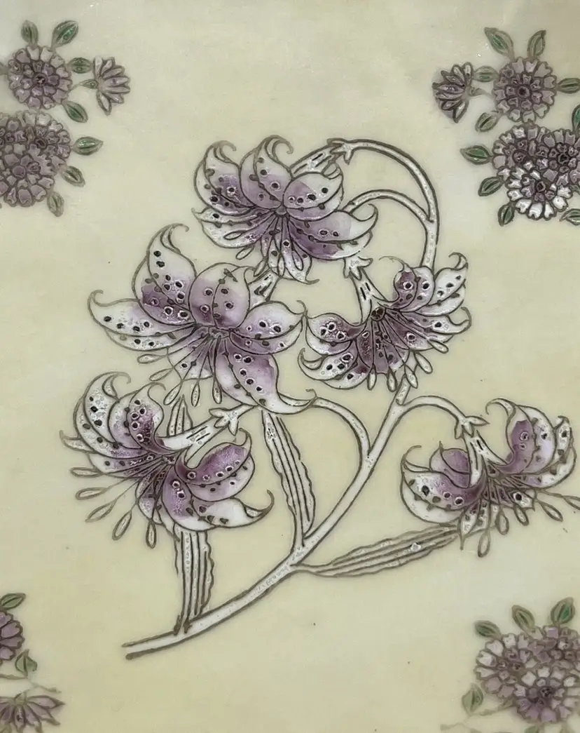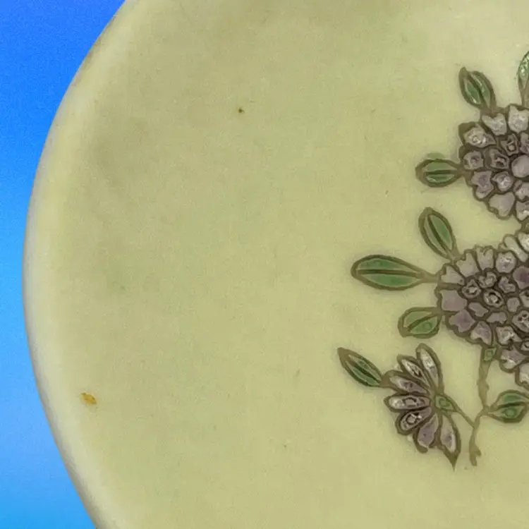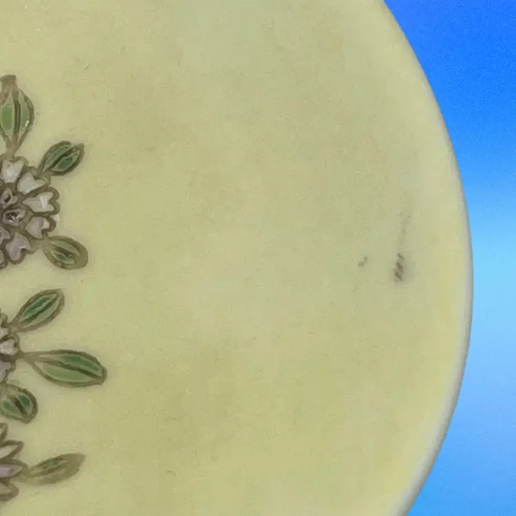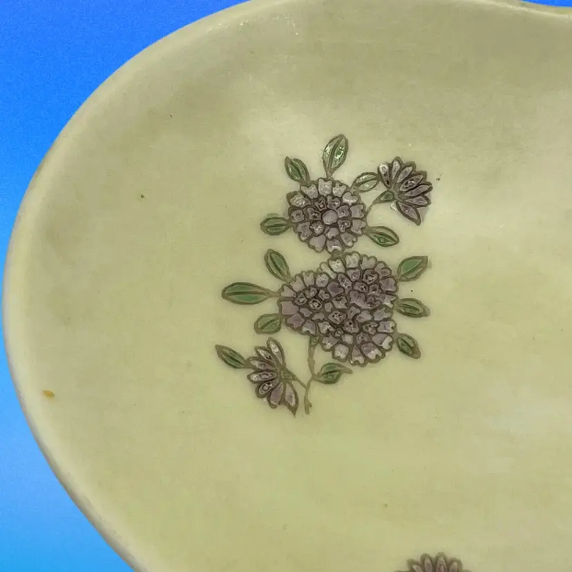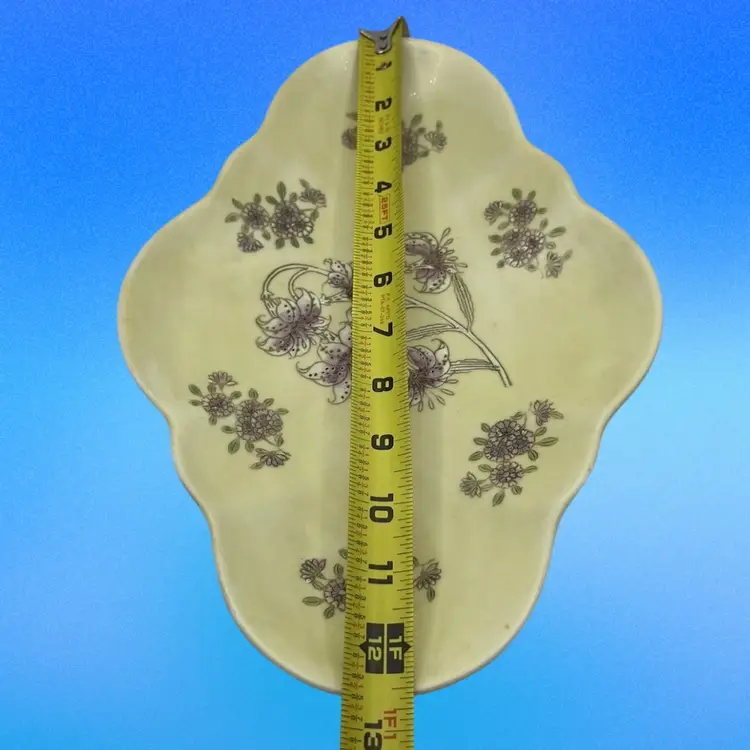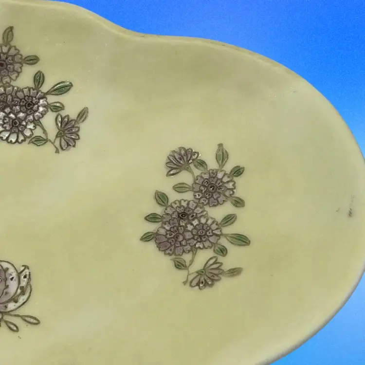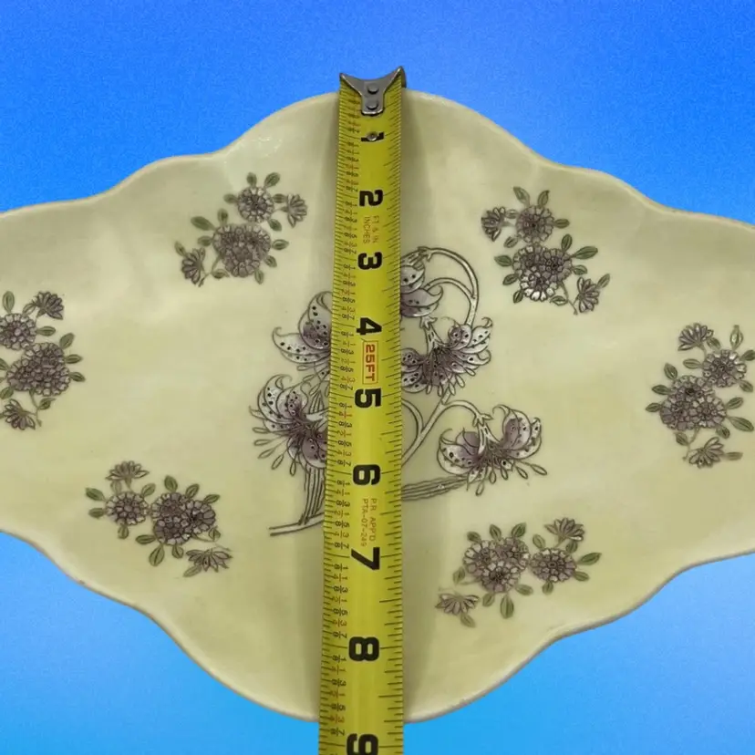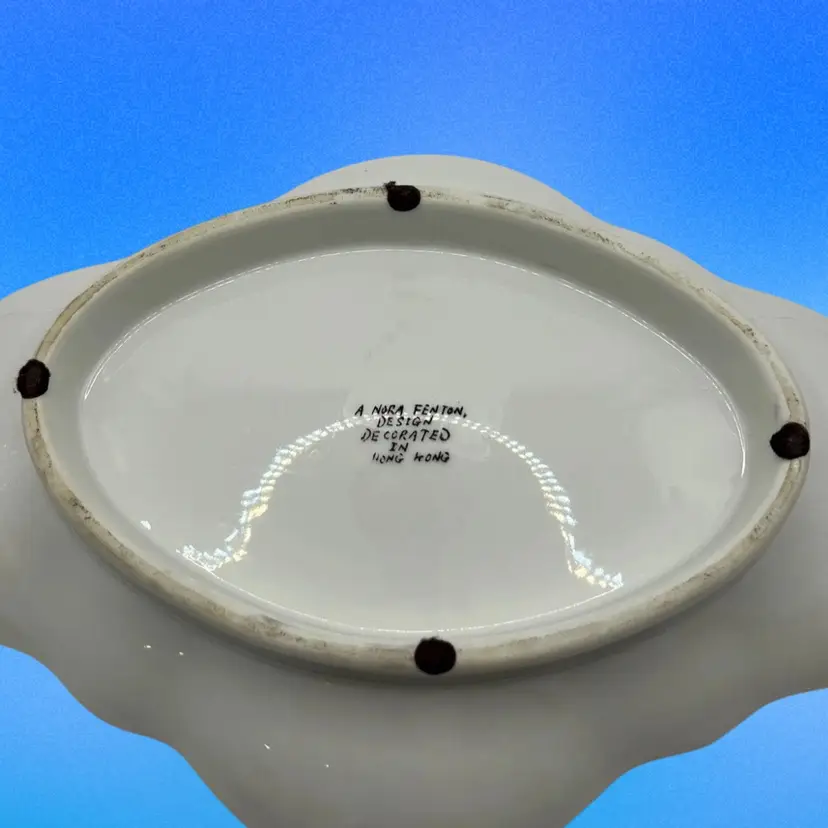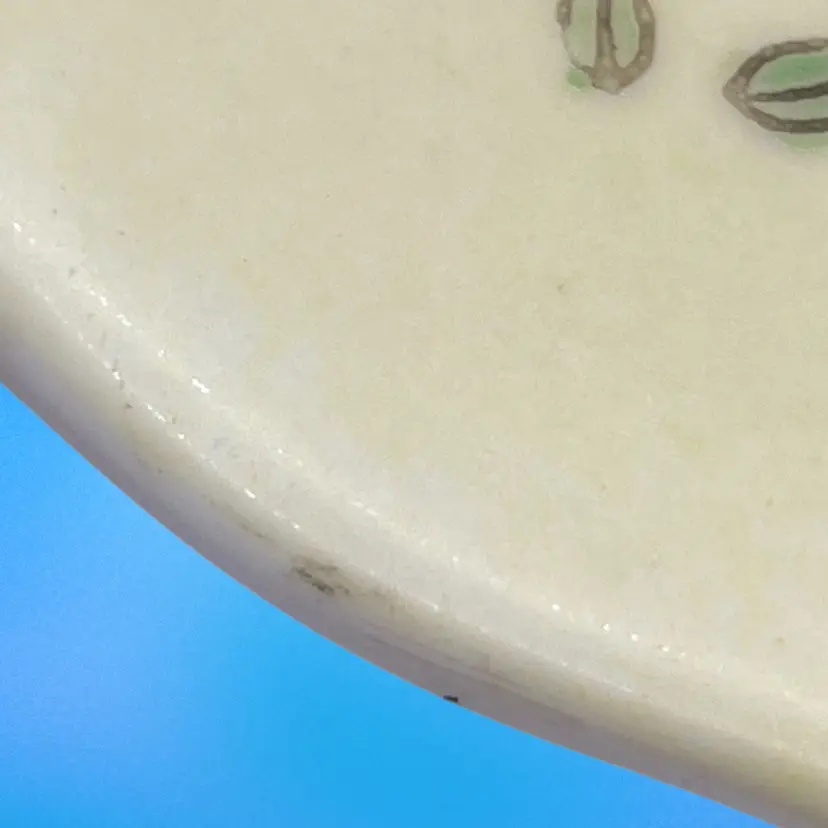No chips or cracks. There are some marks on it. It has felt pads on the bottom. It is a shallow pedestal dish/bowl. The floral design is textured/raised. Please see all pictures!