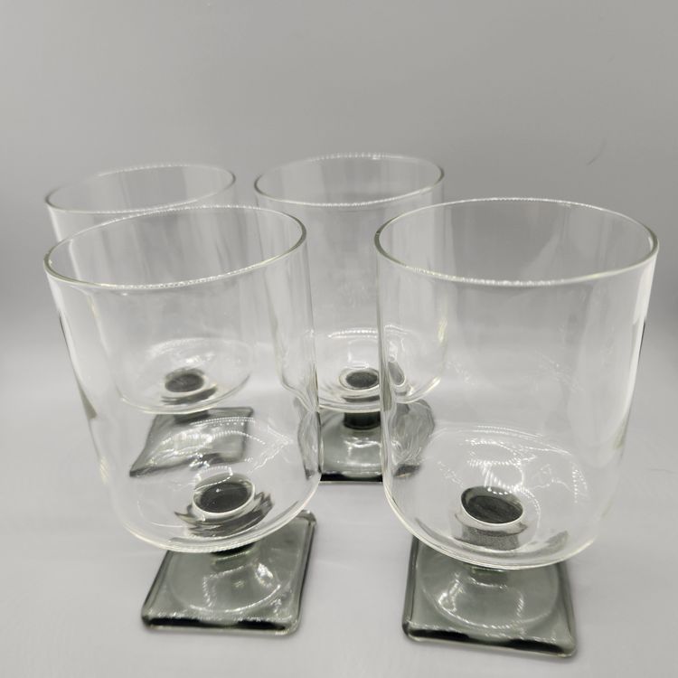 Dramatic mid century modern set of 4 water / iced tea/ cocktail glasses made by Federal Glass (USA), "Nordic" pattern and the name of the color is Midnight Smoke. Made in the 1960s they have clear glass bowls on a square smoke gray base. Pattern is very similar to the Georg Jensen Rosenthal Linear Smoke glasses, but have a slightly smaller base. I have multiple sets and sizes listed so please check my other listings.