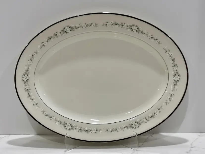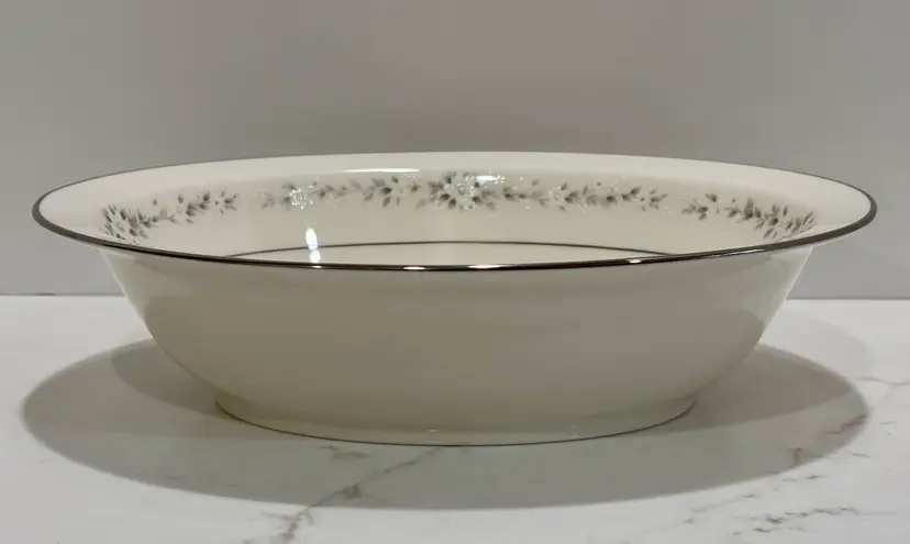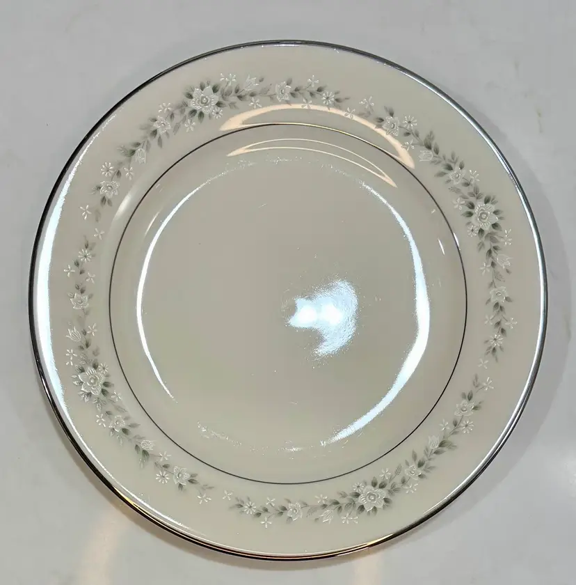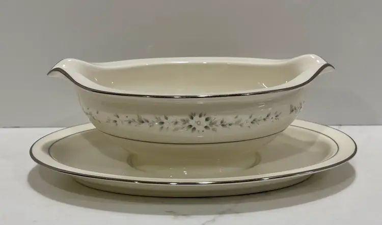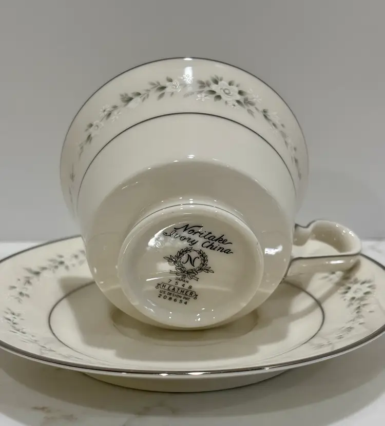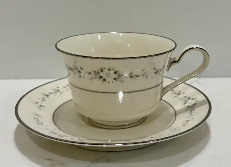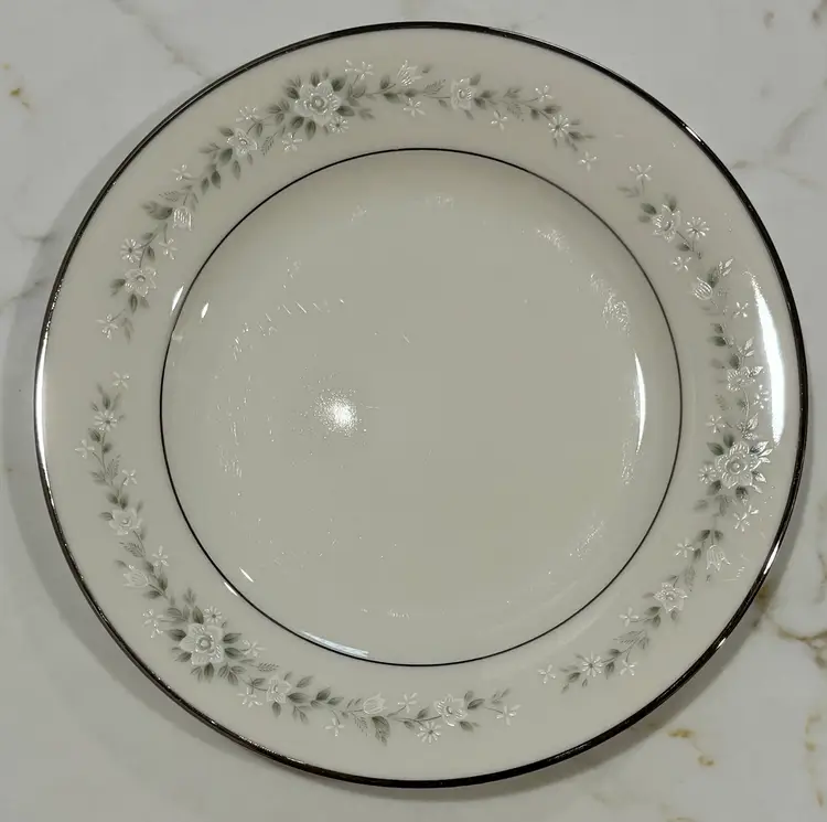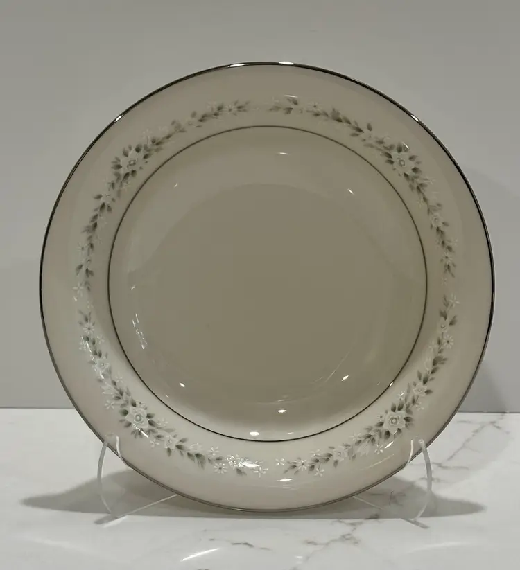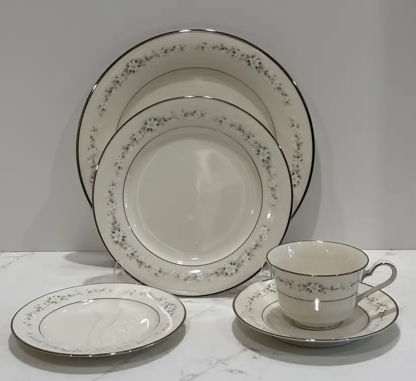 Elegant Noritake “Heather” pattern featuring delicate gray floral garlands and platinum trim. Crafted of fine china, this timeless design complements any table setting—from casual gatherings to formal dinners.