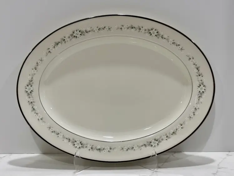 • 5-piece place setting (includes 10.5 in dinner plate, 8.25 in salad plate, 6.25 in bread plate, 6 in saucer, and 3.75 in x 2.5 in footed teacup) • Large oval serving platter 13.5 in • Oval serving bowl 10 in • Gravy bowl with attached underplate 8.5 in • Soup bowl 7.5 in