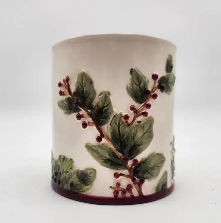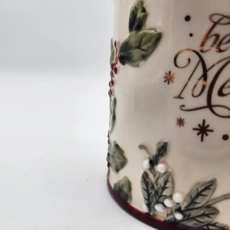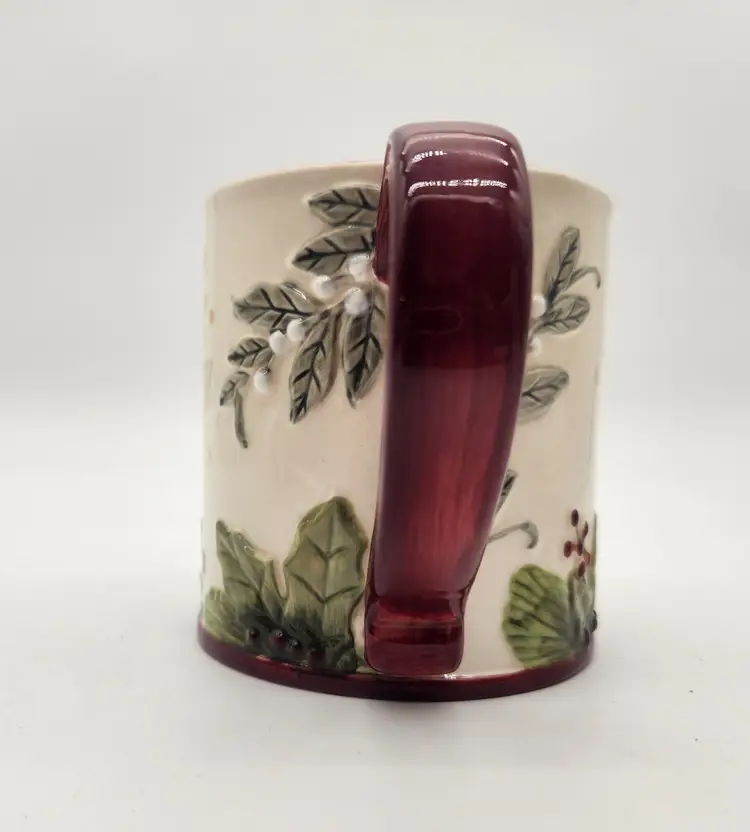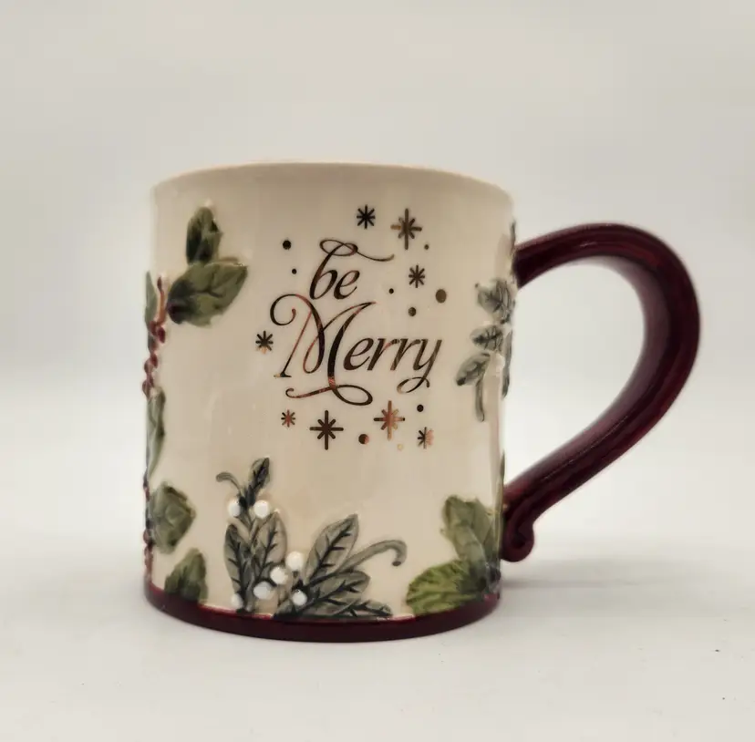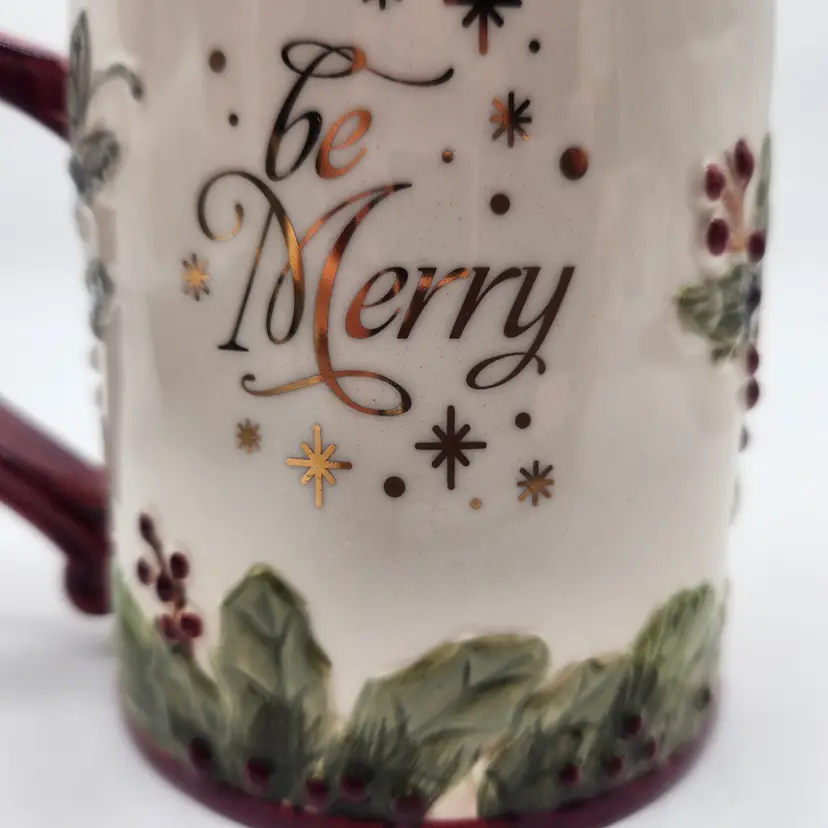 This is a large vintage mug that can hold the biggest hot toddy you can ever want: holds a full 16 oz. in stunning fashion with embossed holly and ivy in deep rich colors, a beautiful burgundy interior, and gold lettering that simply says, "be Merry". Features: Suitable for hot beverages, dishwasher safe -do not put in microwave because of gold lettering saying "be Merry". Perfect as a gift from a Secret Santa- just add candy, coco mix, or a "stuffing" of your choice! Like New Condition: no signs of wear. Keywords: Christmas mug, Be Merry mug, holiday mug, winter mug, coffee cup, tea cup, ceramic mug, embossed mug, holly berries, red handle, kitchen decor, gift idea, collectible mug, GR Gifts That Inspire, festive mug
