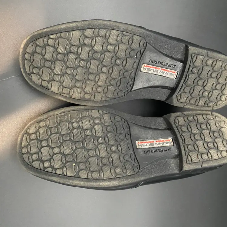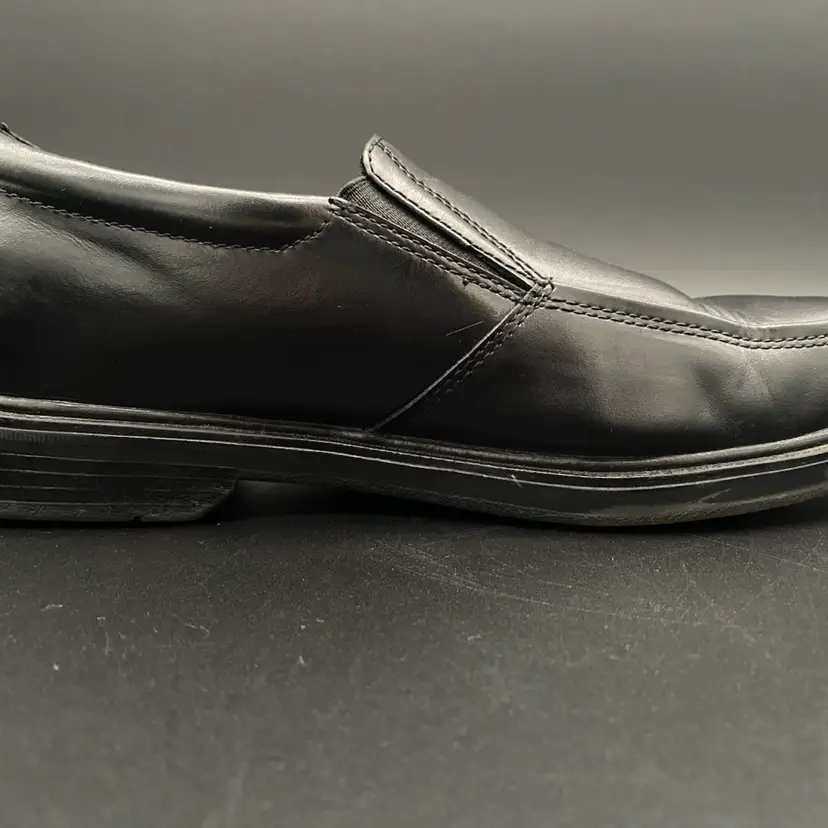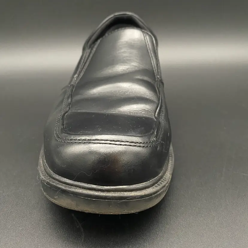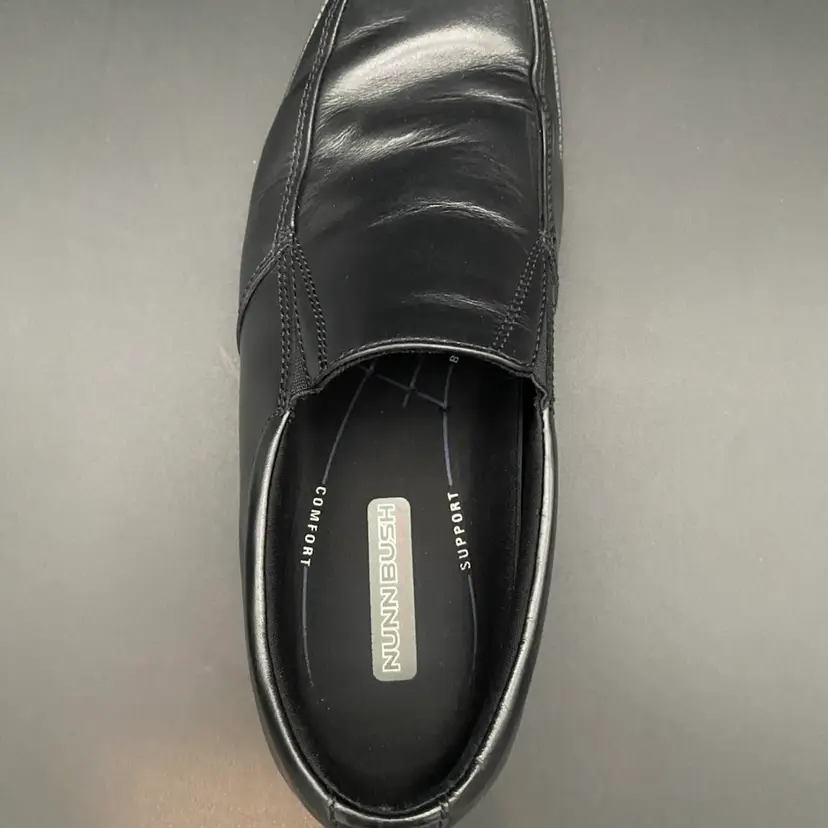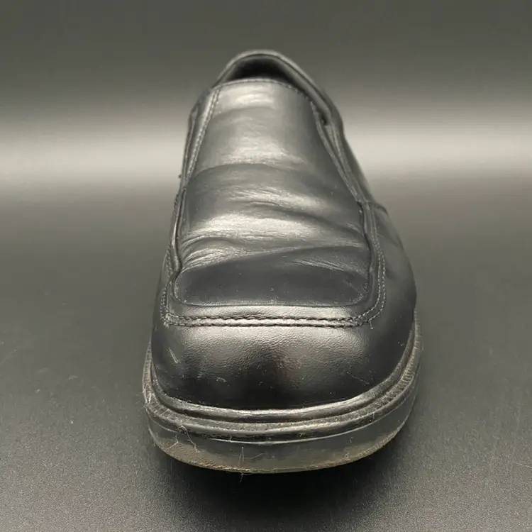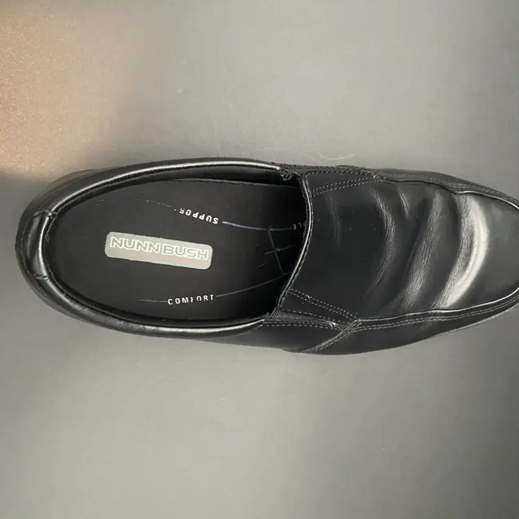 You are purchasing one pair of Men's Size 9M Black Leather Dynamic Comfort Loafer Shoes by Nunn Bush. These shoes are slip resistant and have breathable support insoles. These Shoes are in overall great condition. No rips, holes or stains on the exterior material or insoles. Great tread on the bottoms. Most notable sign of wear is shown in the final image: extremely faint scuff on the back left side of the right shoe.