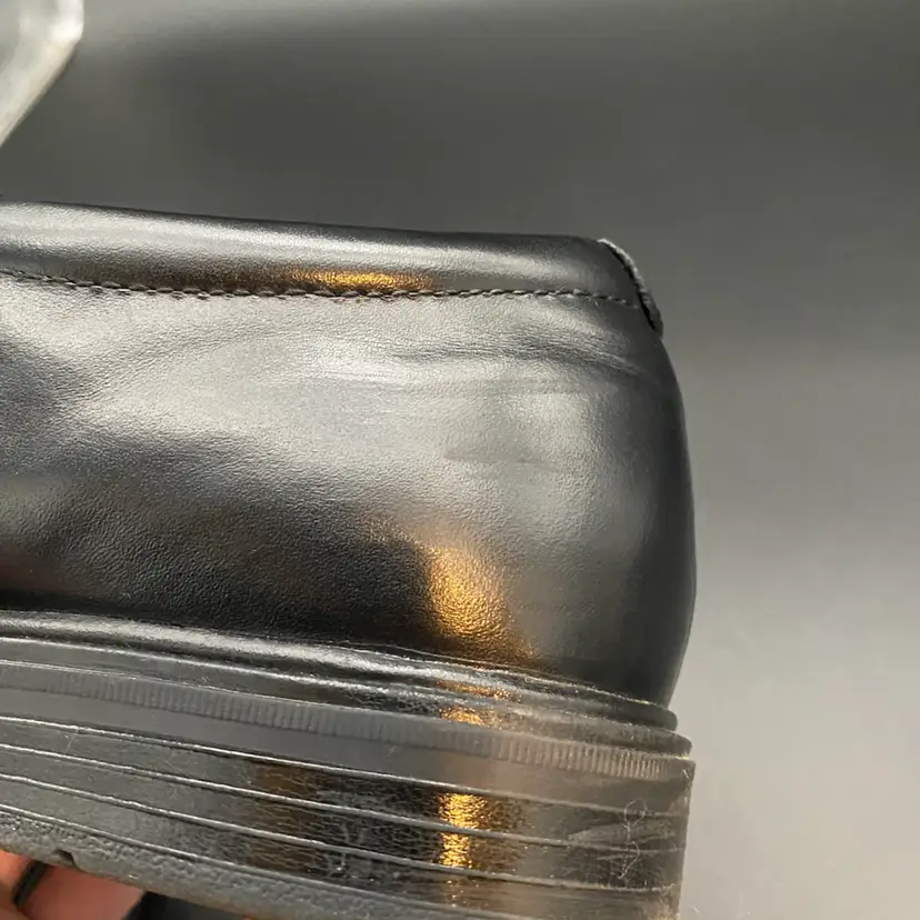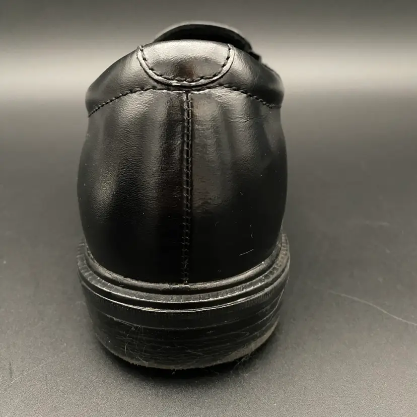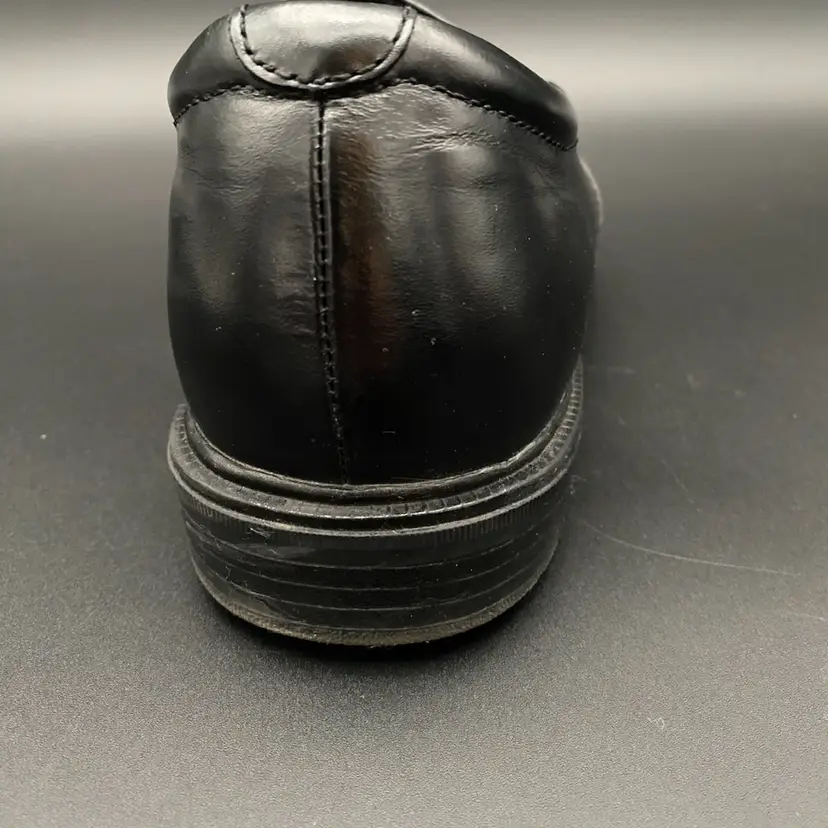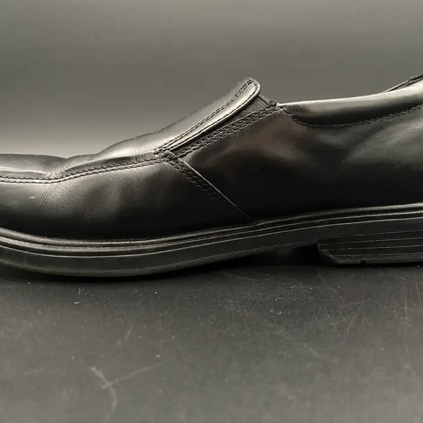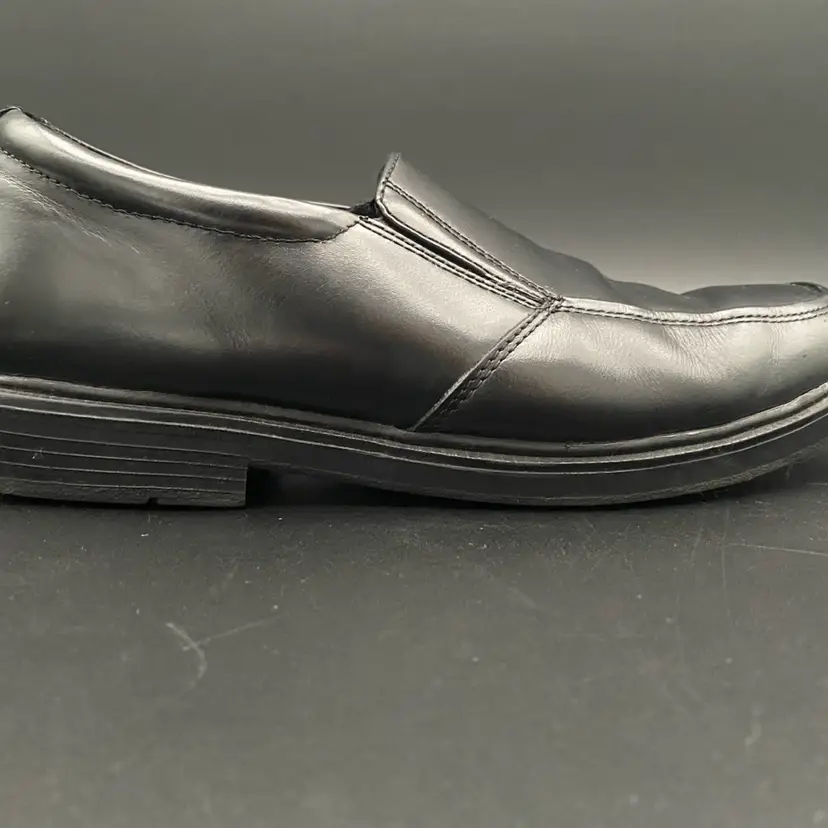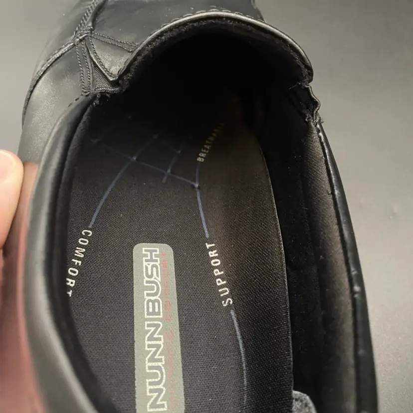 You are purchasing one pair of Men's Size 9M Black Leather Dynamic Comfort Loafer Shoes by Nunn Bush. These shoes are slip resistant and have breathable support insoles. These Shoes are in overall great condition. No rips, holes or stains on the exterior material or insoles. Great tread on the bottoms. Most notable sign of wear is shown in the final image: extremely faint scuff on the back left side of the right shoe.