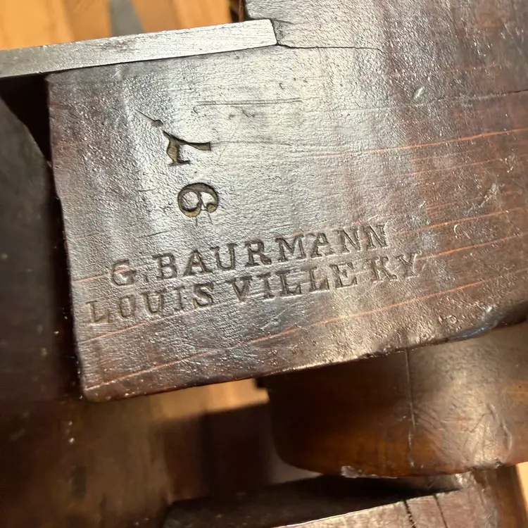 Based on my research: Gustave Baurmann (1817-1884) was a Louisville, Kentucky, hardware, cutlery, and gun dealer. He was born in Prussia and immigrated to the United States as a young man. He was part of several hardware partnerships, eventually opening his own business — G. Baurmann & Co. — in 1854. After the end of the Civil War, Baurmann hired local architect Henry Whitestone to design a store for him at 741 West Main St., as well as a spacious 14-room home on Market St. In 1870, he owned $40,765 worth of property in the city. Louisville was home to a large German community in the 1800s. Baurmann took an active part in it, including serving as the treasurer for the local opera house. He sold his business to Harvey, Girdler & Co. in 1872; two years later he put his house up for sale and traveled to Europe. The 1880 federal census lists six Baurmann children, three girls and three boys, aged 9-20. Baurmann died in 1884 and is buried in Louisville’s Cave Hill Cemetery. https://workingwoodenplanes.com/p/2025-02-28-ebenezer-clifford-bell-diver-planemaker
