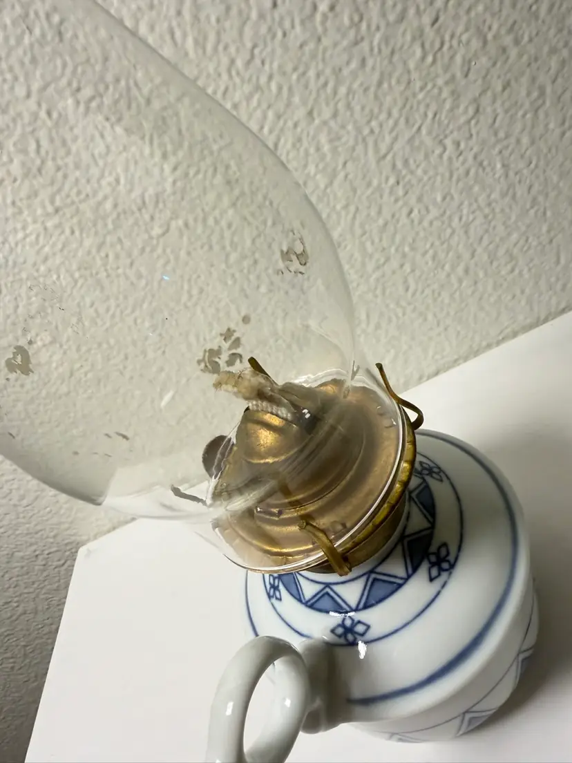 Beautiful oil lamp. Please see in photos as glass has some white marks. Looks to be painted flowers that have chipped away