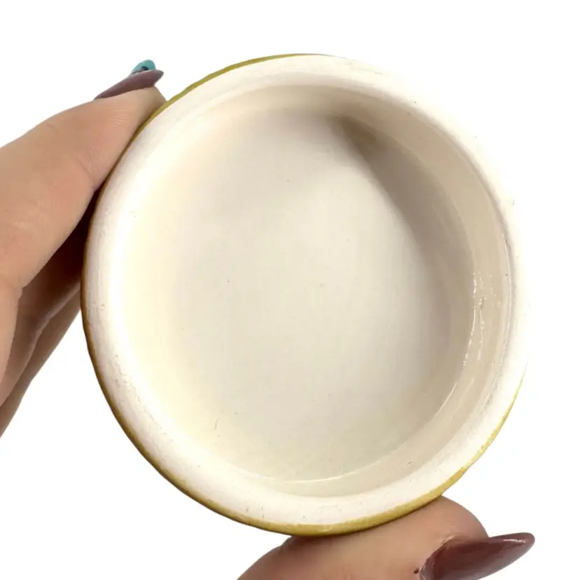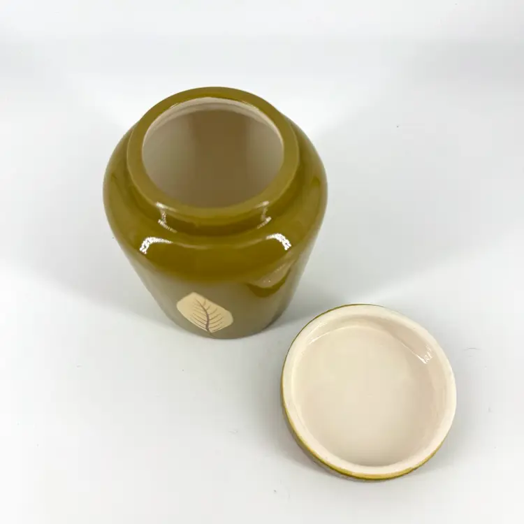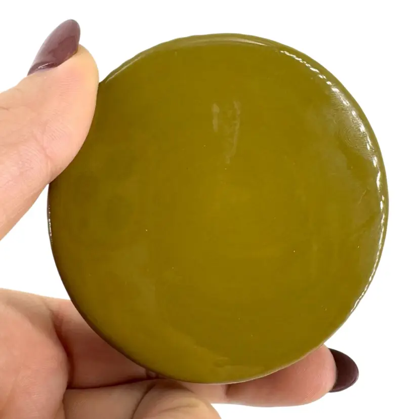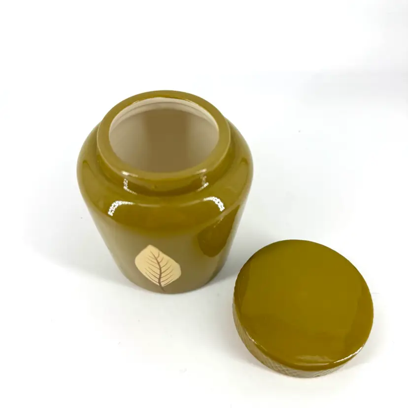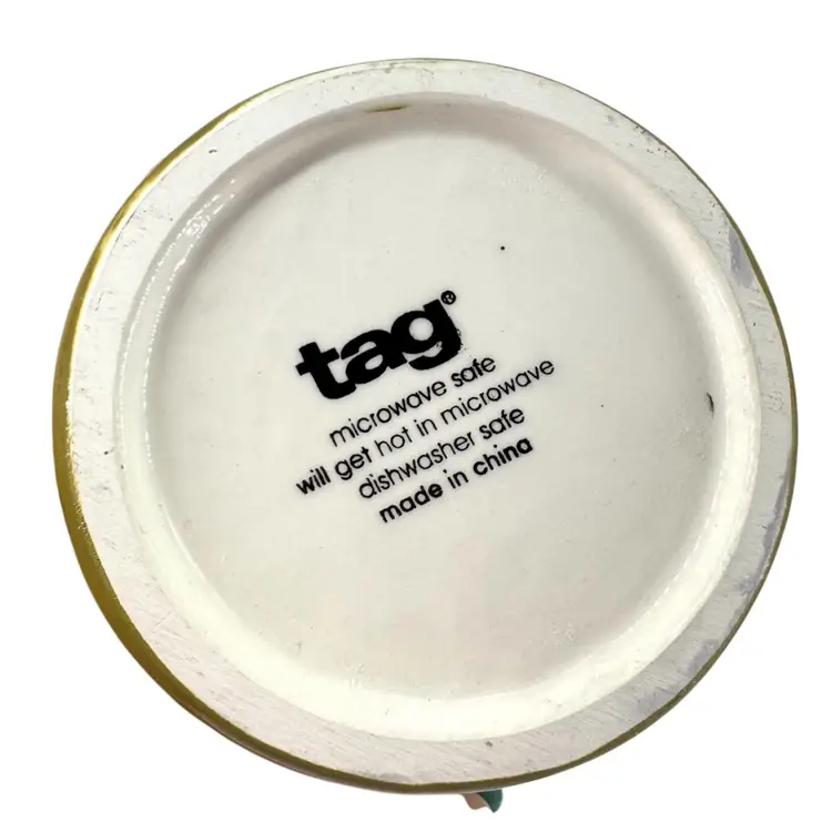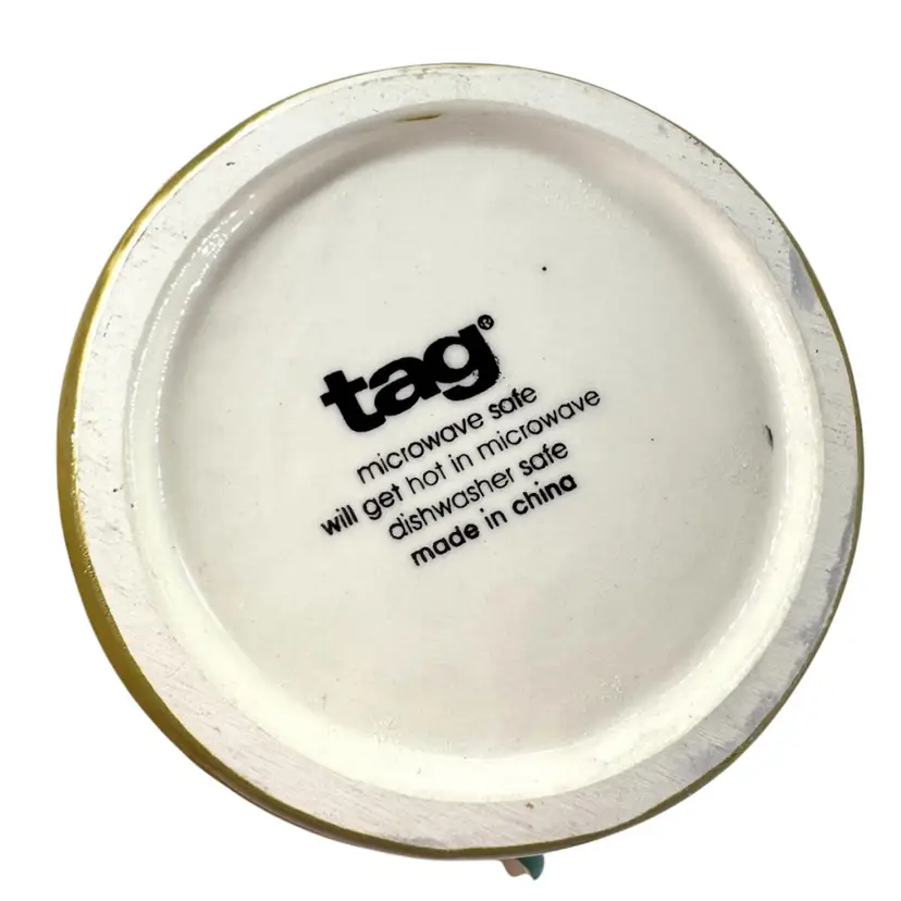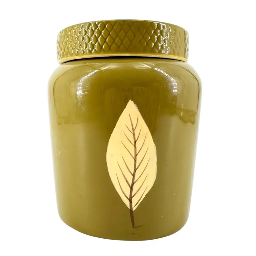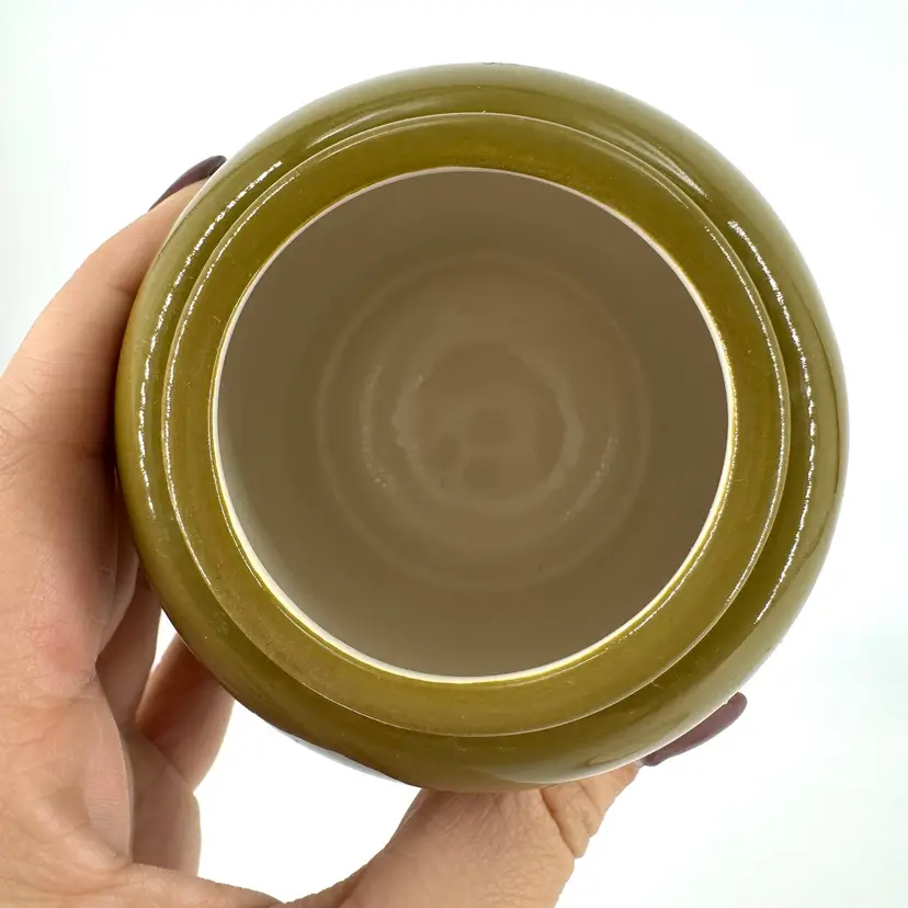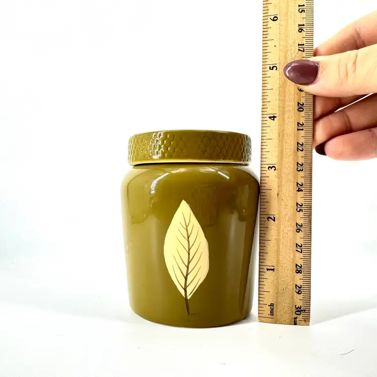 This olive green ceramic jar is approximately 4” in height. There are NO chips or crack anywhere. It is marked “TAG” on the bottom which can be seen in the photos.