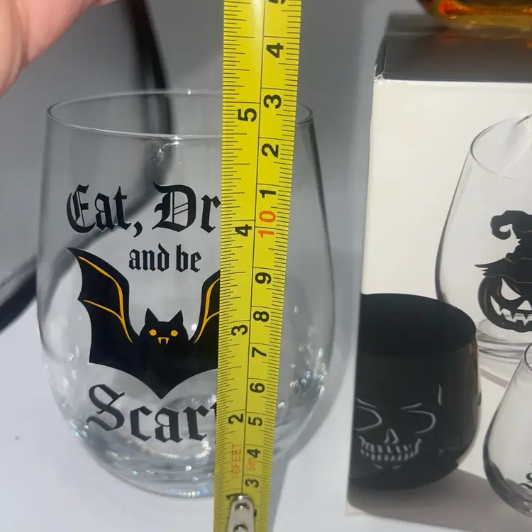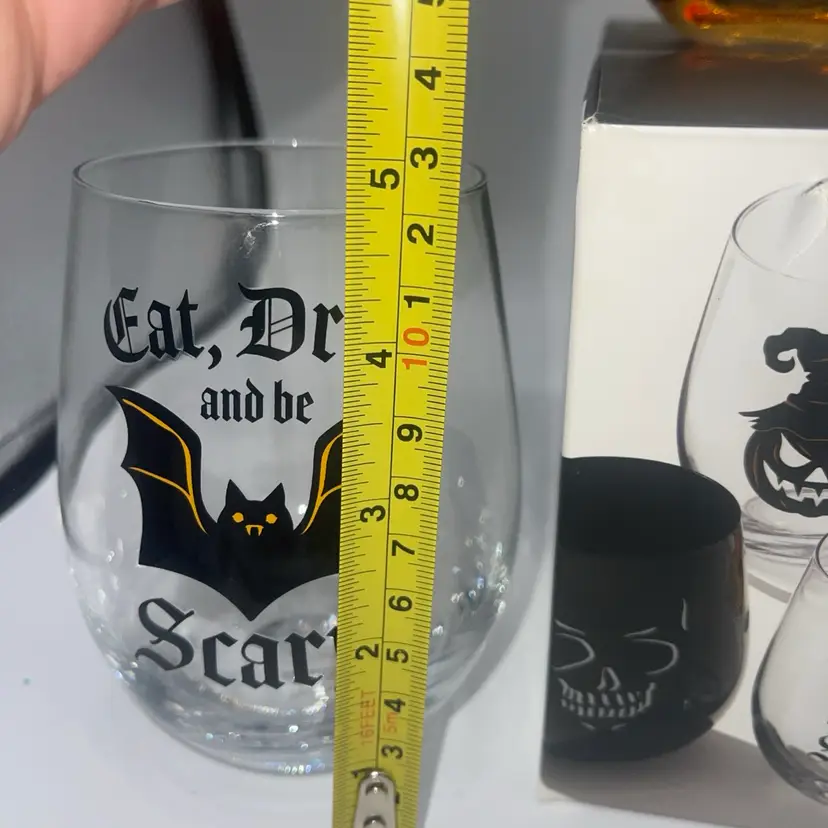 Message is 4.75 inches tall they hold 18 ounces each. They are Oneida entertain Halloween edition, stimulus wine glass set one has a bat that says eat drink and be scary, one is orange and is a pumpkin, one is black and as a skeleton and the other one is clear glass with a black and orange skeleton with a hat it’s a great set taken out of the box only for the photos. Thank you for looking.