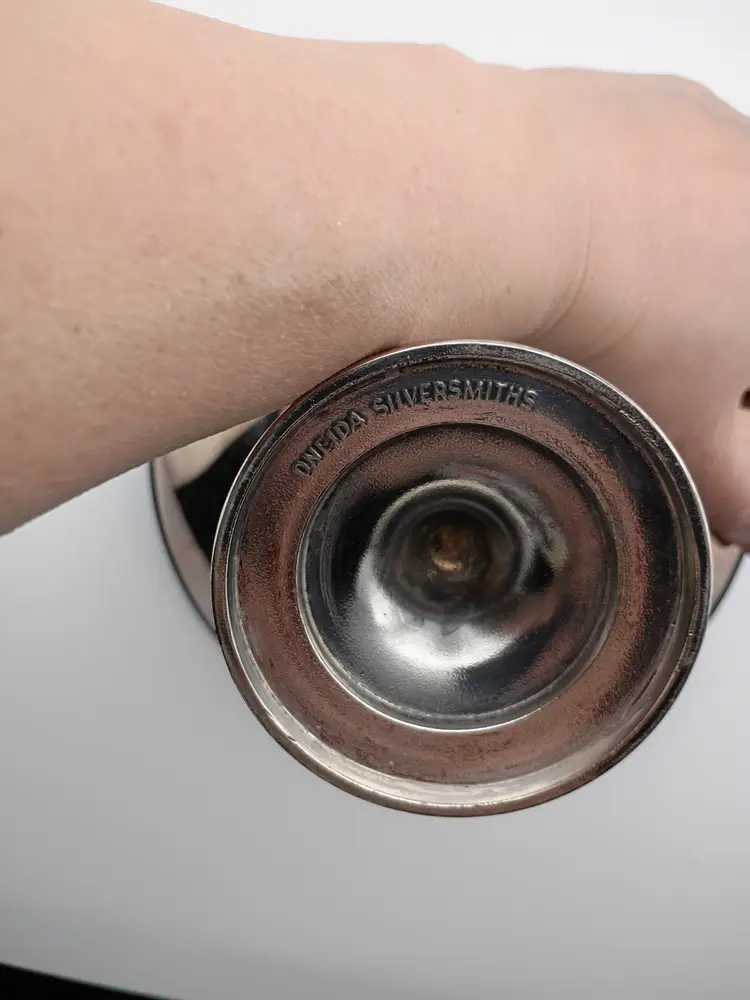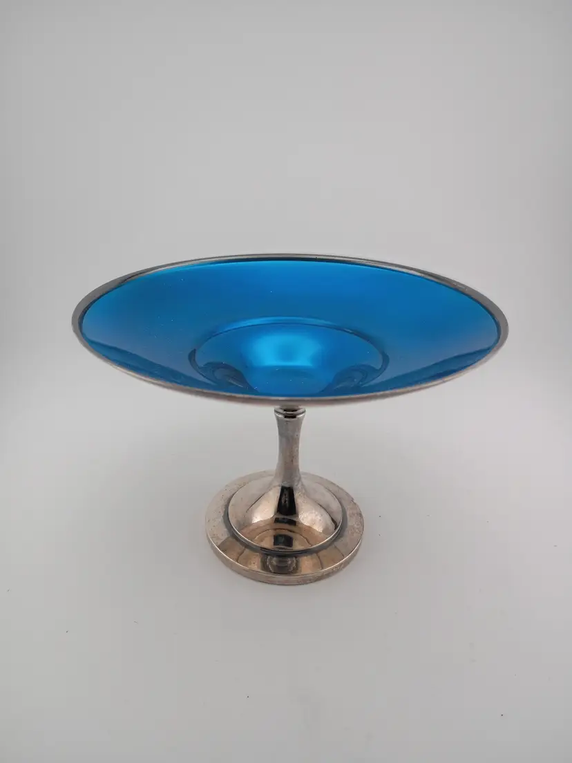 It's a gorgeous blue enamel compote from Oneida Silversmiths. It's in excellent vintage condition with no noted damage.