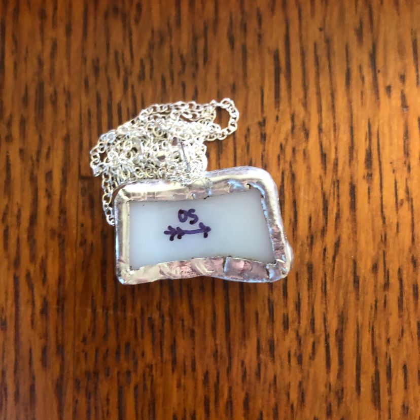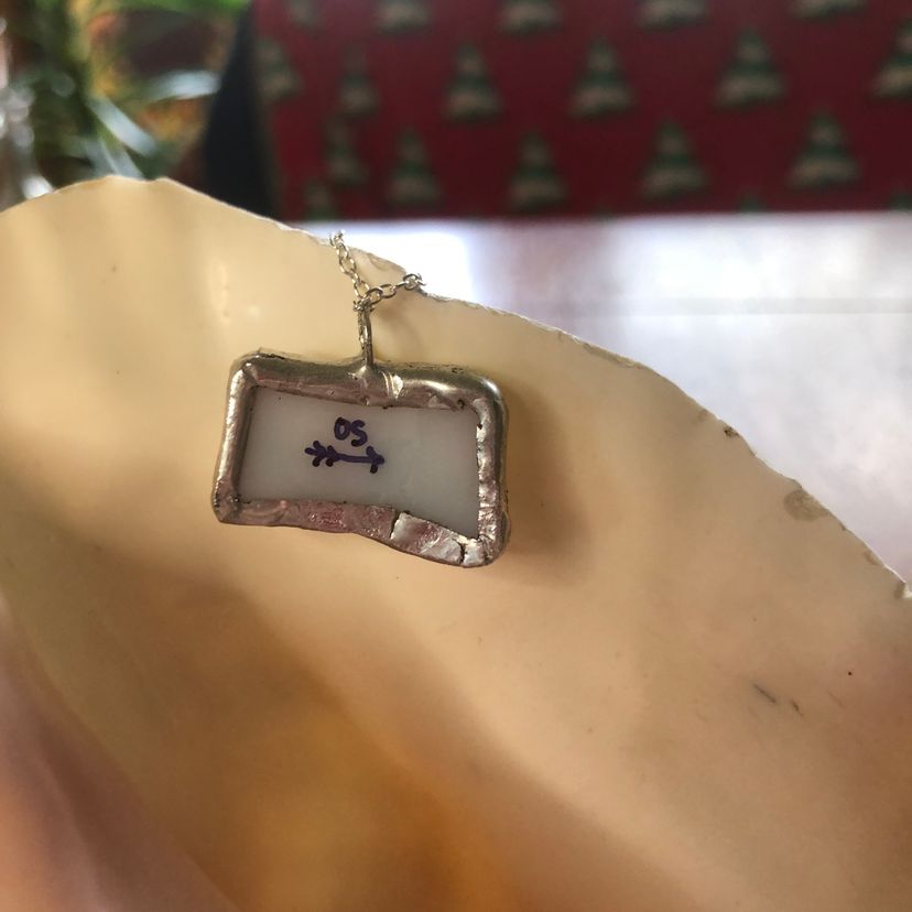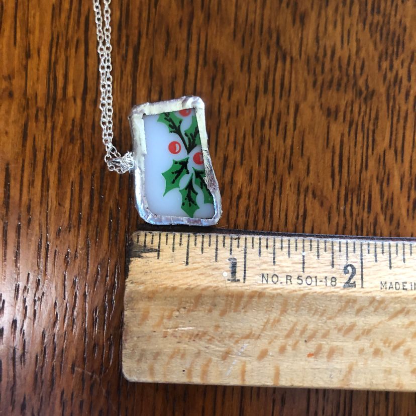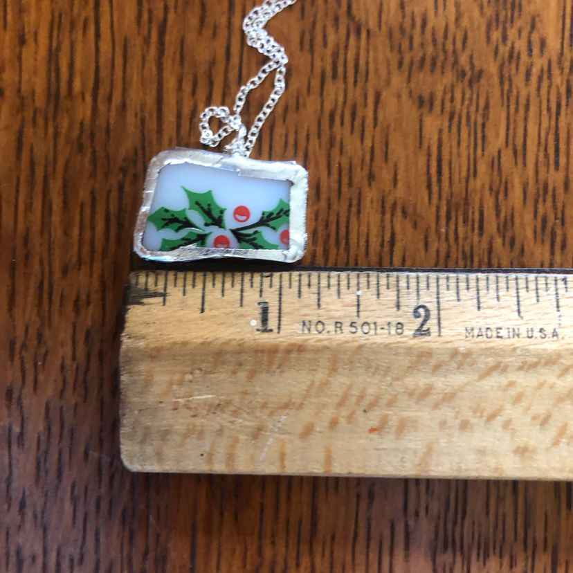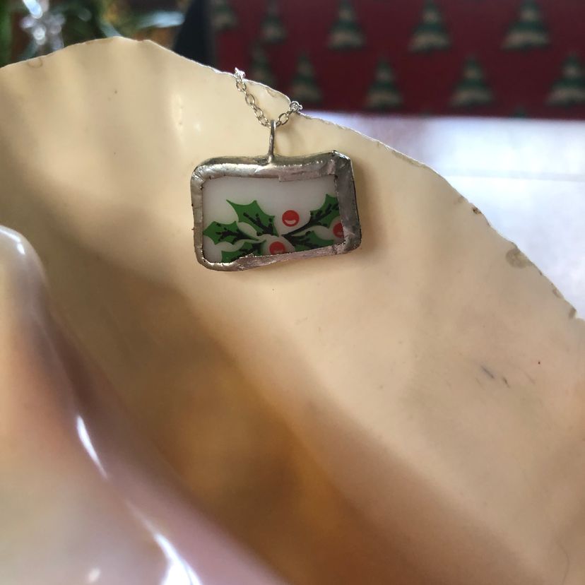 Celebrate cozy moments with this charming Broken Cup pendant, handcrafted from a tiny pice of a Corning Holly Days mug. Measuring just 1 inch by 3/4 inch, this playful necklace adds a whimsical touch to any outfit, perfect for those who love unique, artisan-made accessories with a story.