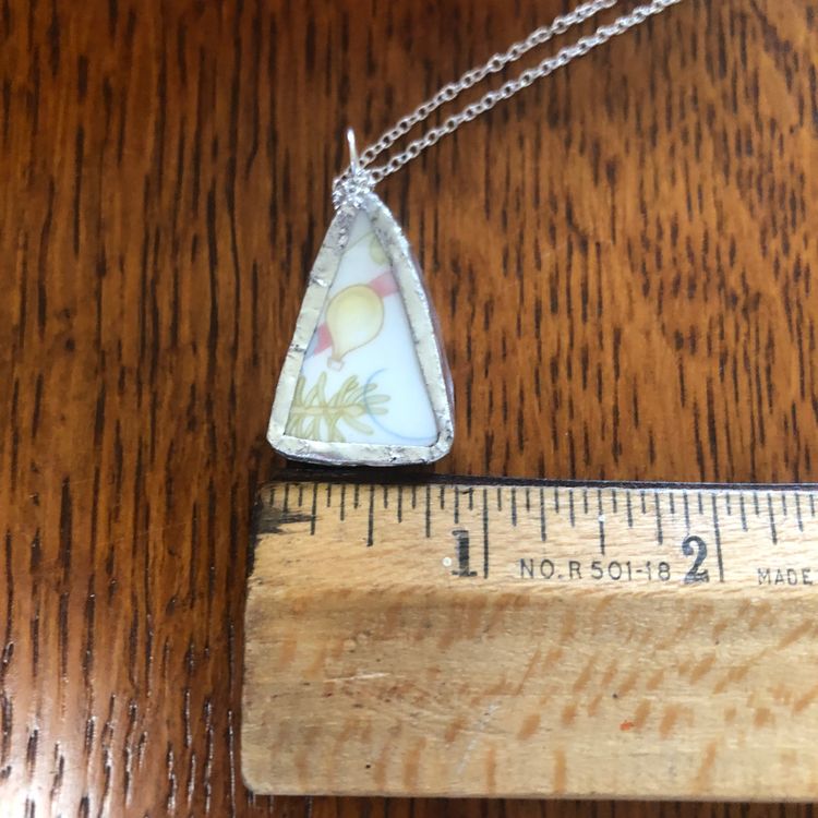 This playful handcrafted necklace features a charming broken pottery pendant crafted from a Wedgwood Peter Rabbit collector plate. Measuring 7/8 inch by 1.25 inch, this balloon pendant brings a unique touch of whimsy to your style. Perfect for lovers of vintage art and one-of-a-kind accessories.