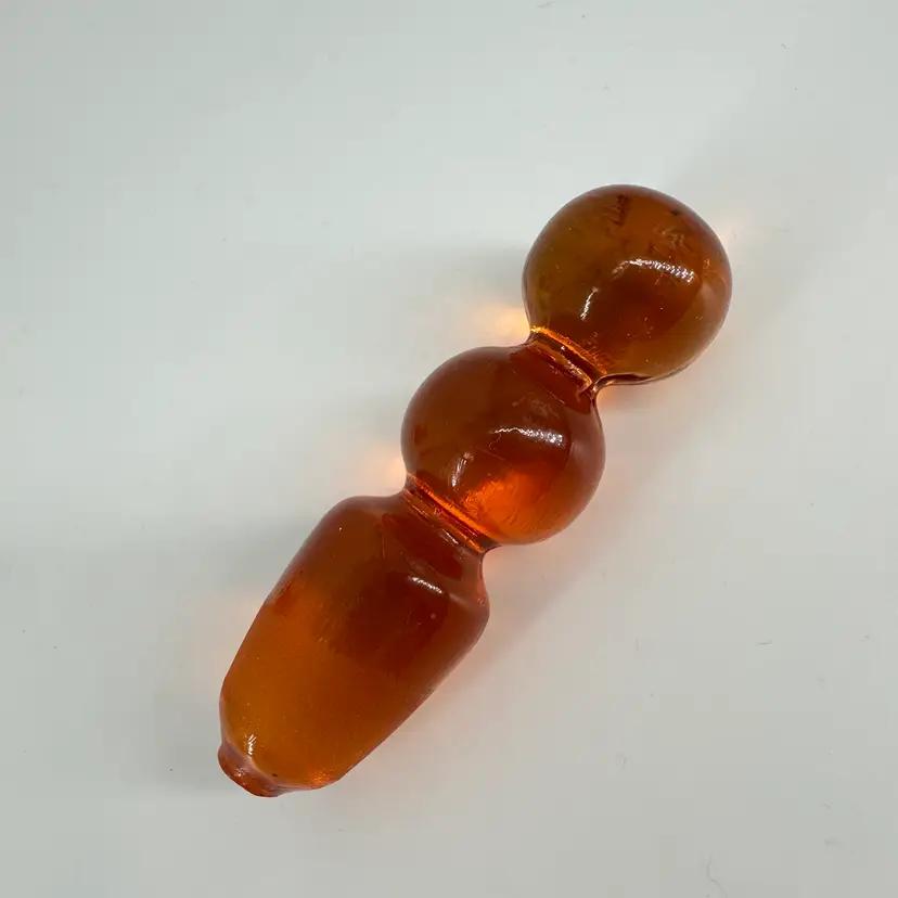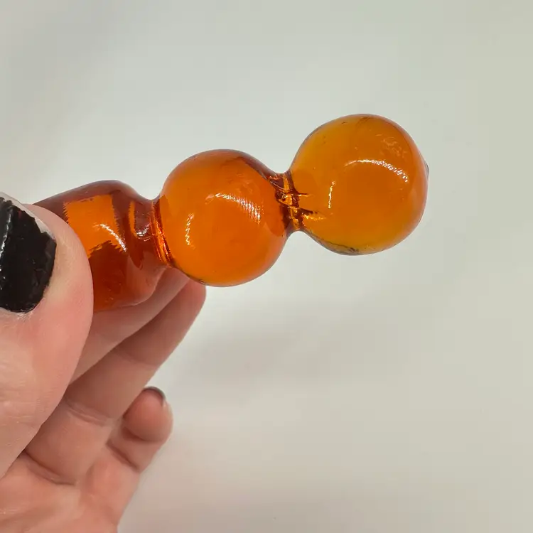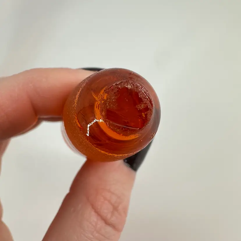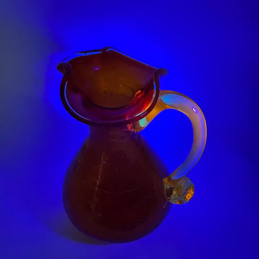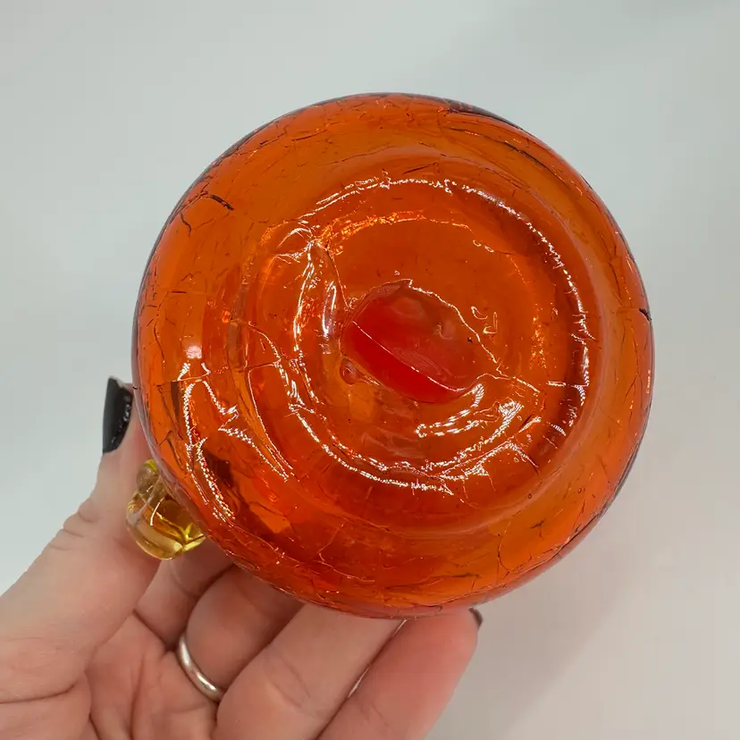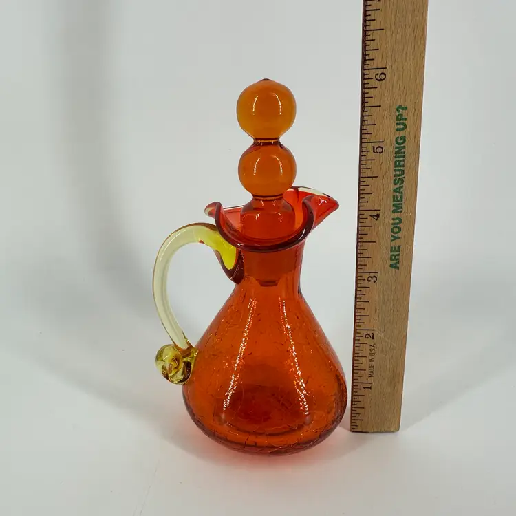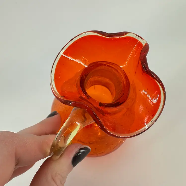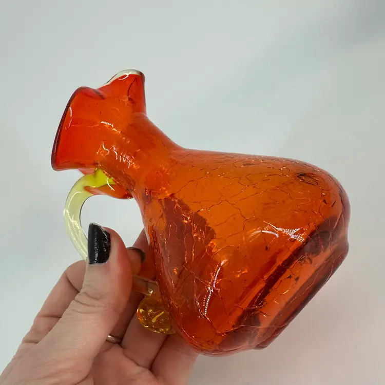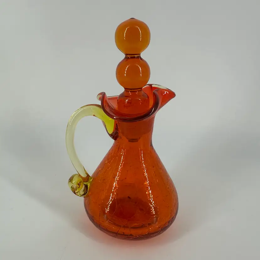 Orange crackle glass pitcher with pinched rim and fancy applied handle. Handle and rim glow under UV light. No chips, accidental cracks, or signatures. Stopper has some manufacturing flaws as well as small chips around bottom edge. Measures approximately 4.25” tall. Pontil scar on bottom.