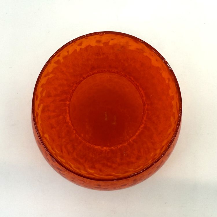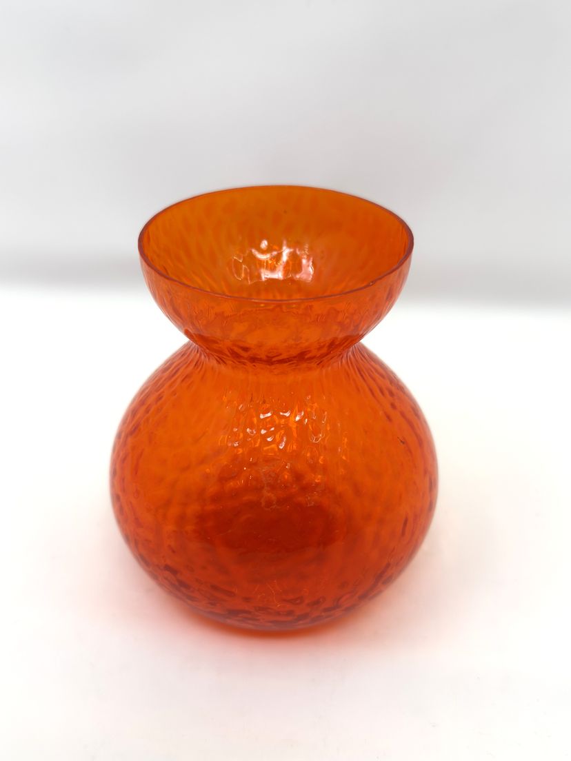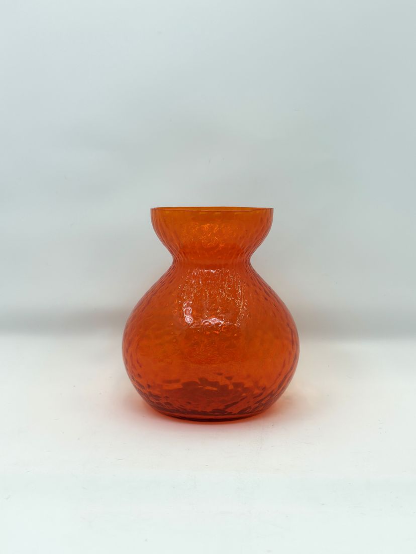 Add a bold pop of color to any space with this mid-century Scandinavian-style bulb vase. Its textured, hammered glass glows a warm yellow-orange under UV light—classic cadmium glass from the 1930s–1960s.