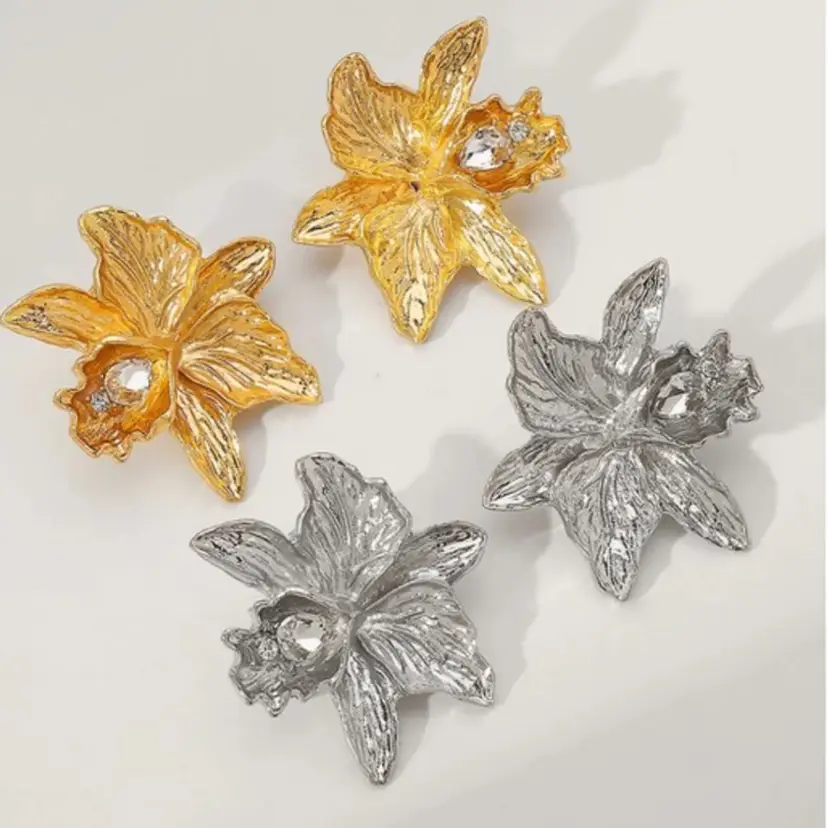 Unique orchid flower shape with intricate petal detailing Sparkling gem adds luxe, eye-catching finish Lightweight despite bold size – comfortable for all-day wear Two finishes to match your vibe: radiant gold or cool silver Styling Tip: