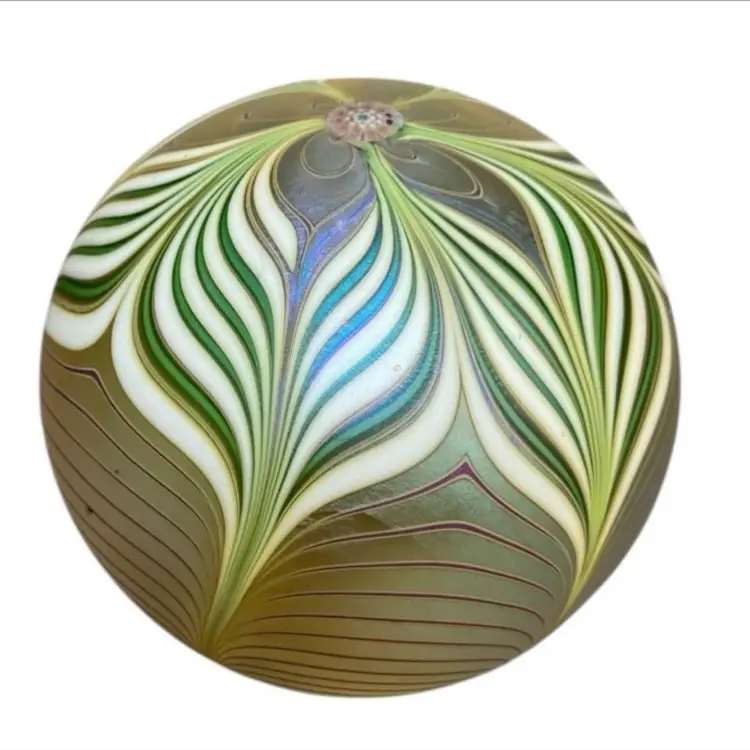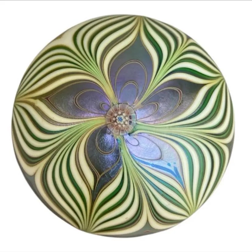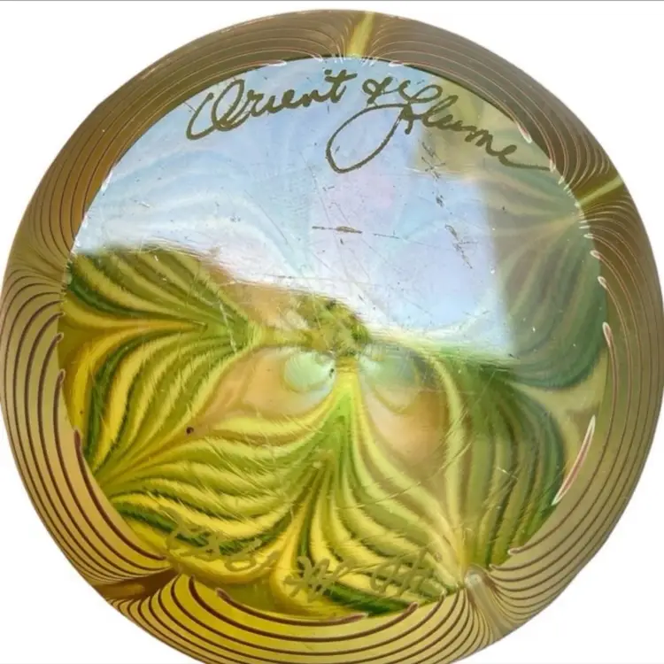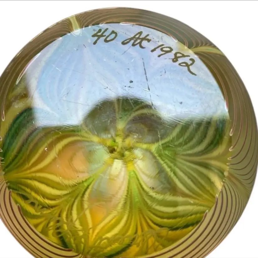 Stunning magnum Orient & Flume vaseline glass pulled-feather paperweight, signed and dated 1982. This is one of those big, early O&F pieces collectors hunt for heavy in the hand, glowing fiercely under UV, and showcasing the classic multi-layer pulled-feather design that made their early work famous.