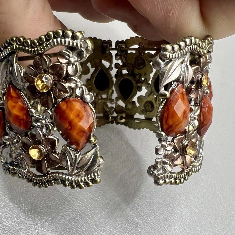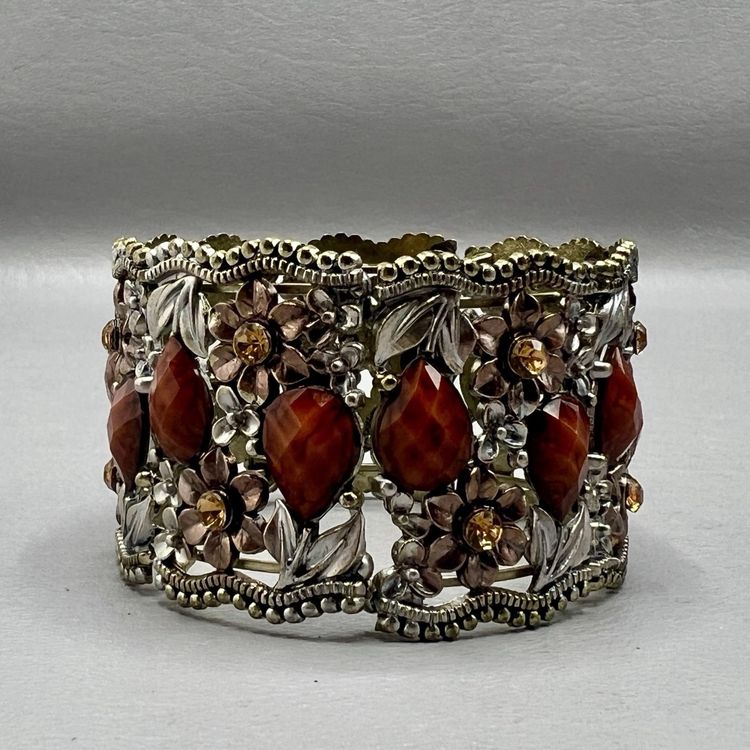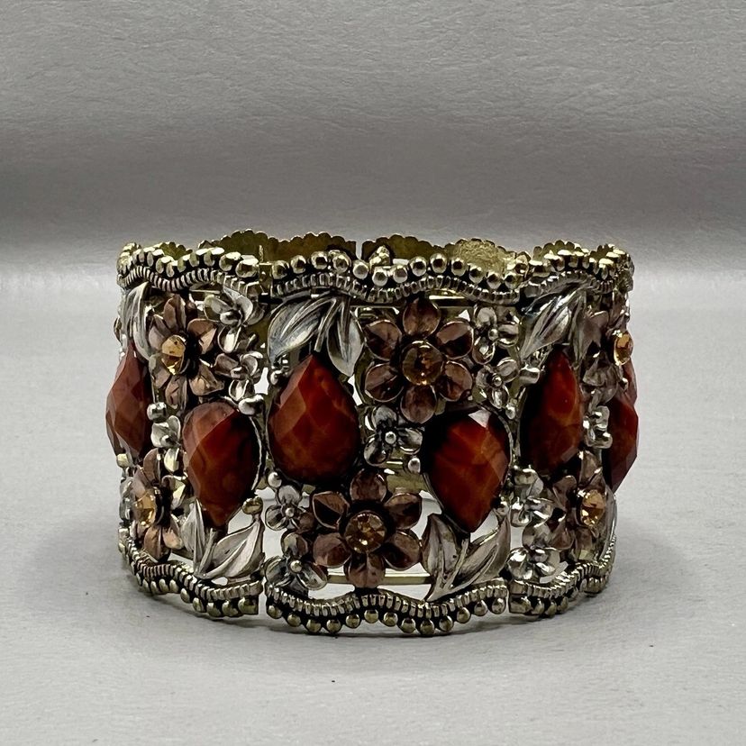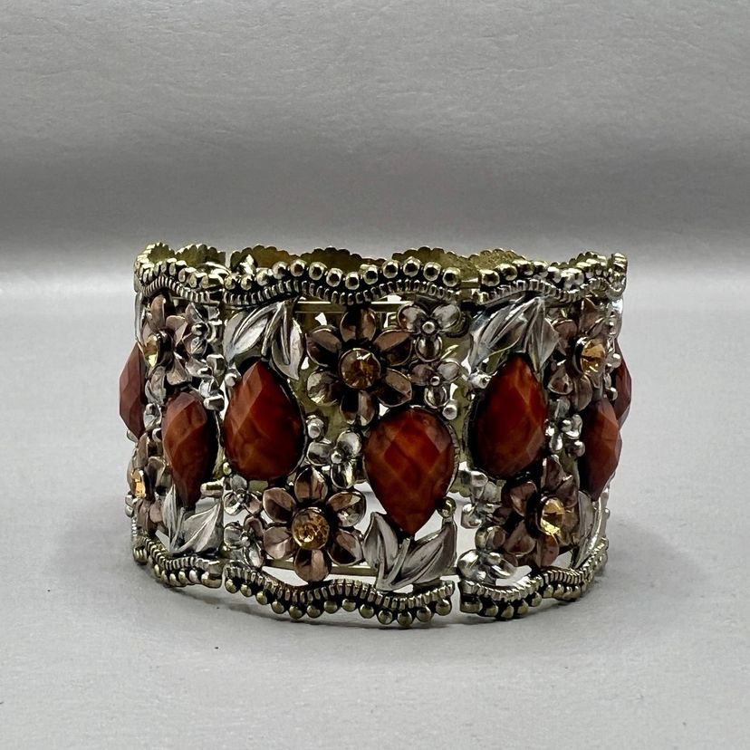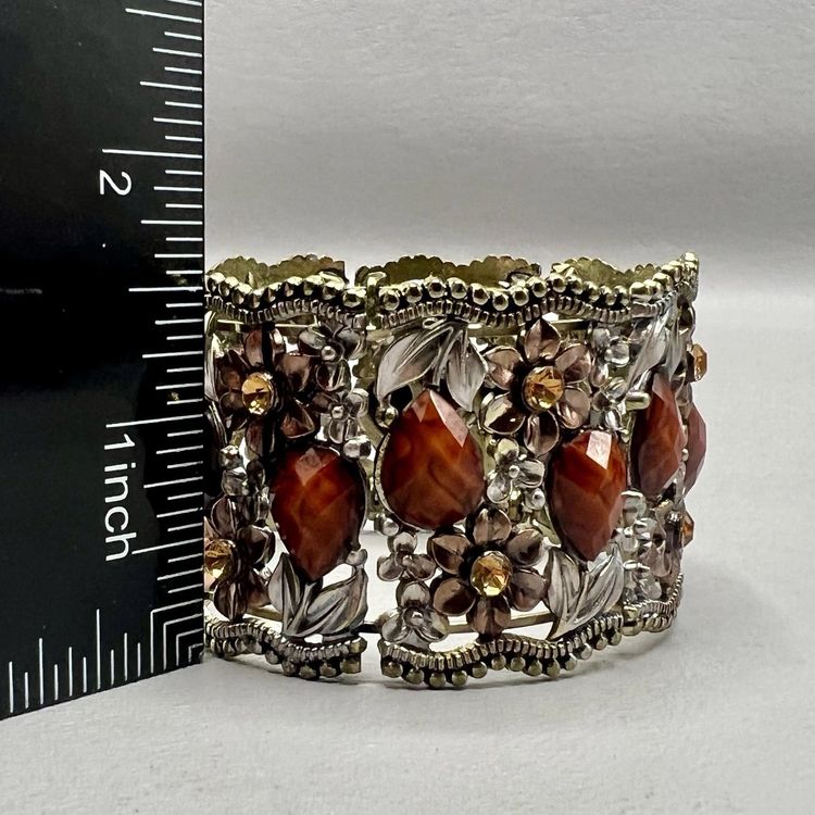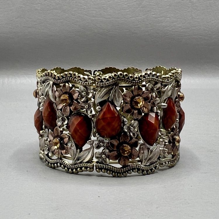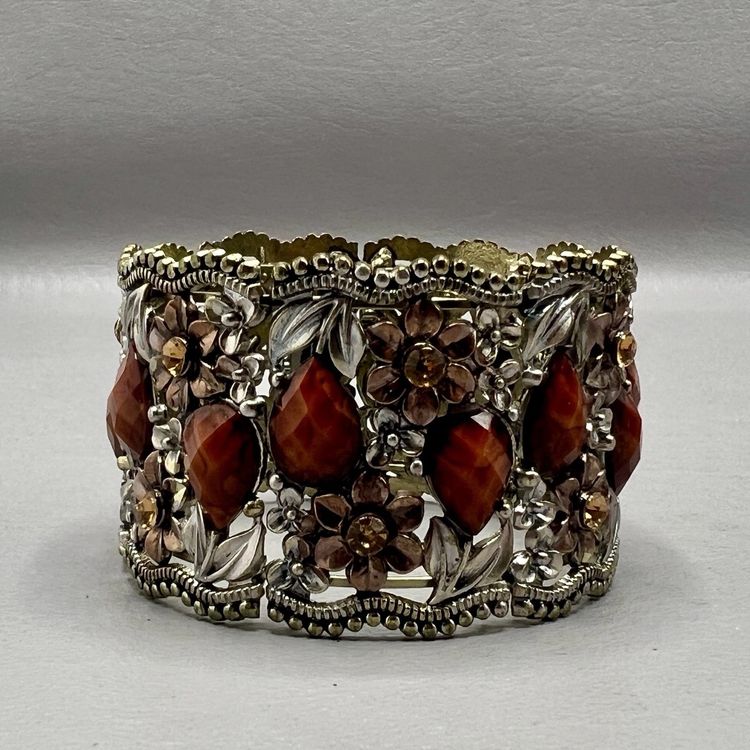Ornate Silver Tone Wide Cuff Bracelet Amber Faceted Rhinestones Flowers 2.5" 1.5" Wide